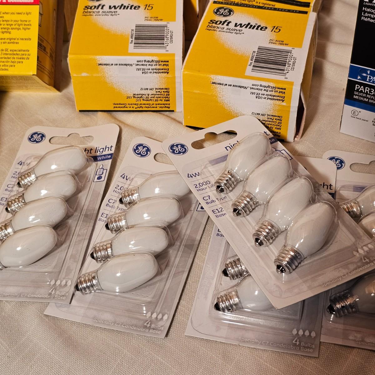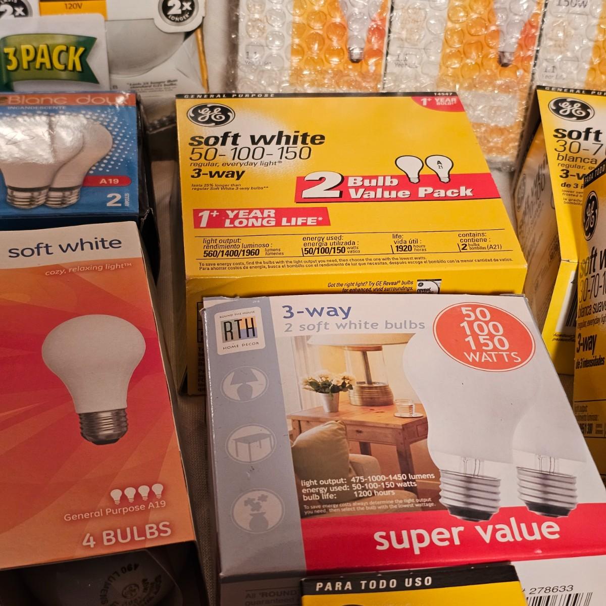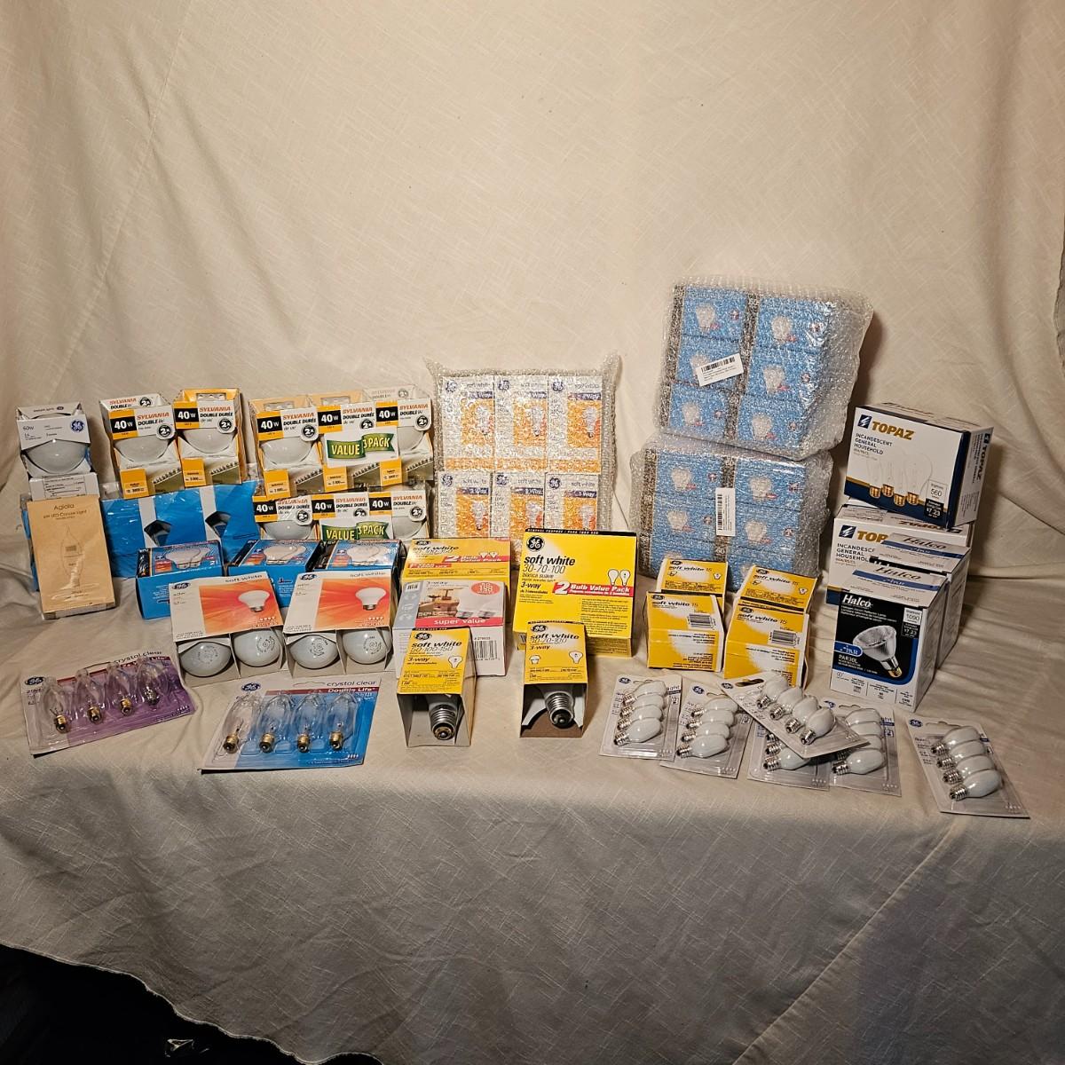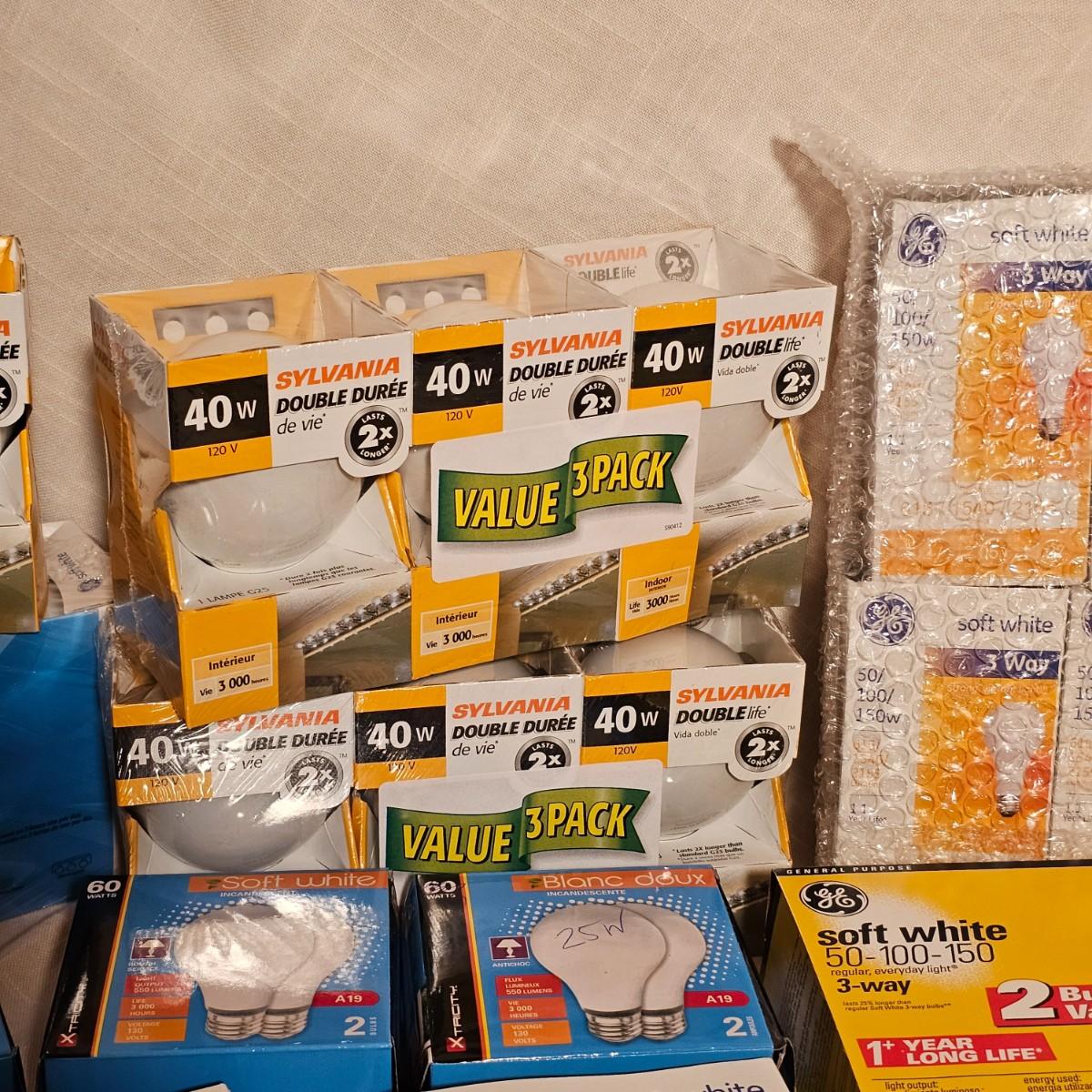 Lots and lots of bulbs. Standard incandescent, three-way bulbs, reflector floods and more. Most items are standard base but a few with candelabra bases. See photos for details. Shipping available.