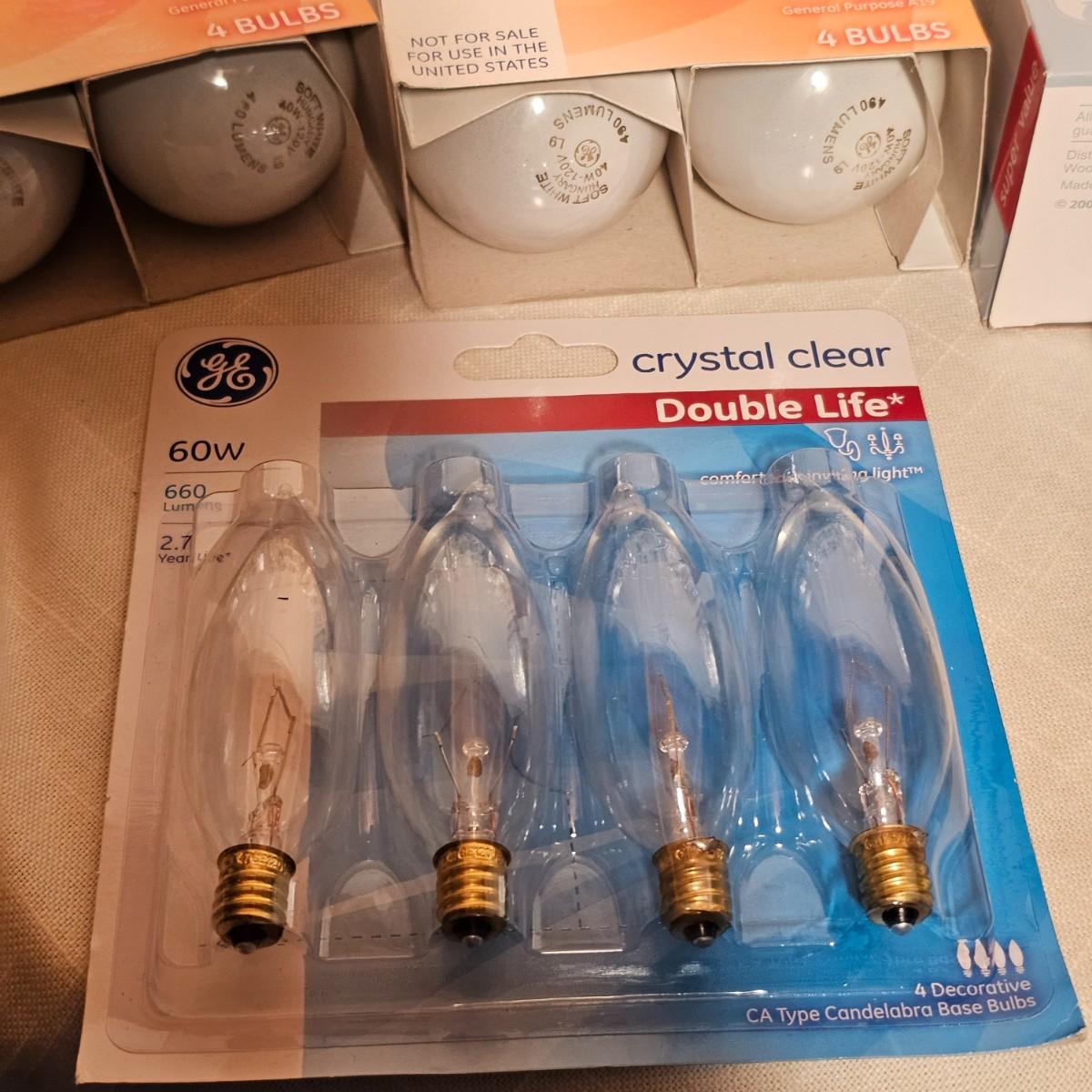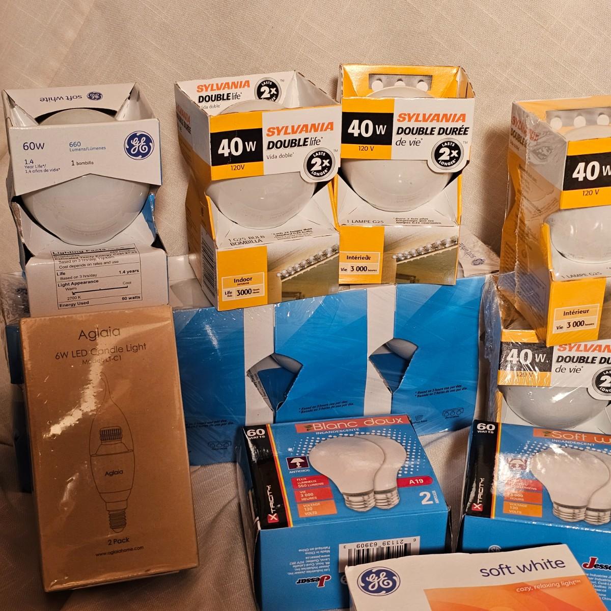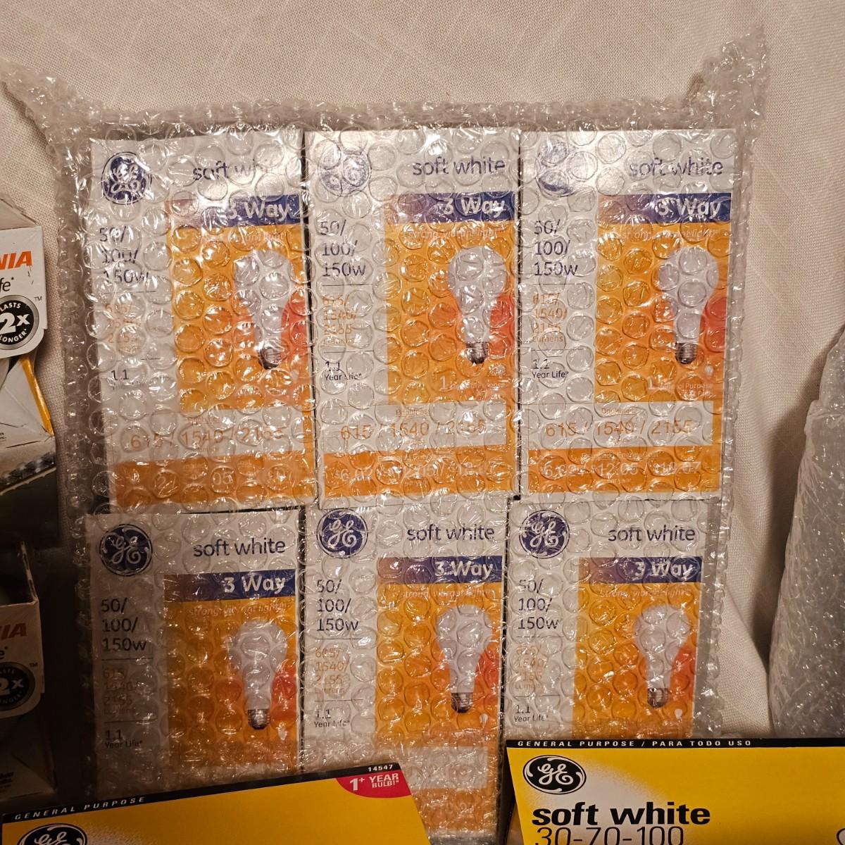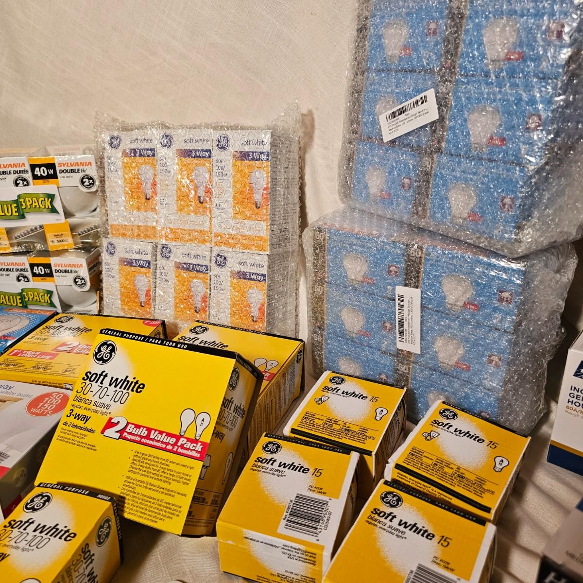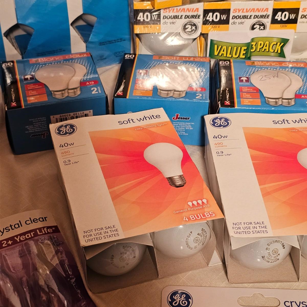 Lots and lots of bulbs. Standard incandescent, three-way bulbs, reflector floods and more. Most items are standard base but a few with candelabra bases. See photos for details. Shipping available.