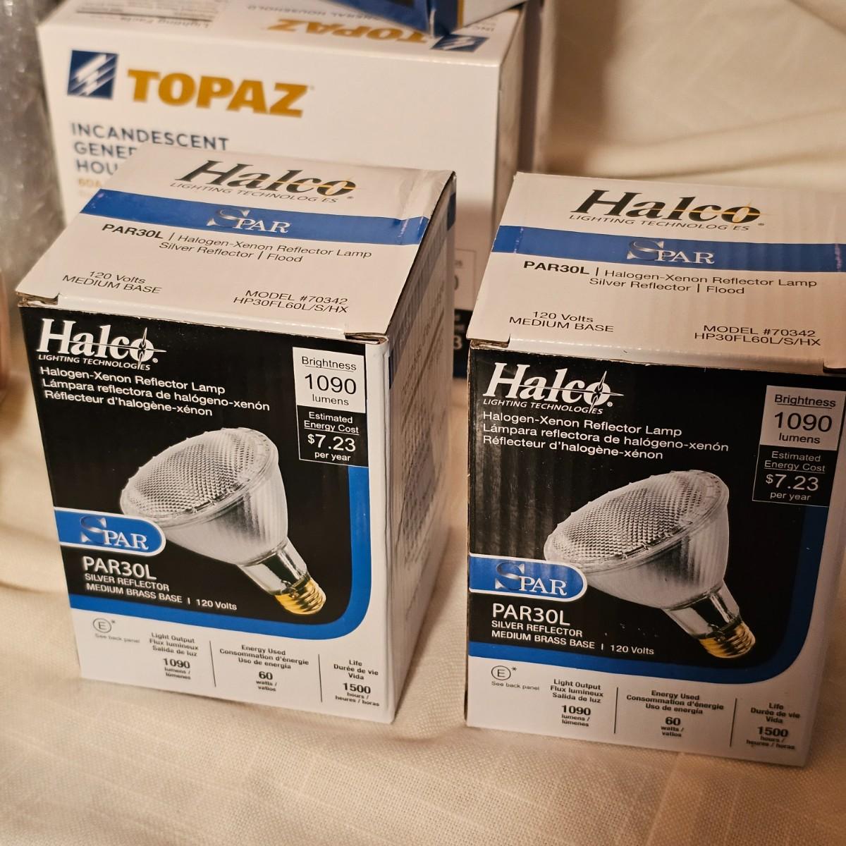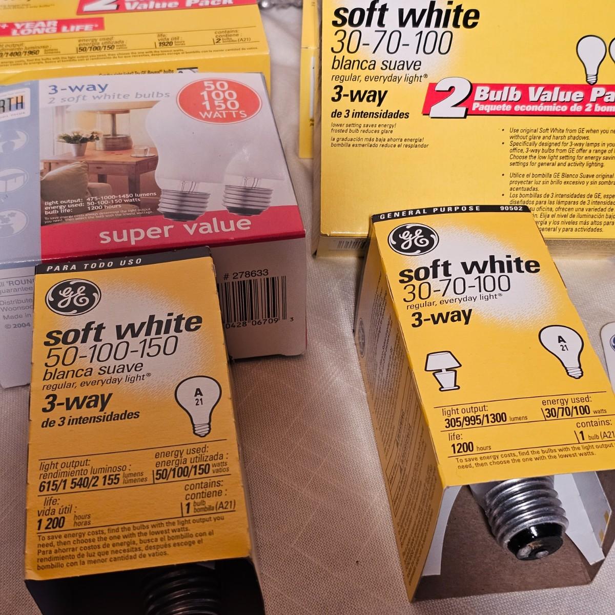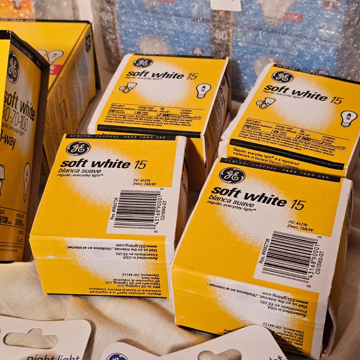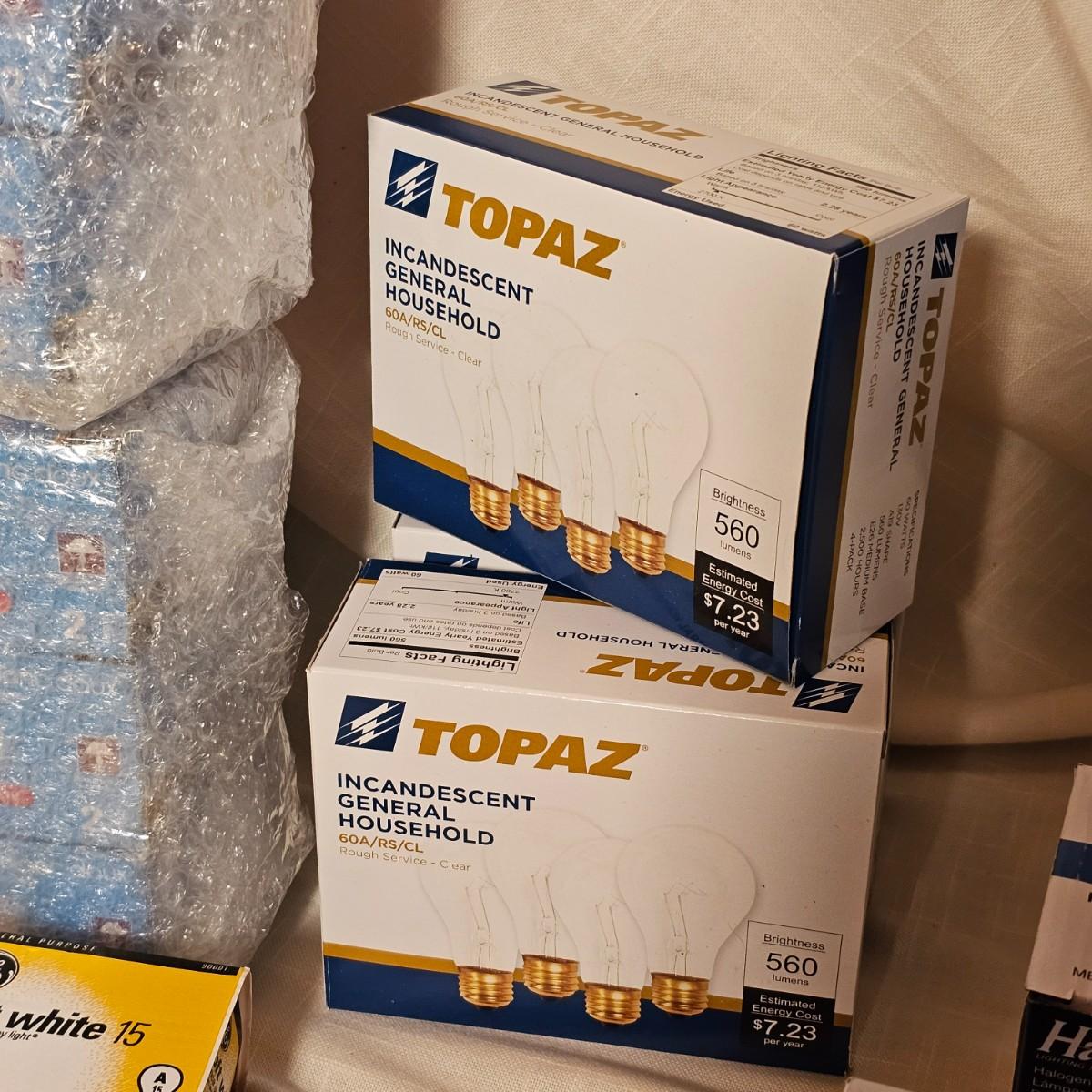 Lots and lots of bulbs. Standard incandescent, three-way bulbs, reflector floods and more. Most items are standard base but a few with candelabra bases. See photos for details. Shipping available.