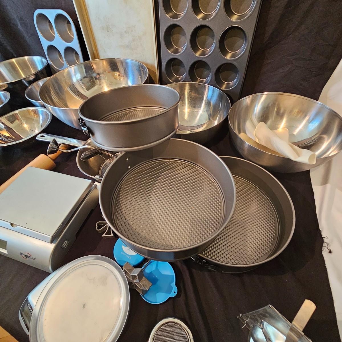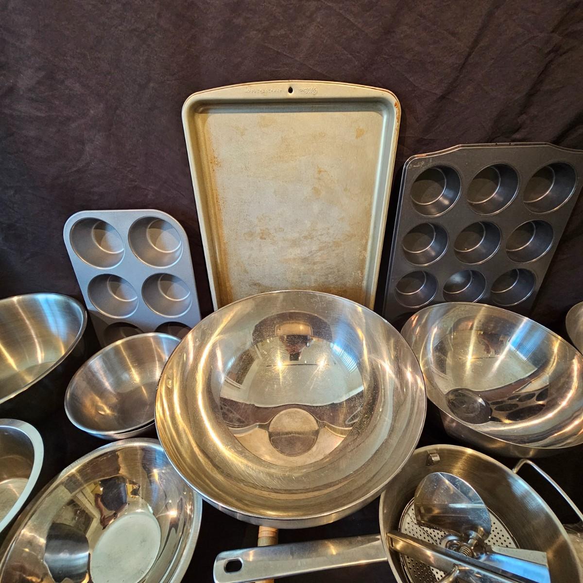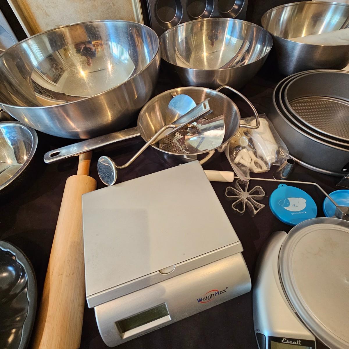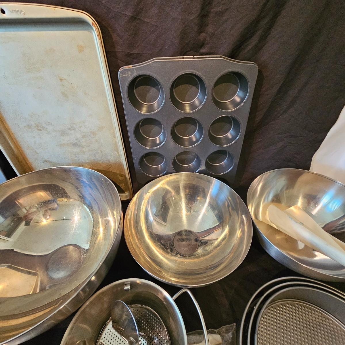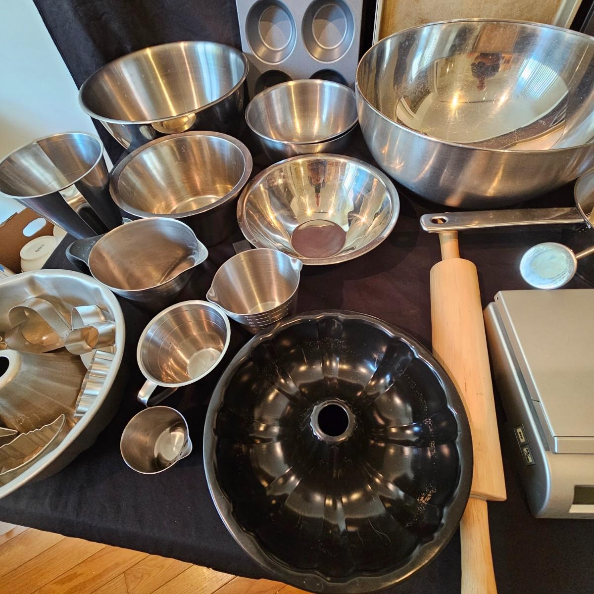 Large collection of mostly stainless bowls, measuring cups, Baking trays and more. Items by Wilton, Ikea, Escali, others. Largest round bowl is. 14"D x 6.5"H. Wilson tray is 11" x 17". Large spring pan is 10.5" D x 3"H. Large bundt pan is 10"D x 3.5"H. Rolling pin is 10". Two scales are battery powered but untested. See photos for details. Local pickup only.