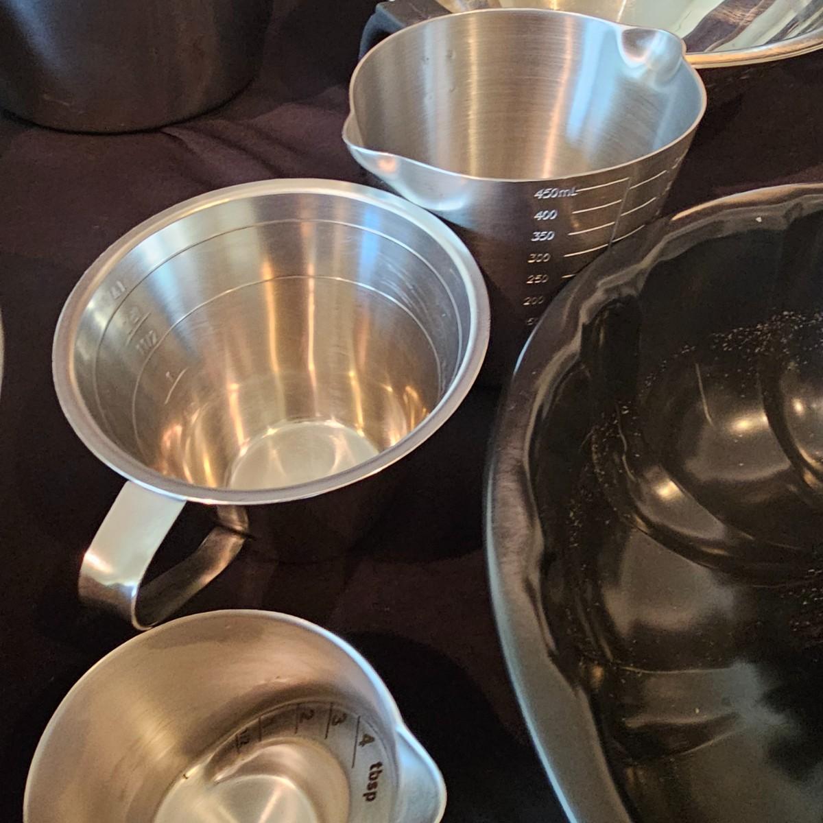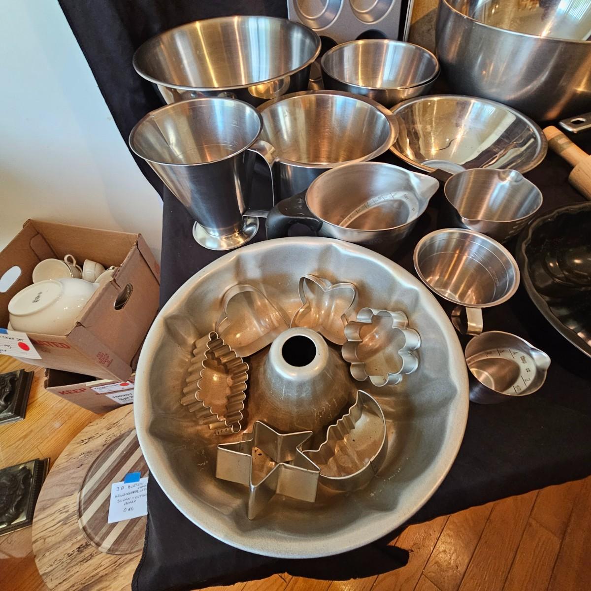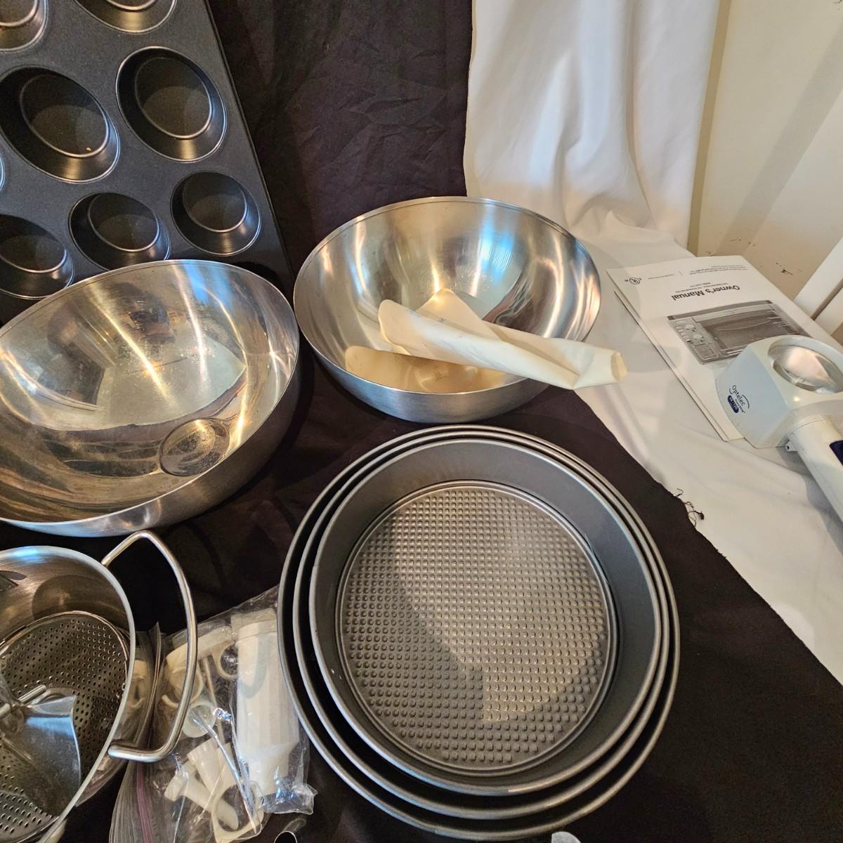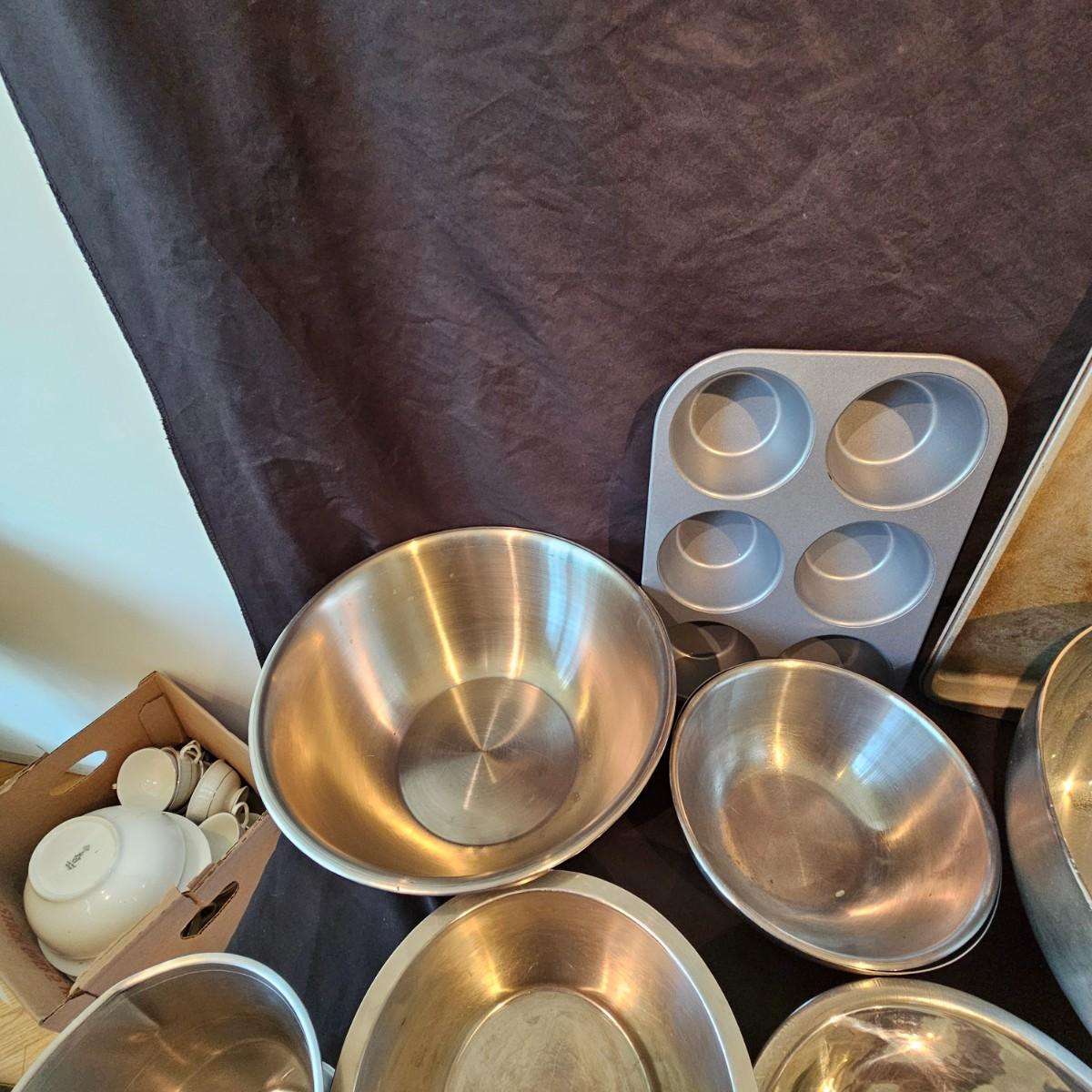 Large collection of mostly stainless bowls, measuring cups, Baking trays and more. Items by Wilton, Ikea, Escali, others. Largest round bowl is. 14"D x 6.5"H. Wilson tray is 11" x 17". Large spring pan is 10.5" D x 3"H. Large bundt pan is 10"D x 3.5"H. Rolling pin is 10". Two scales are battery powered but untested. See photos for details. Local pickup only.