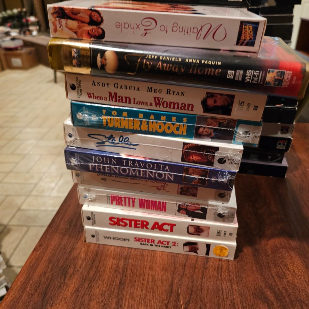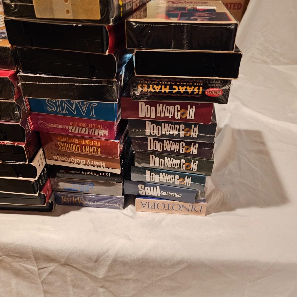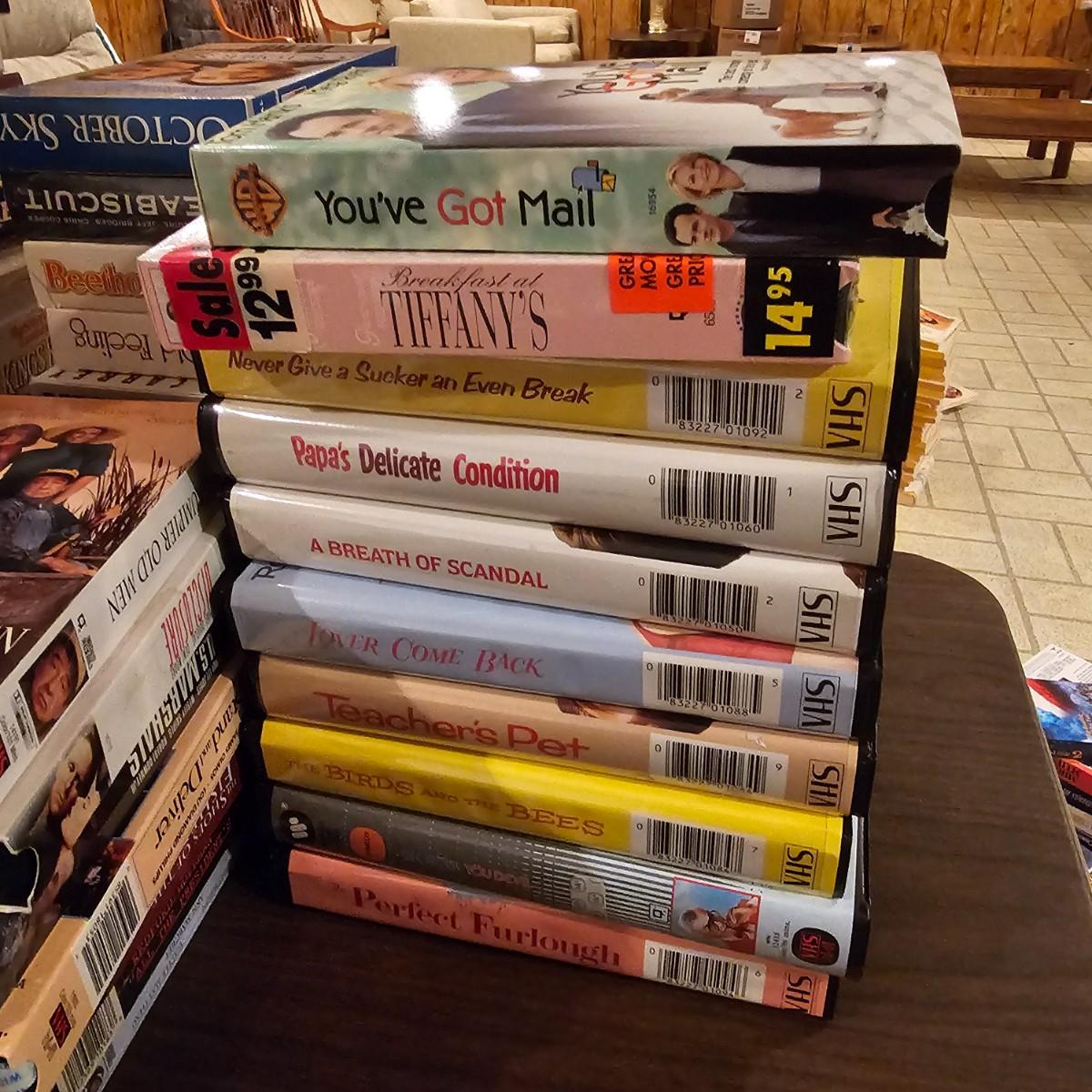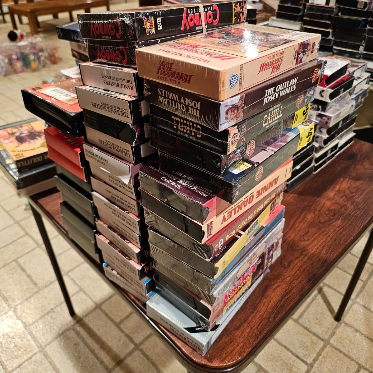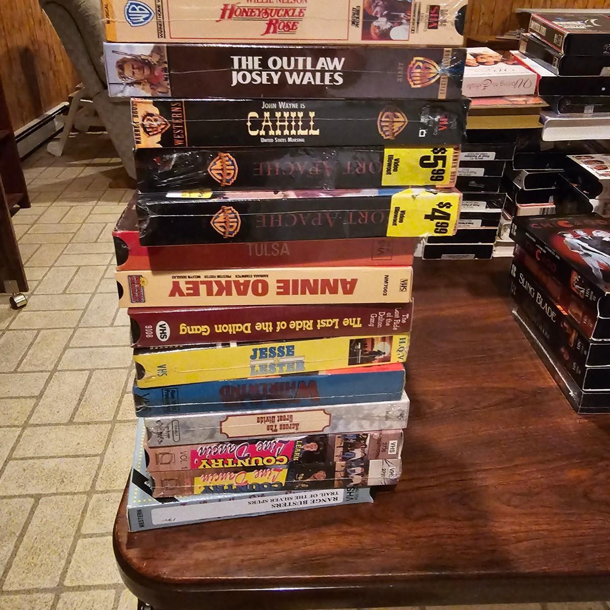Videos, videos, videos! Over 375 VHS tapes, some still new in package. Westerns, comedy, suspense, holiday, classics and more. Many tapes are in original packages. Twelve boxes of fun and enjoyment for all. See photos for details. Local pickup only.