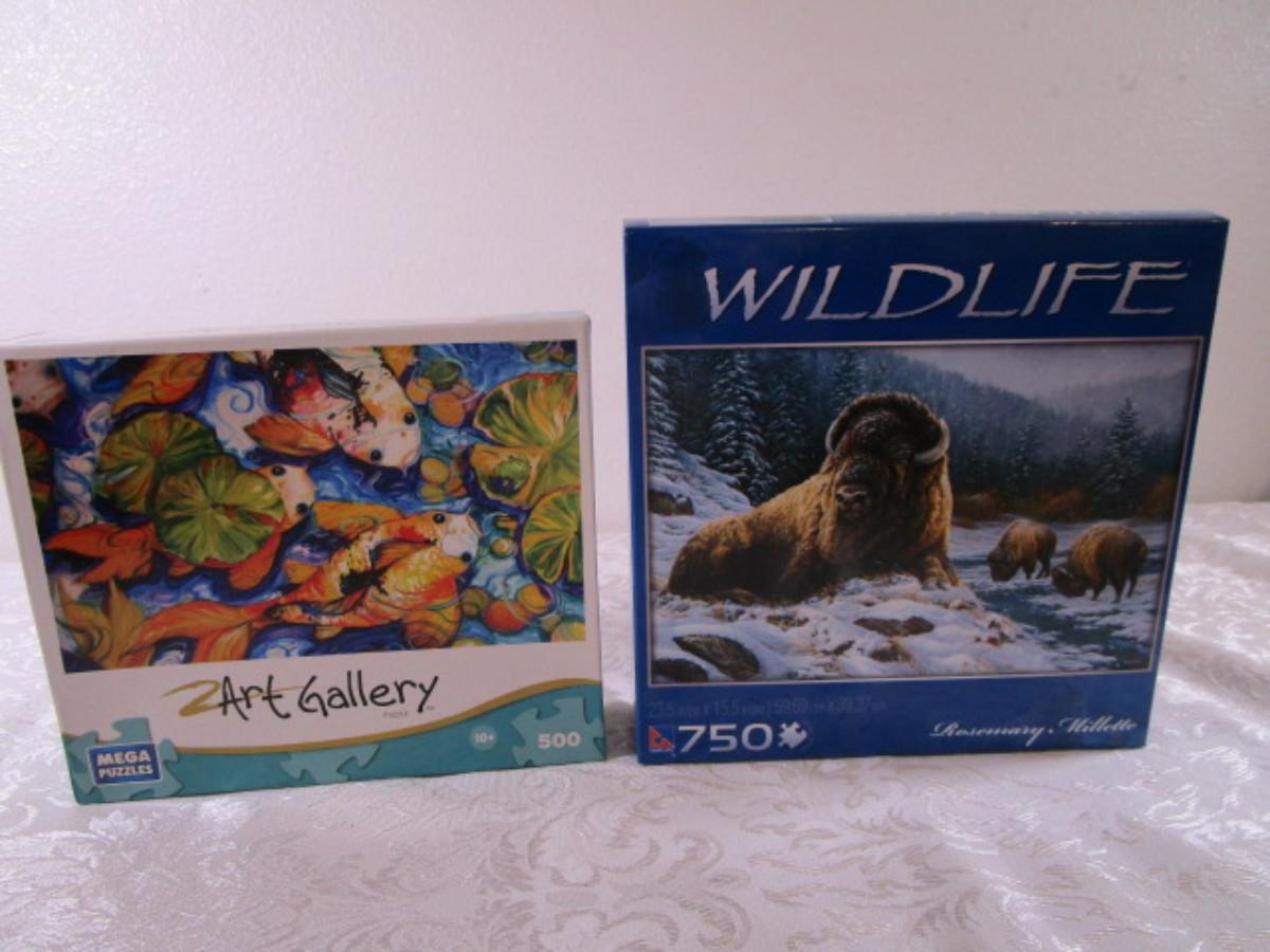 New & unopened, Buffalo puzzle is 750 pieces, the Coy fish puzzle is 500 pieces