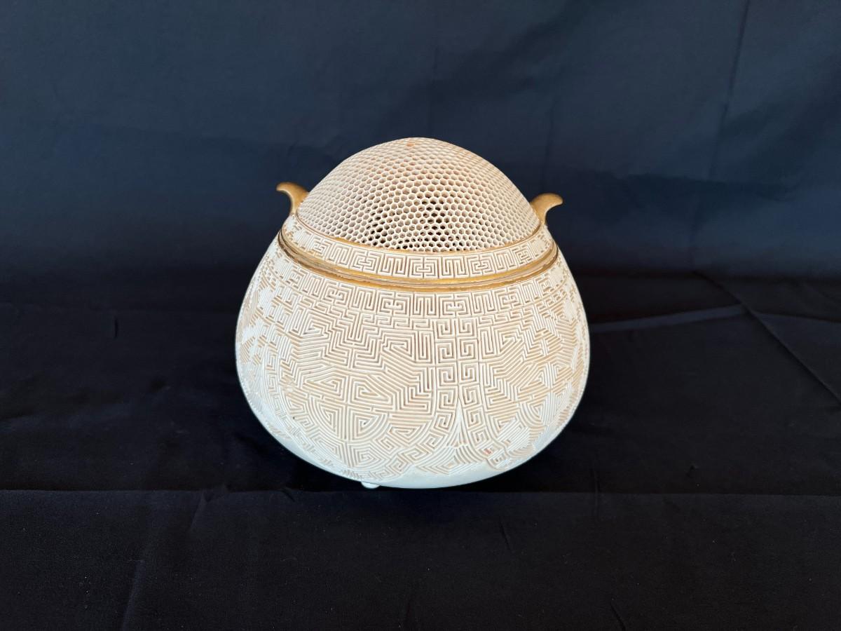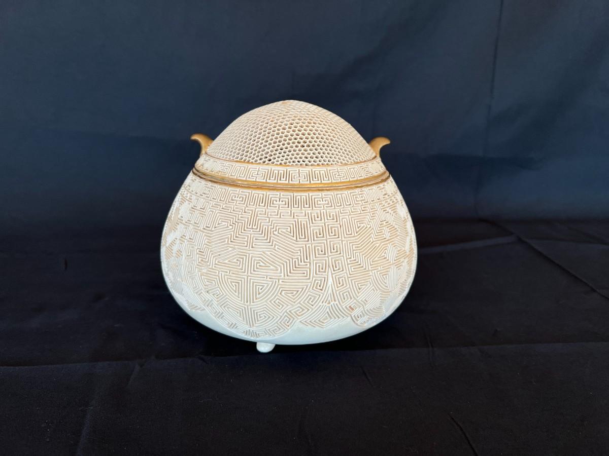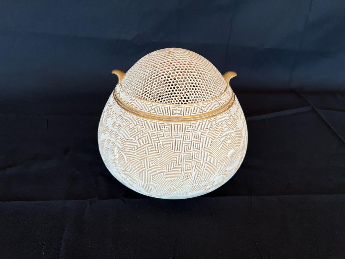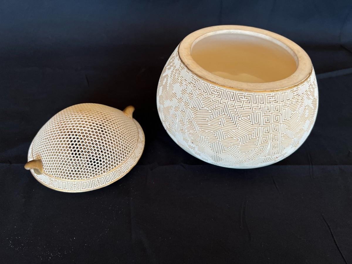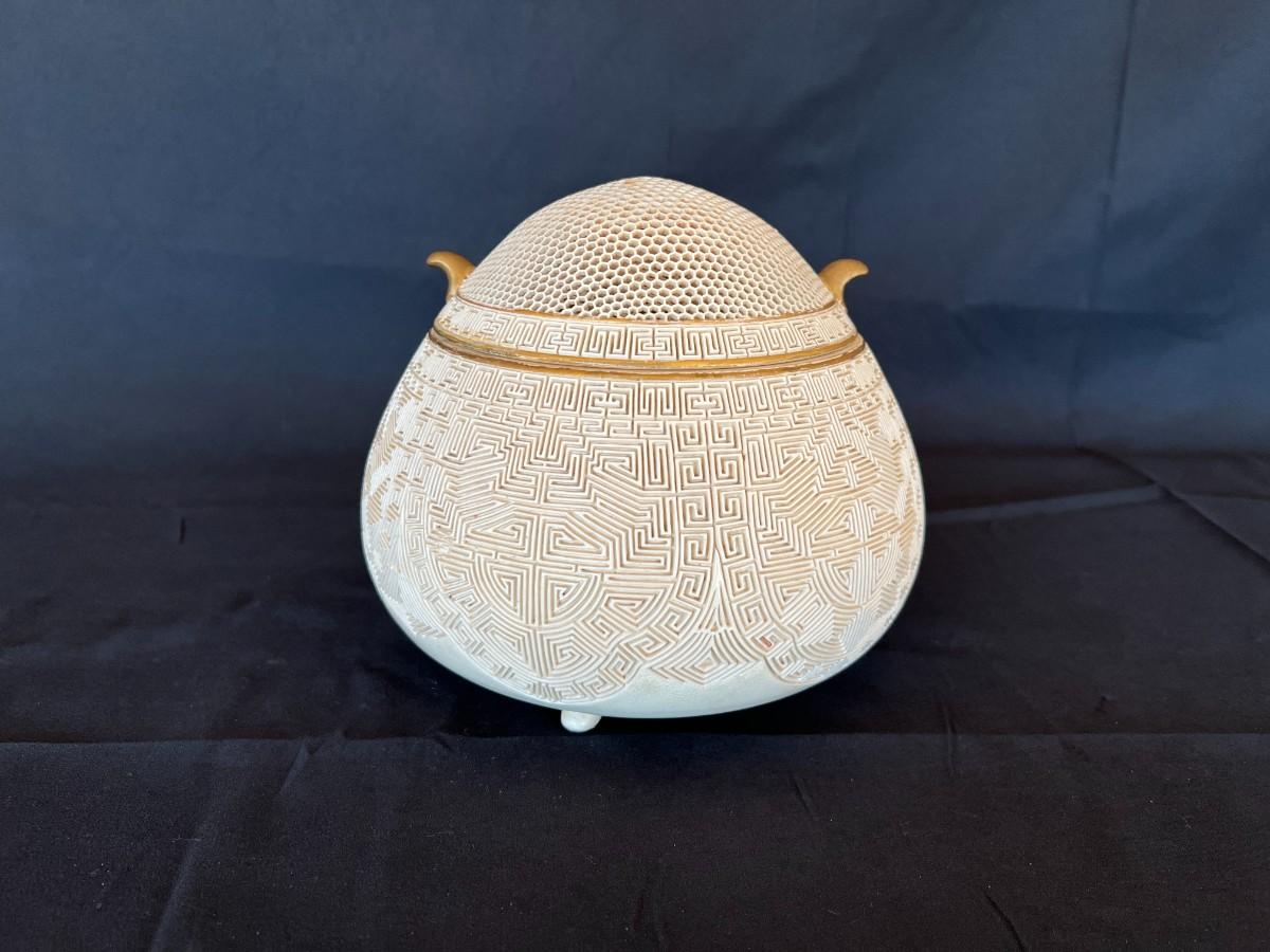 Very rare and extraordinarily intricate design on this Japanese satsuma incense burner. Stamped by maker. Lid features a honeycomb reticulated double wall design (very high levels of craftsmanship). Gilt gold painted on edges of lid and small handles. This piece was evaluated in 1992 by Honeychurch Antiques gallery in Seattle, WA to be very rare piece of extremely fine design, and attributed to the Meiji Period circa 1880. In very good condition.