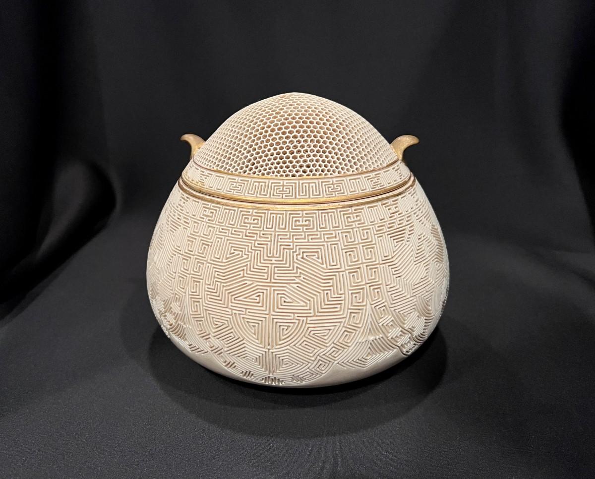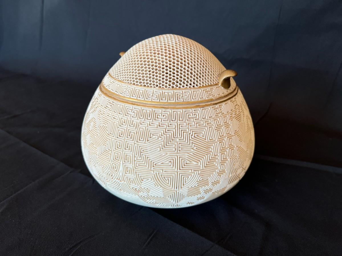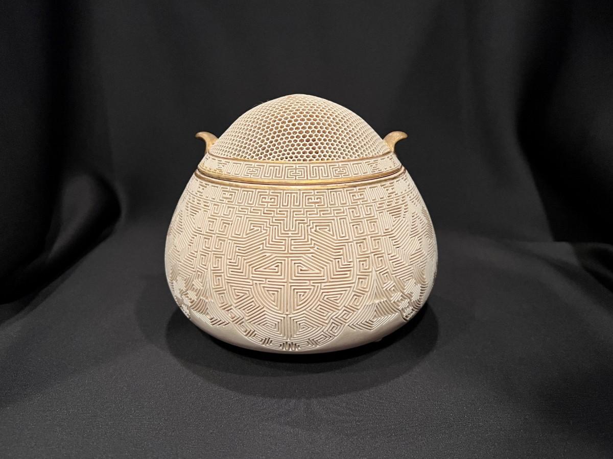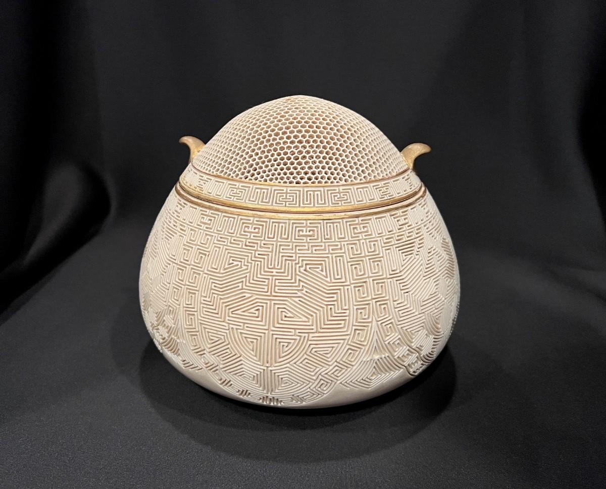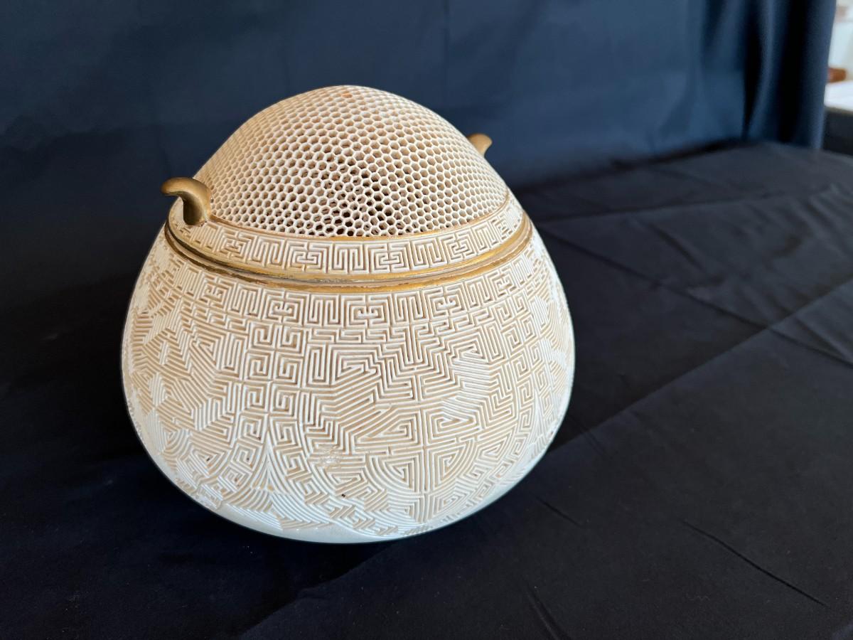 Very rare and extraordinarily intricate design on this Japanese satsuma incense burner. Stamped by maker. Lid features a honeycomb reticulated double wall design (very high levels of craftsmanship). Gilt gold painted on edges of lid and small handles. This piece was evaluated in 1992 by Honeychurch Antiques gallery in Seattle, WA to be very rare piece of extremely fine design, and attributed to the Meiji Period circa 1880. In very good condition.