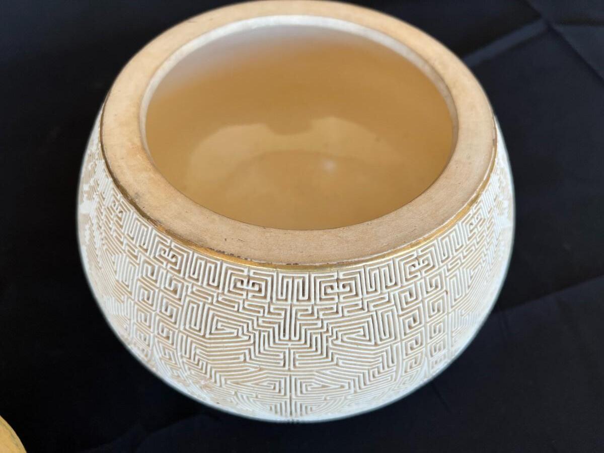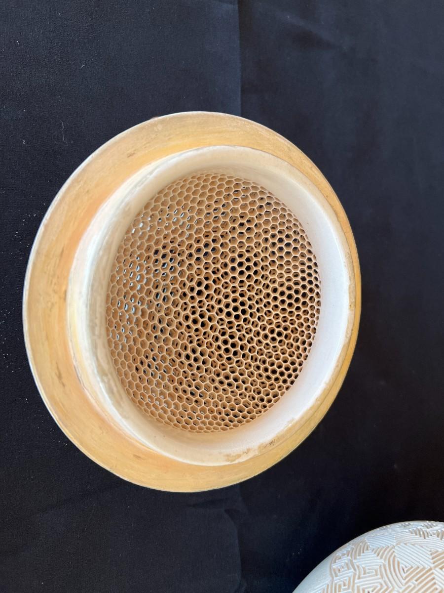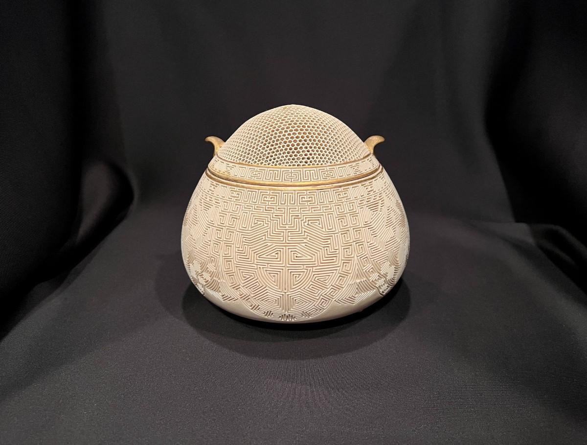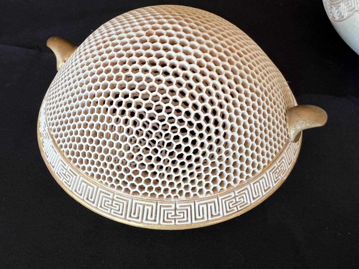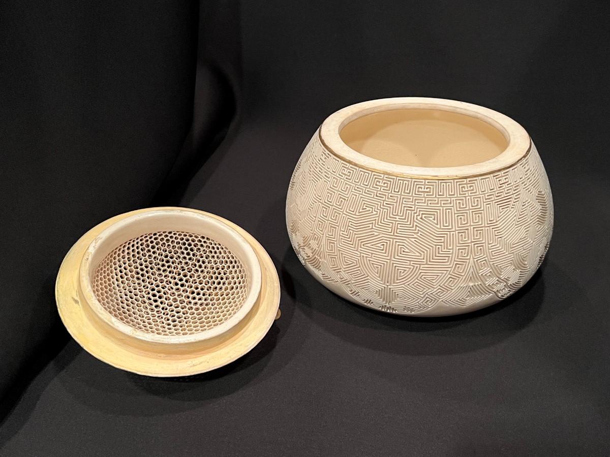 Very rare and extraordinarily intricate design on this Japanese satsuma incense burner. Stamped by maker. Lid features a honeycomb reticulated double wall design (very high levels of craftsmanship). Gilt gold painted on edges of lid and small handles. This piece was evaluated in 1992 by Honeychurch Antiques gallery in Seattle, WA to be very rare piece of extremely fine design, and attributed to the Meiji Period circa 1880. In very good condition.