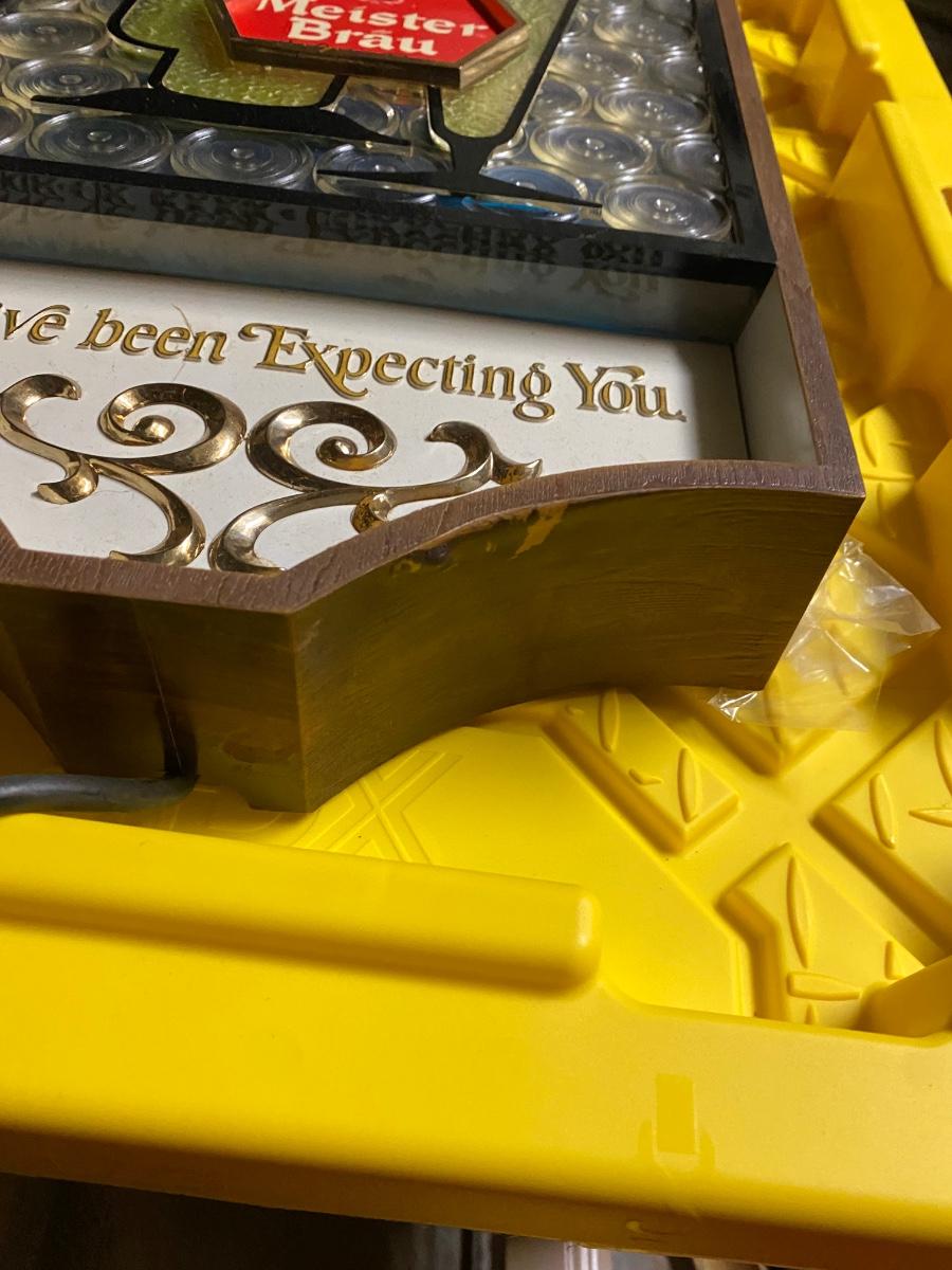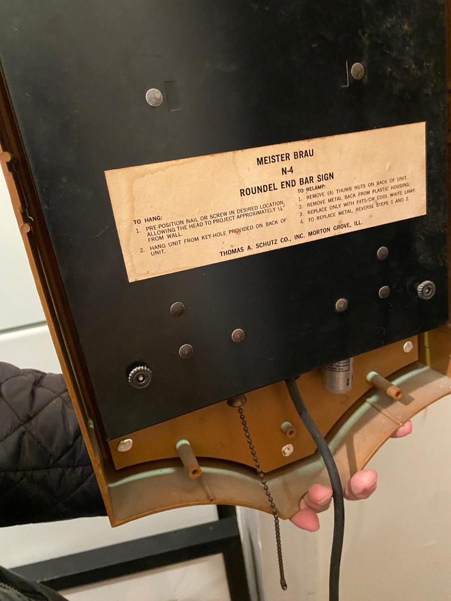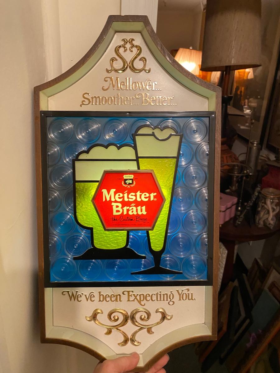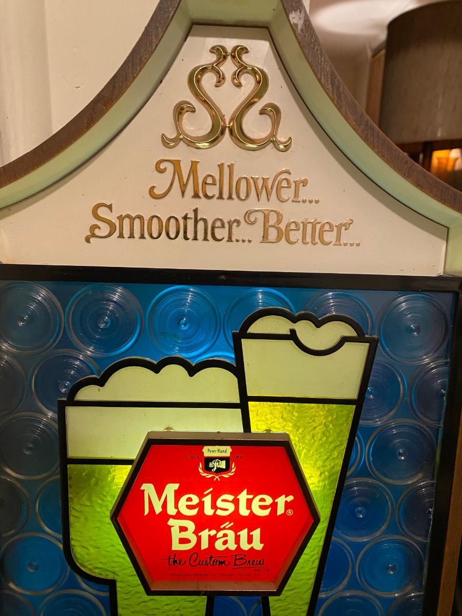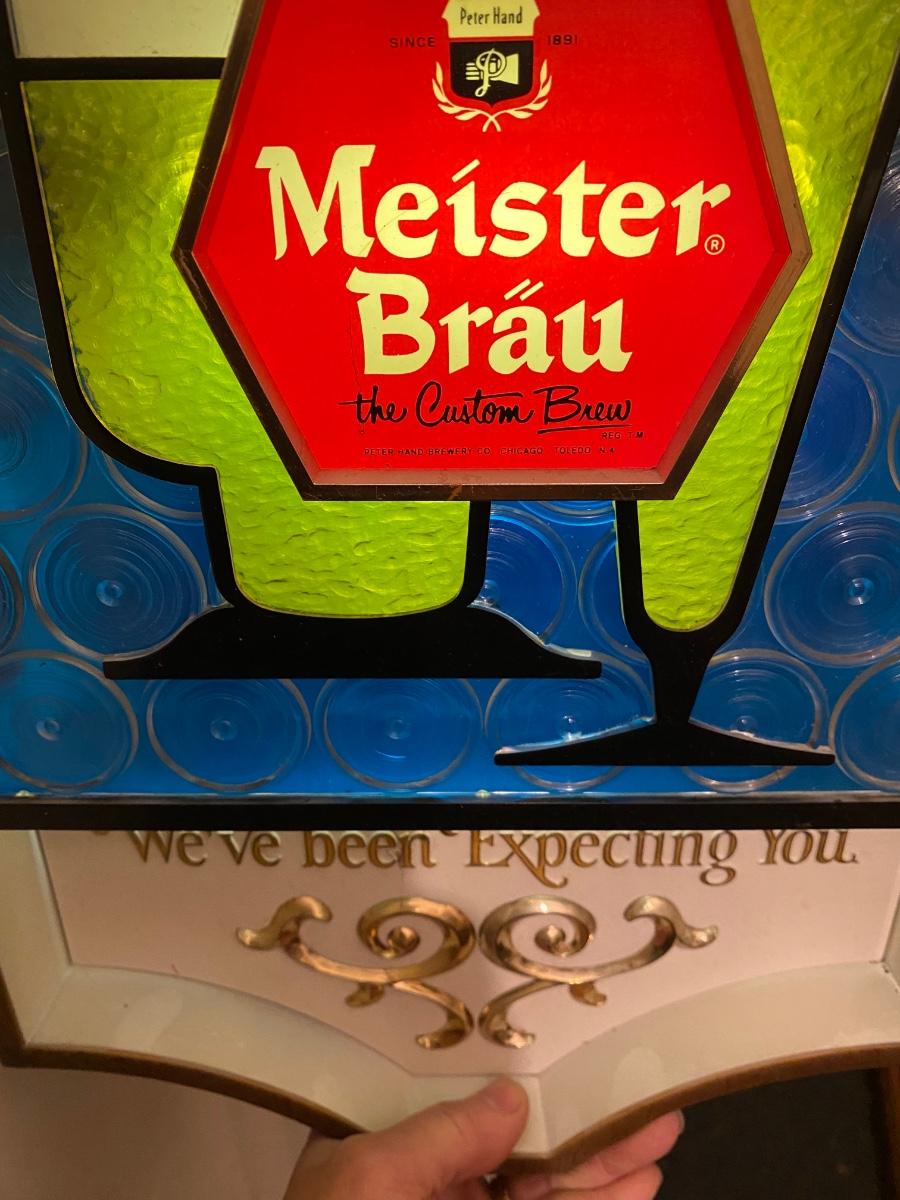 Vintage hangind Meister Brau light up bar sign. Some slight wear around edges but no cracks. 20" L x 10.5" W