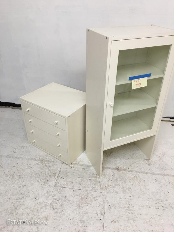 Melamine cabinet narrow w/drawers, doors. Lot#44