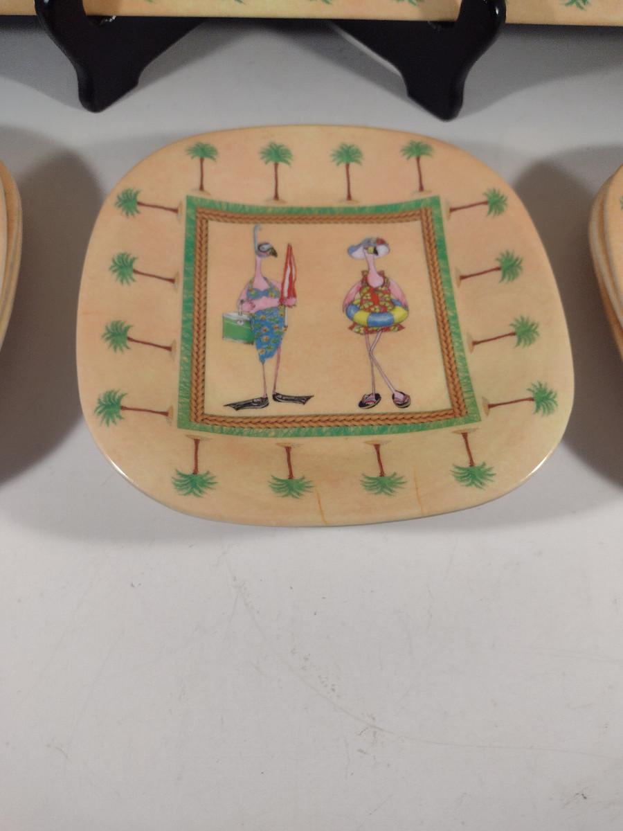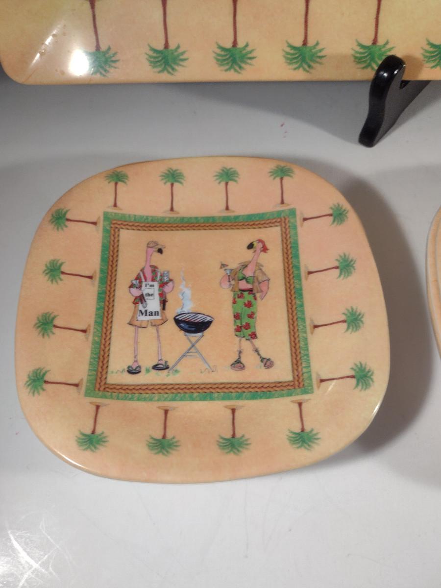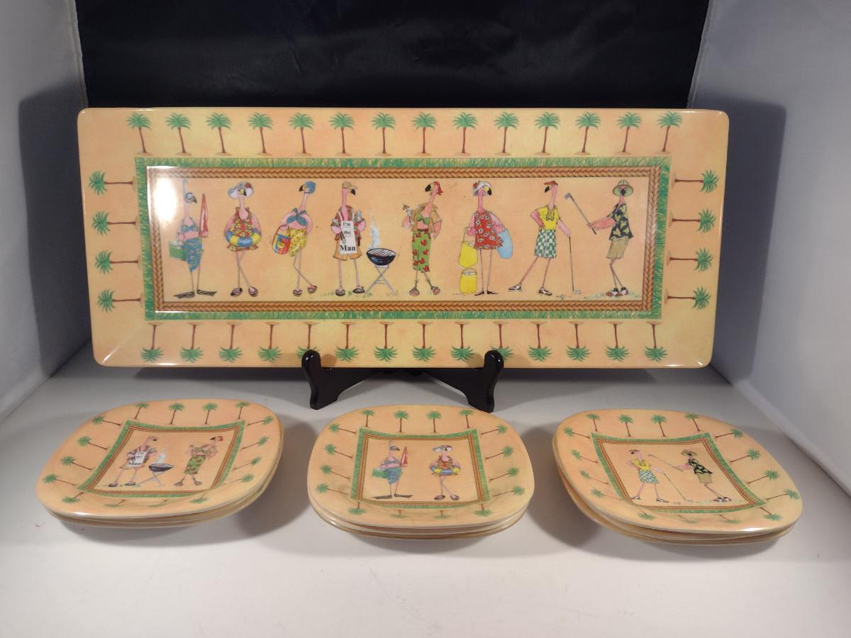 Melamine Appetizer Set with Flamingo Design- One Tray and Nine Small Plates. Small plates are three each of three designs.