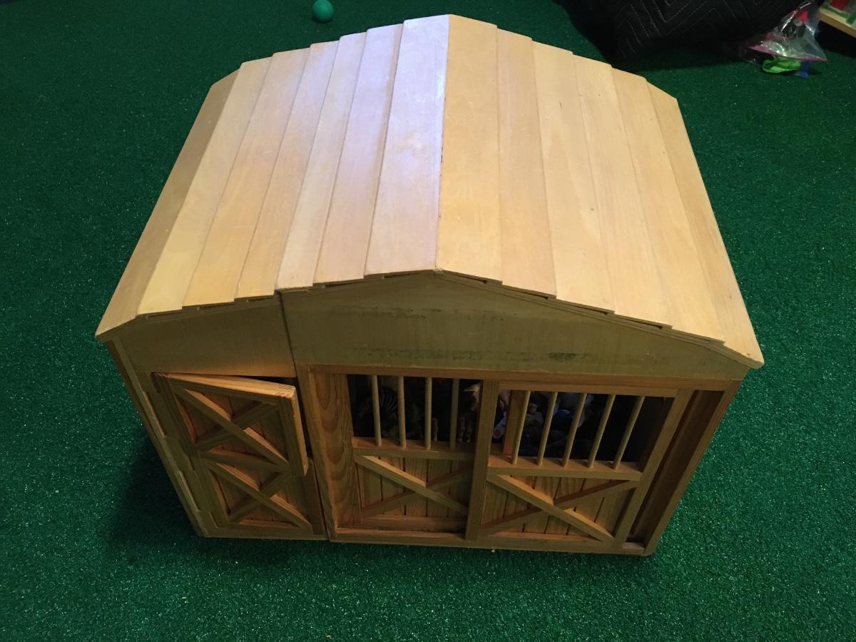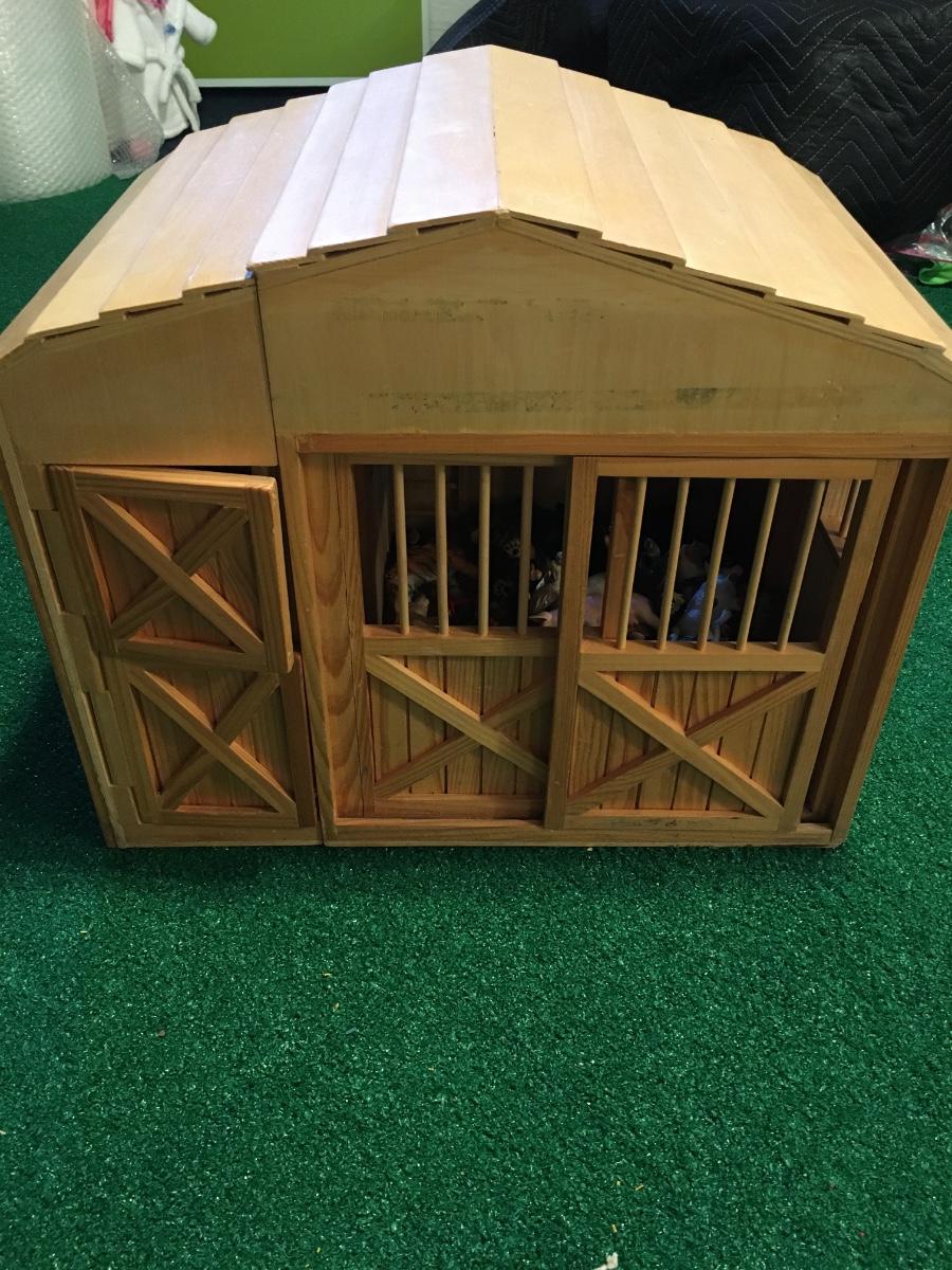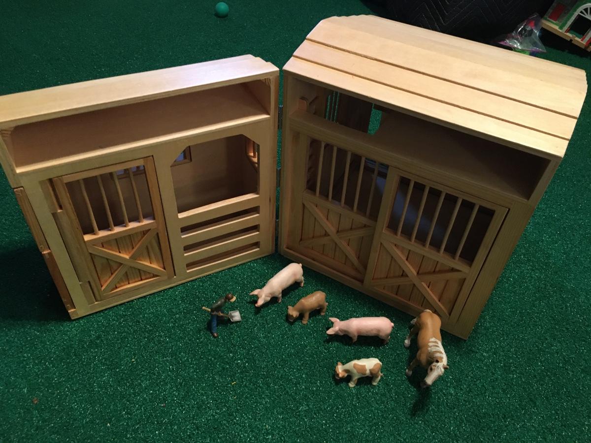 Fun wood barn with a farmer and a few barn animals. Opens up. Overall very good condition excpet for one misxing windo bar.