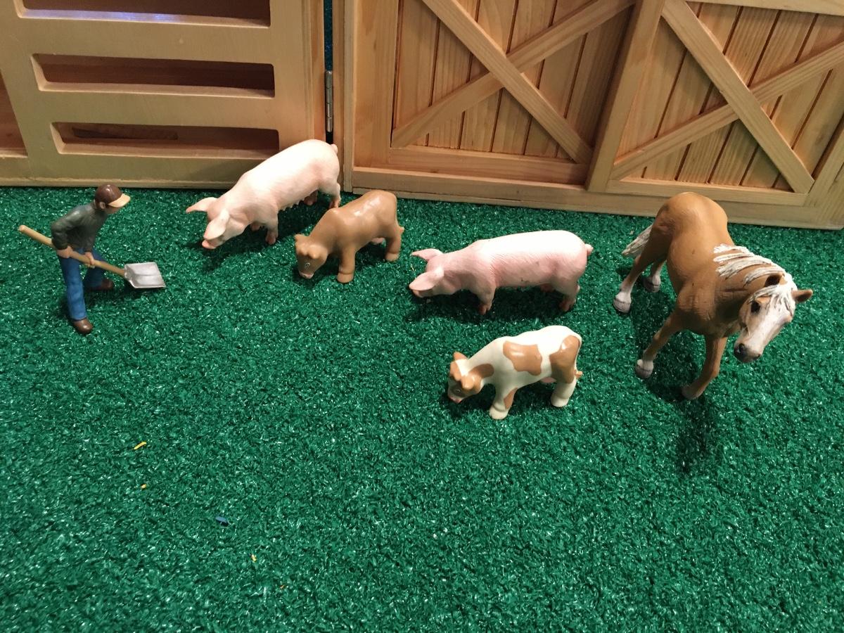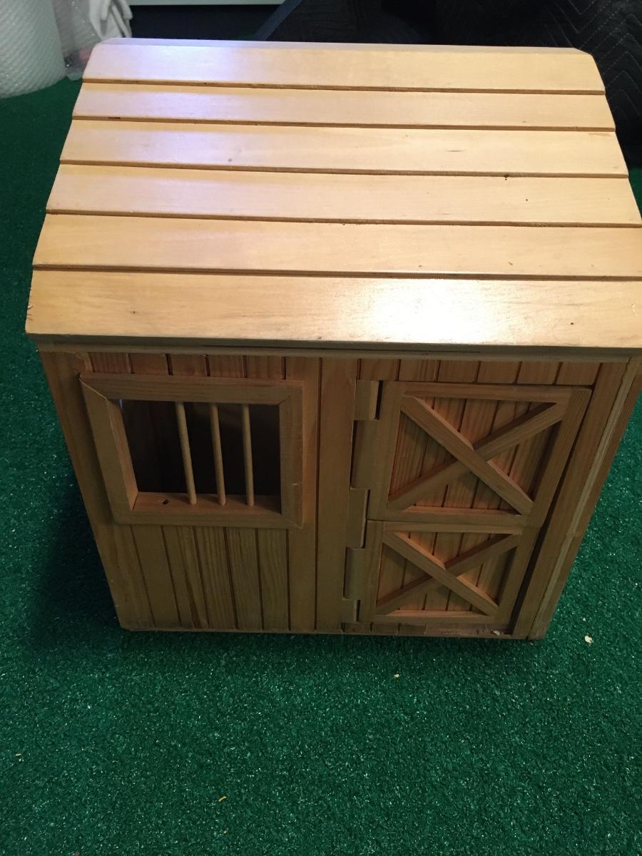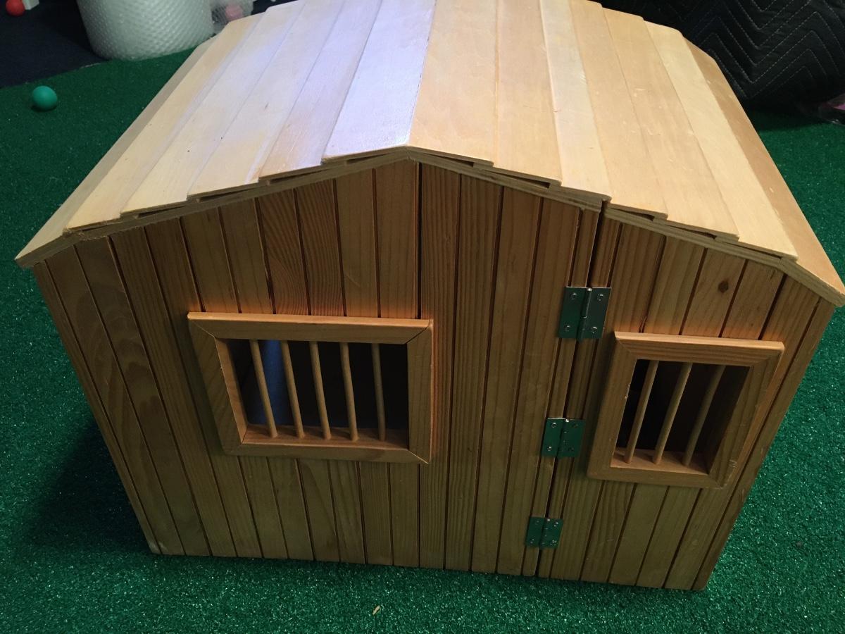 Fun wood barn with a farmer and a few barn animals. Opens up. Overall very good condition excpet for one misxing windo bar.