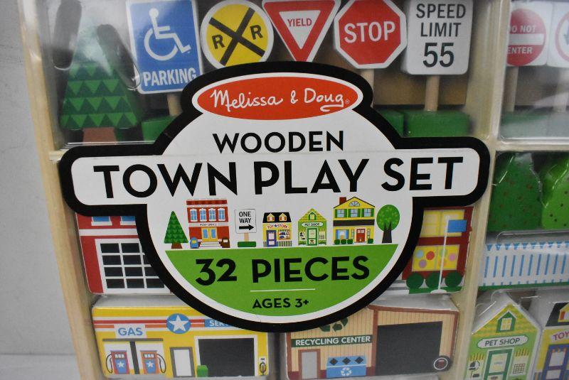 Melissa & Doug Wooden Town Play Set With Storage Tray 32 Pieces - New