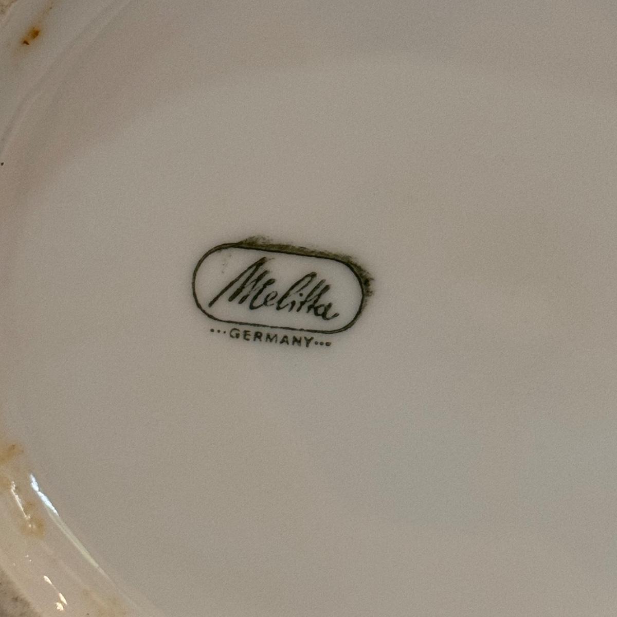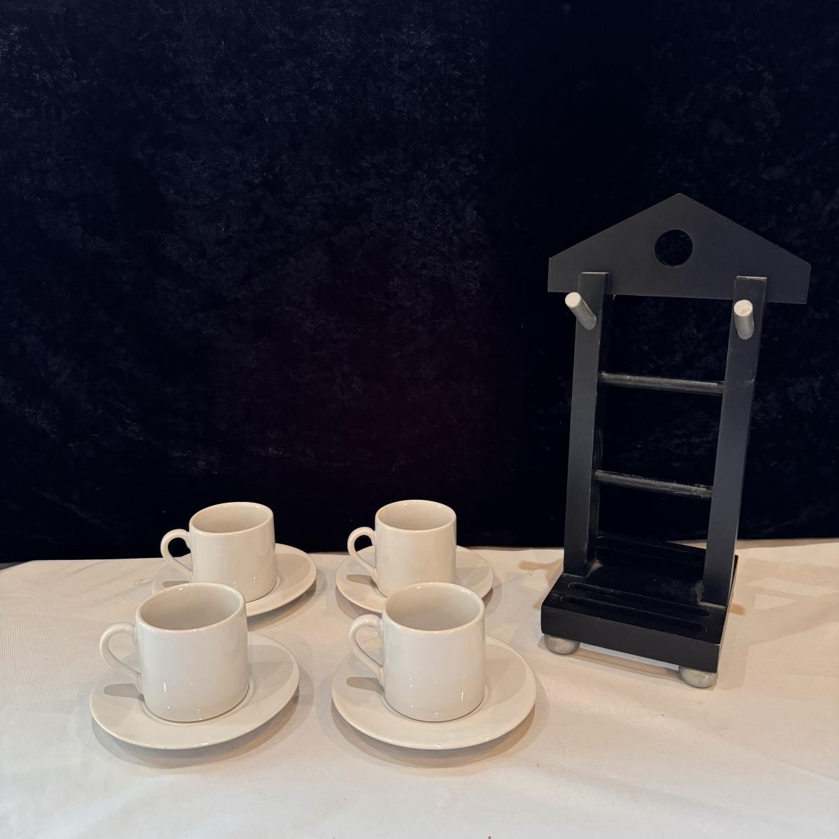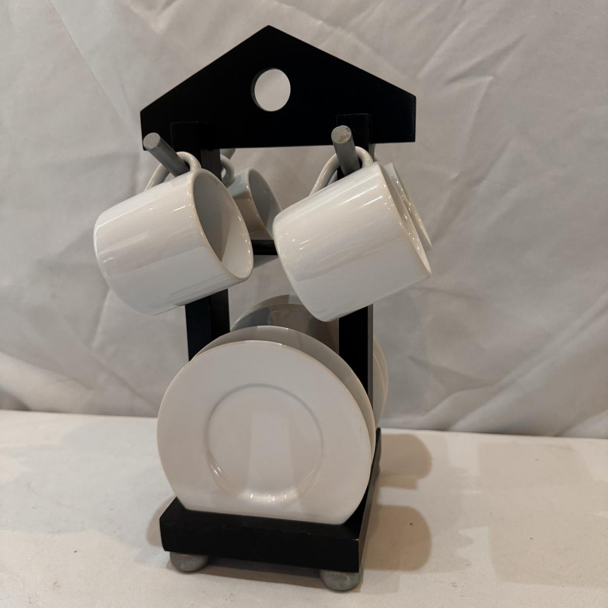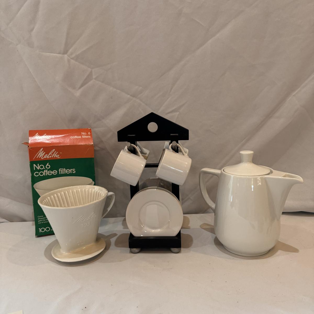 This lot includes one Melitta porcelain coffee filter with a handle, a pack of over 50 cone shaped coffee filters by Melitta, four porcelain espresso mugs with four matching saucers, one wooden rack to hold mugs and saucers, and one porcelain kettle with a lid. The coffee filters box has been opened, but the filters inside are unused. The porcelain kettle measures 10” x 5” x 10”H. Shipping available.
