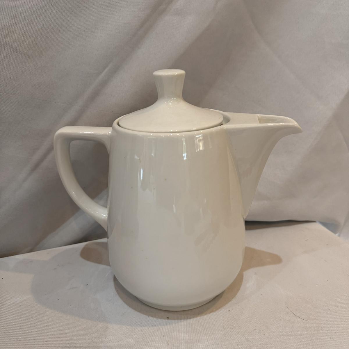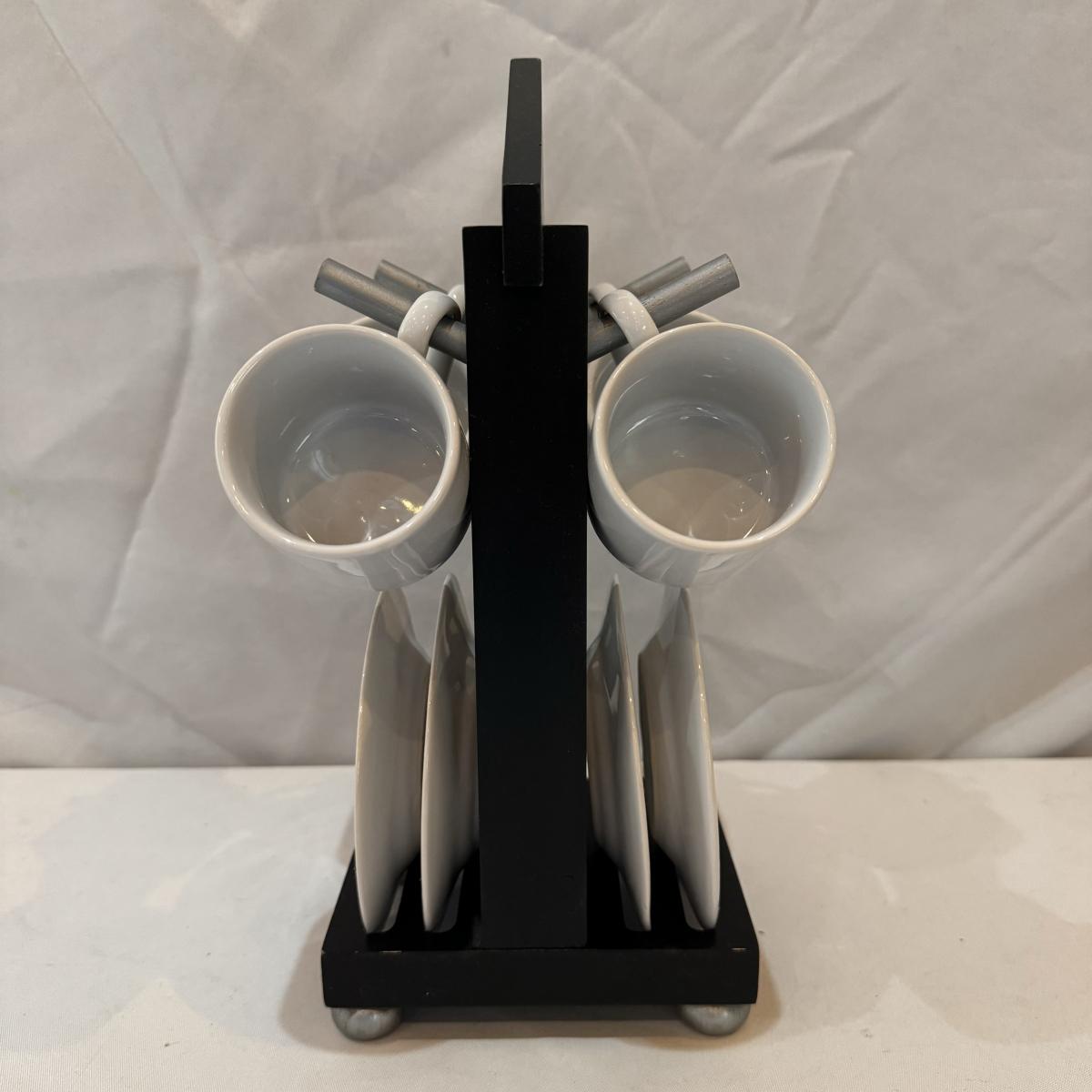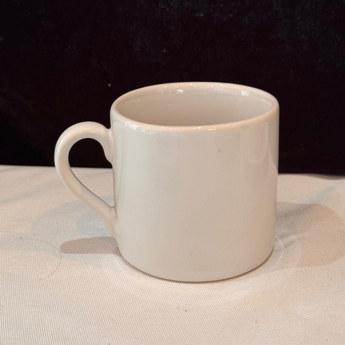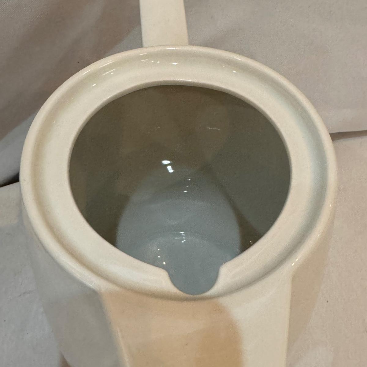 This lot includes one Melitta porcelain coffee filter with a handle, a pack of over 50 cone shaped coffee filters by Melitta, four porcelain espresso mugs with four matching saucers, one wooden rack to hold mugs and saucers, and one porcelain kettle with a lid. The coffee filters box has been opened, but the filters inside are unused. The porcelain kettle measures 10” x 5” x 10”H. Shipping available.