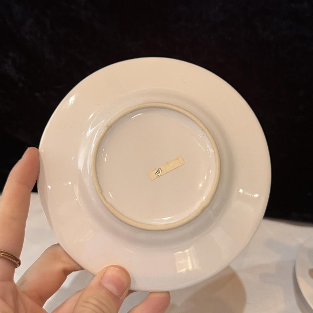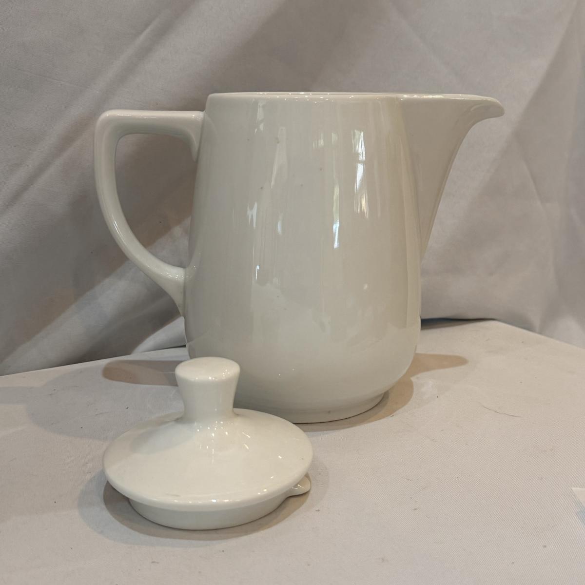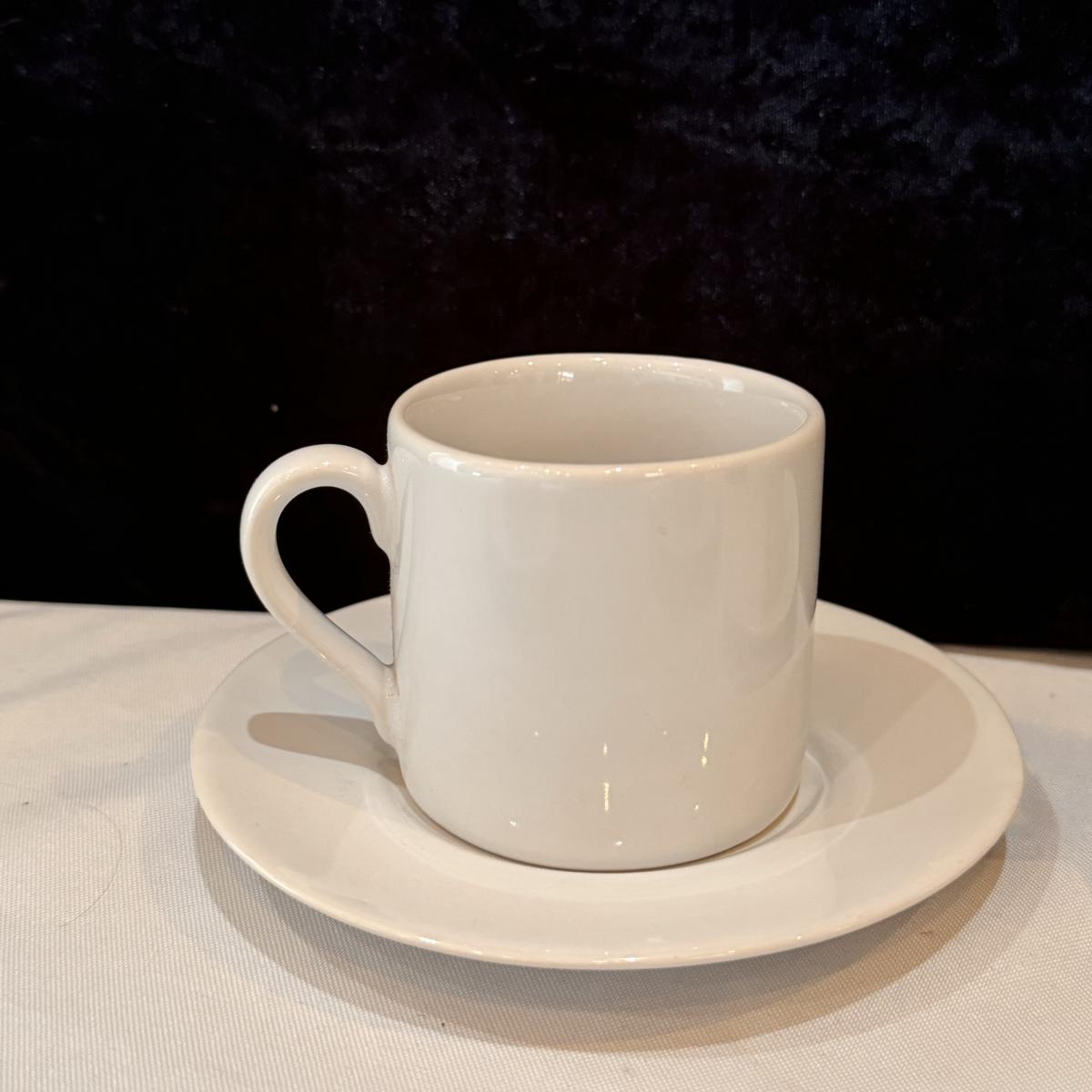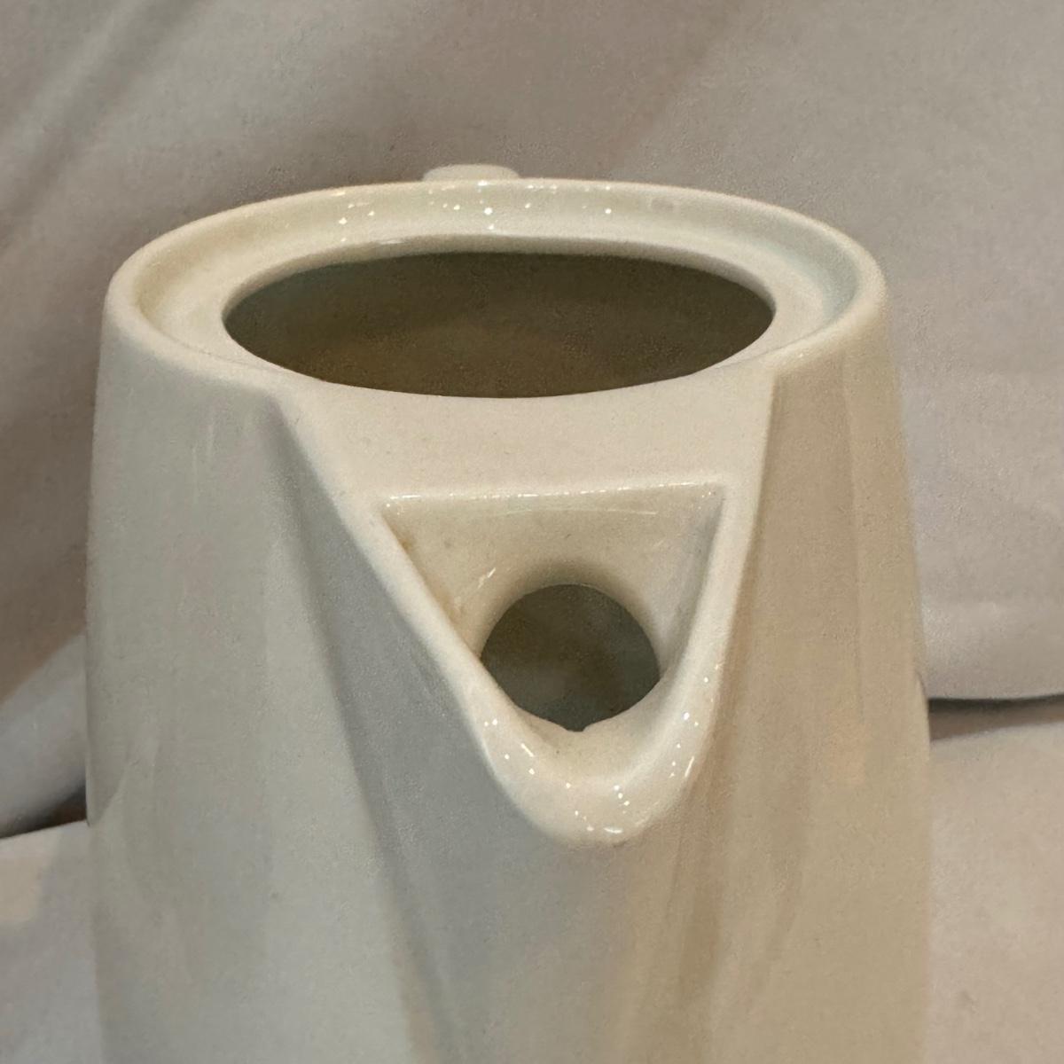This lot includes one Melitta porcelain coffee filter with a handle, a pack of over 50 cone shaped coffee filters by Melitta, four porcelain espresso mugs with four matching saucers, one wooden rack to hold mugs and saucers, and one porcelain kettle with a lid. The coffee filters box has been opened, but the filters inside are unused. The porcelain kettle measures 10” x 5” x 10”H. Shipping available.