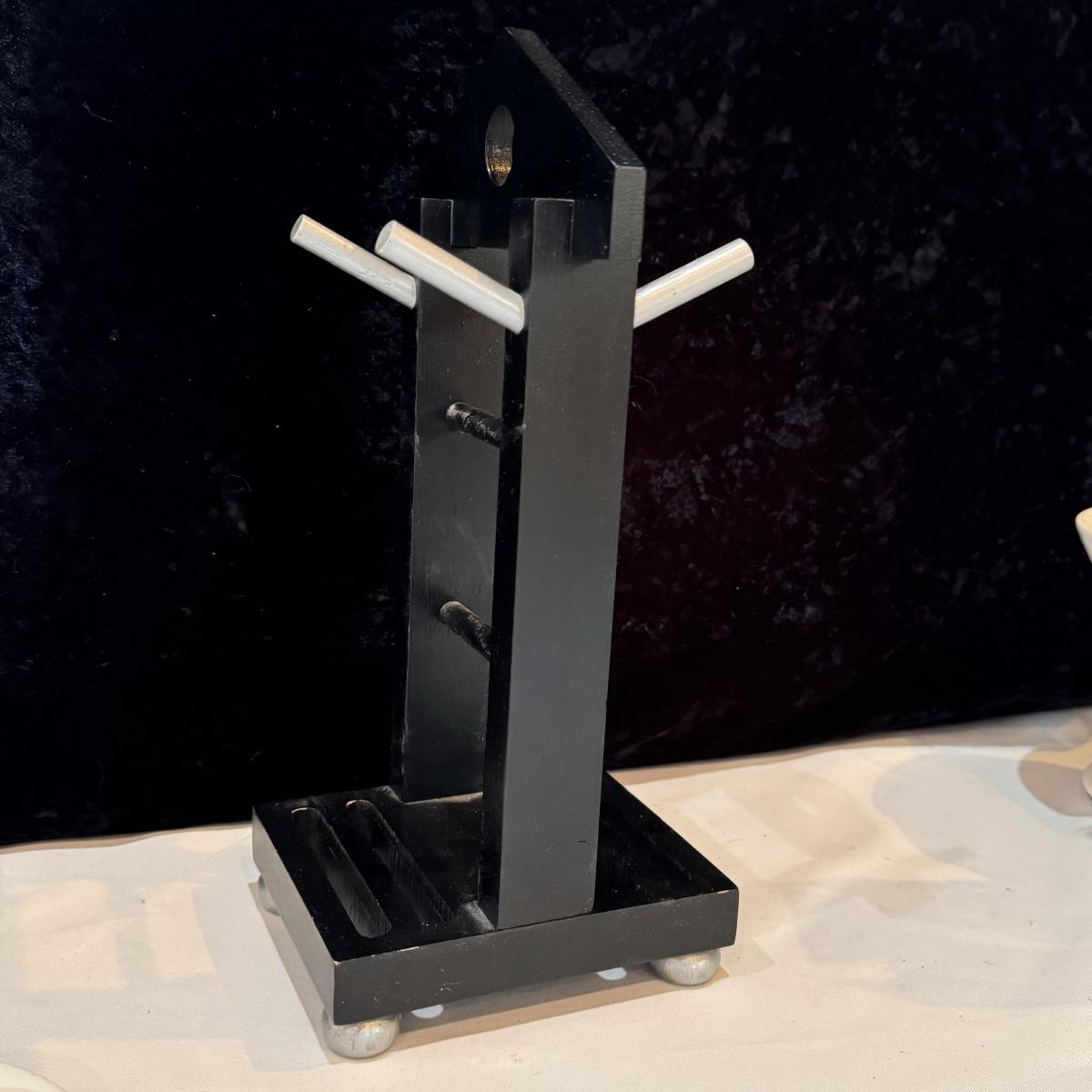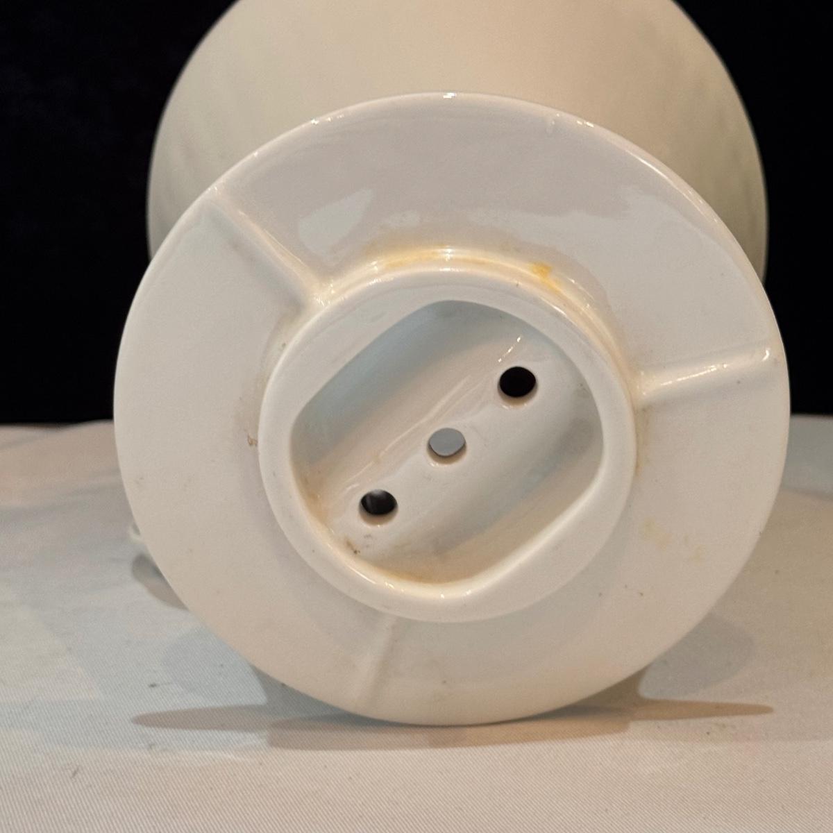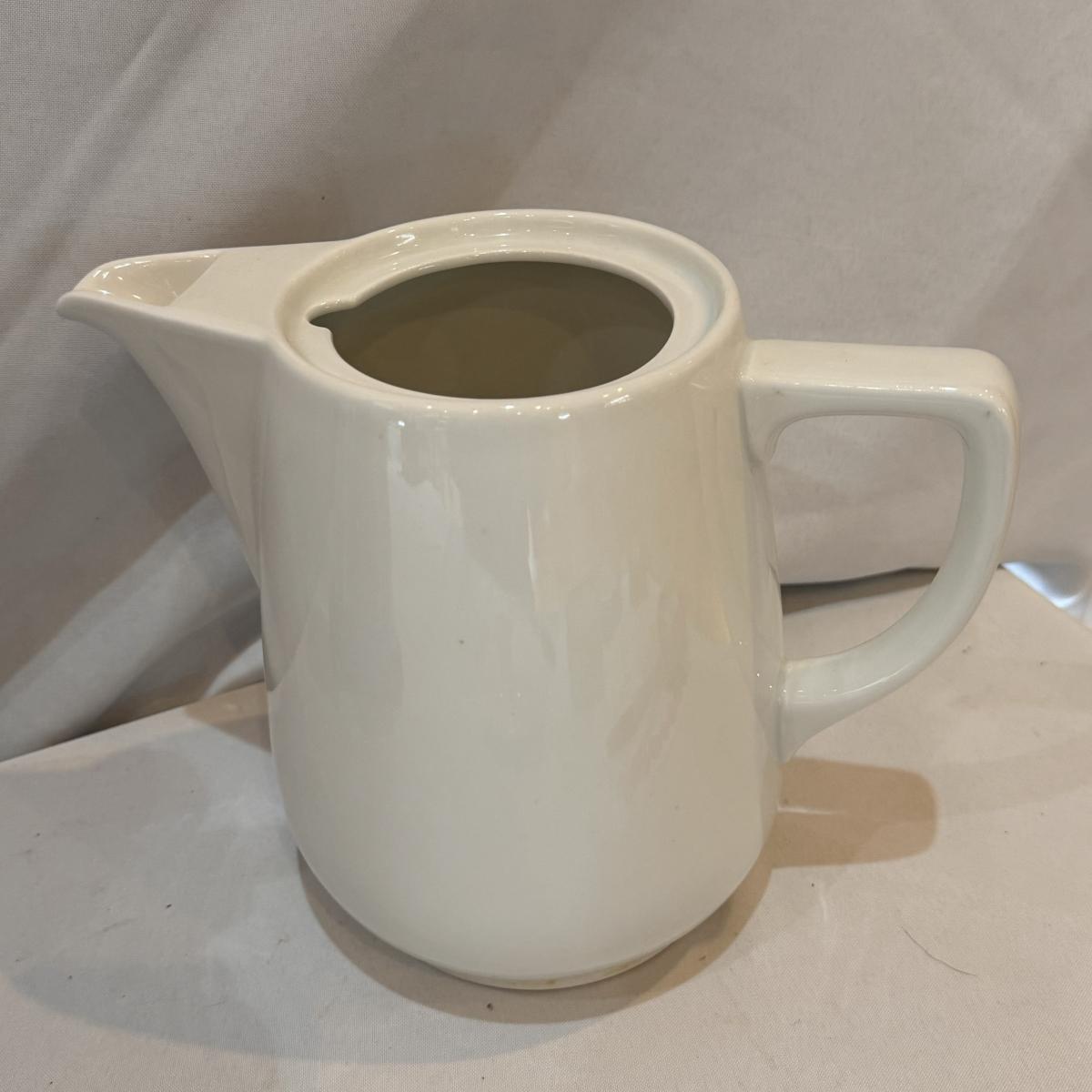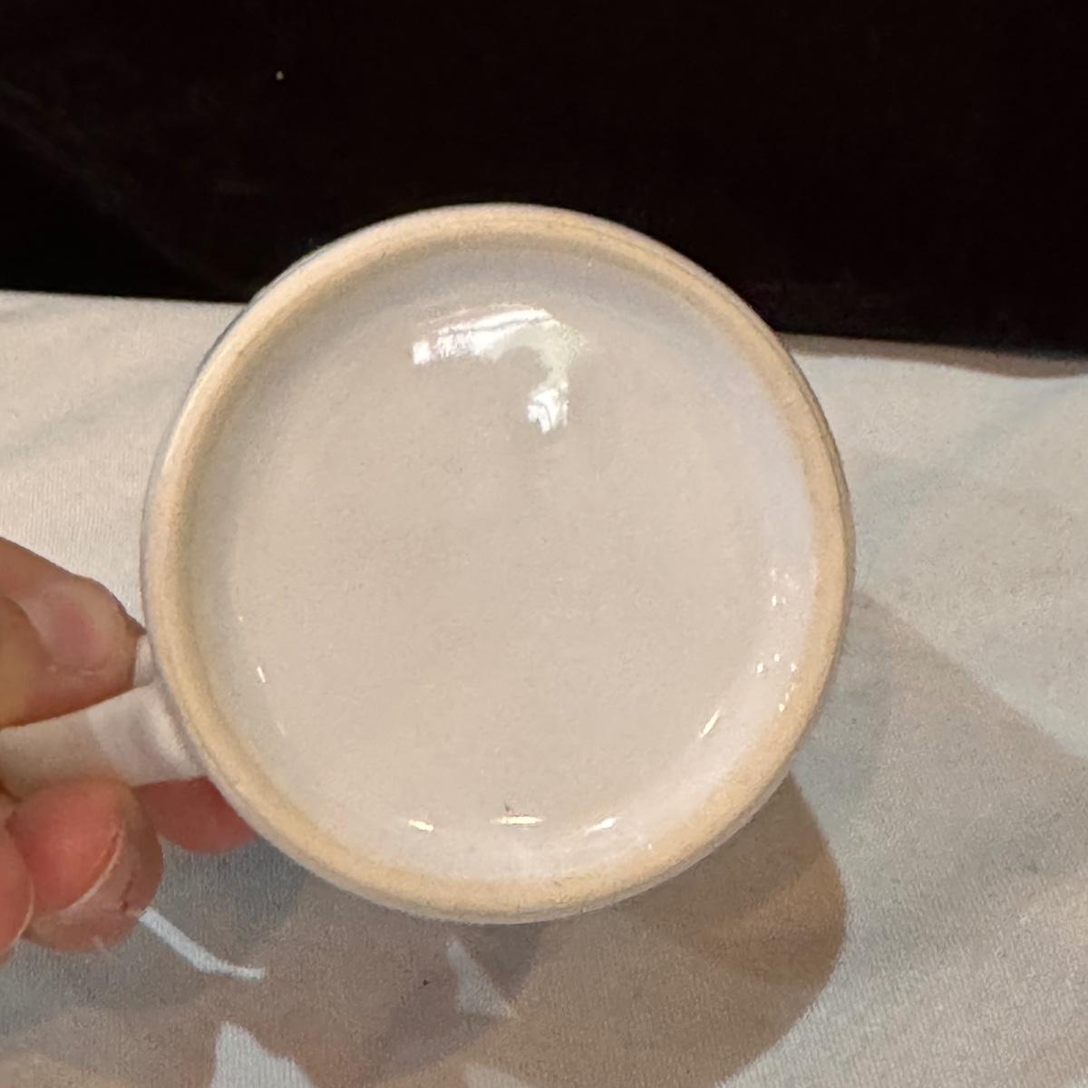 This lot includes one Melitta porcelain coffee filter with a handle, a pack of over 50 cone shaped coffee filters by Melitta, four porcelain espresso mugs with four matching saucers, one wooden rack to hold mugs and saucers, and one porcelain kettle with a lid. The coffee filters box has been opened, but the filters inside are unused. The porcelain kettle measures 10” x 5” x 10”H. Shipping available.