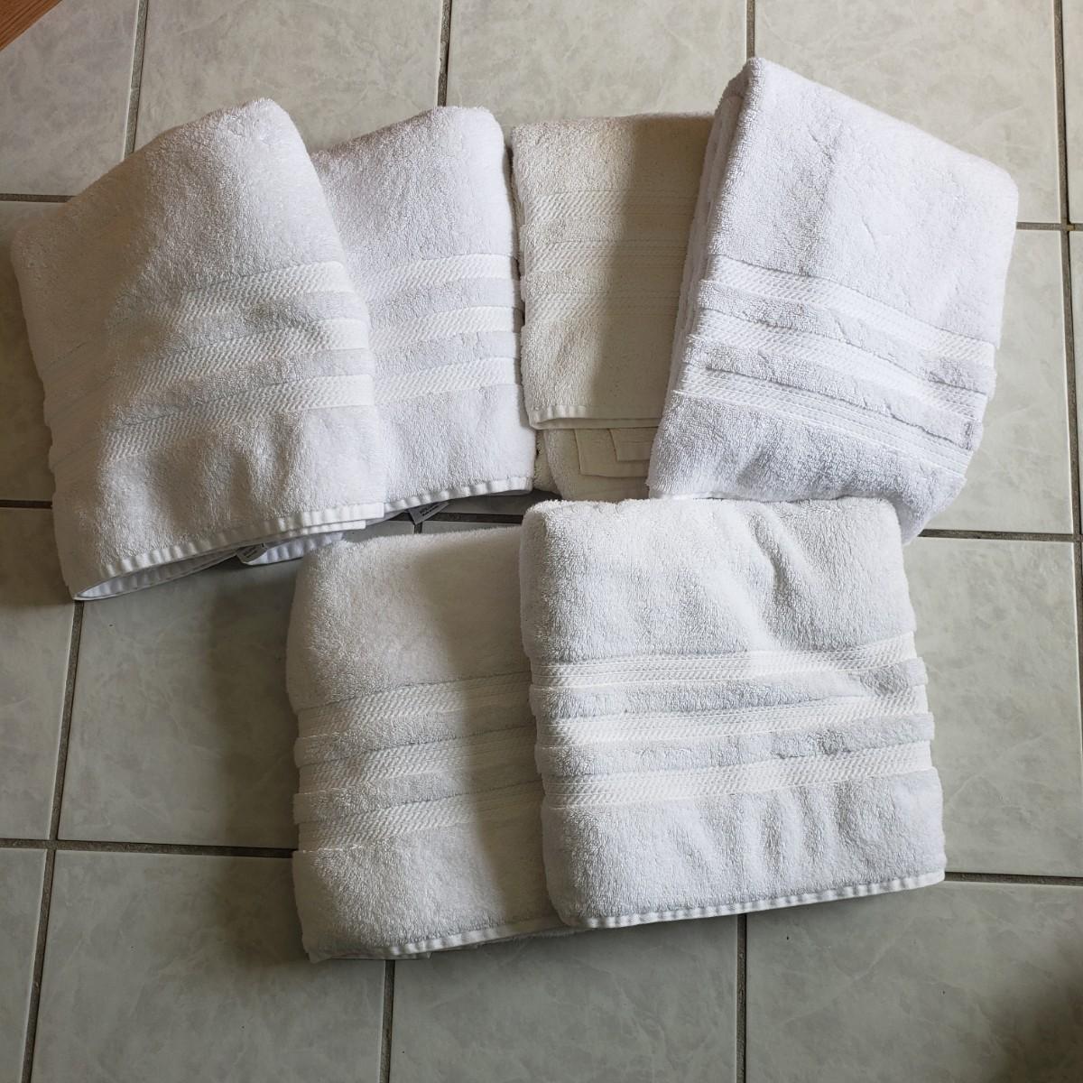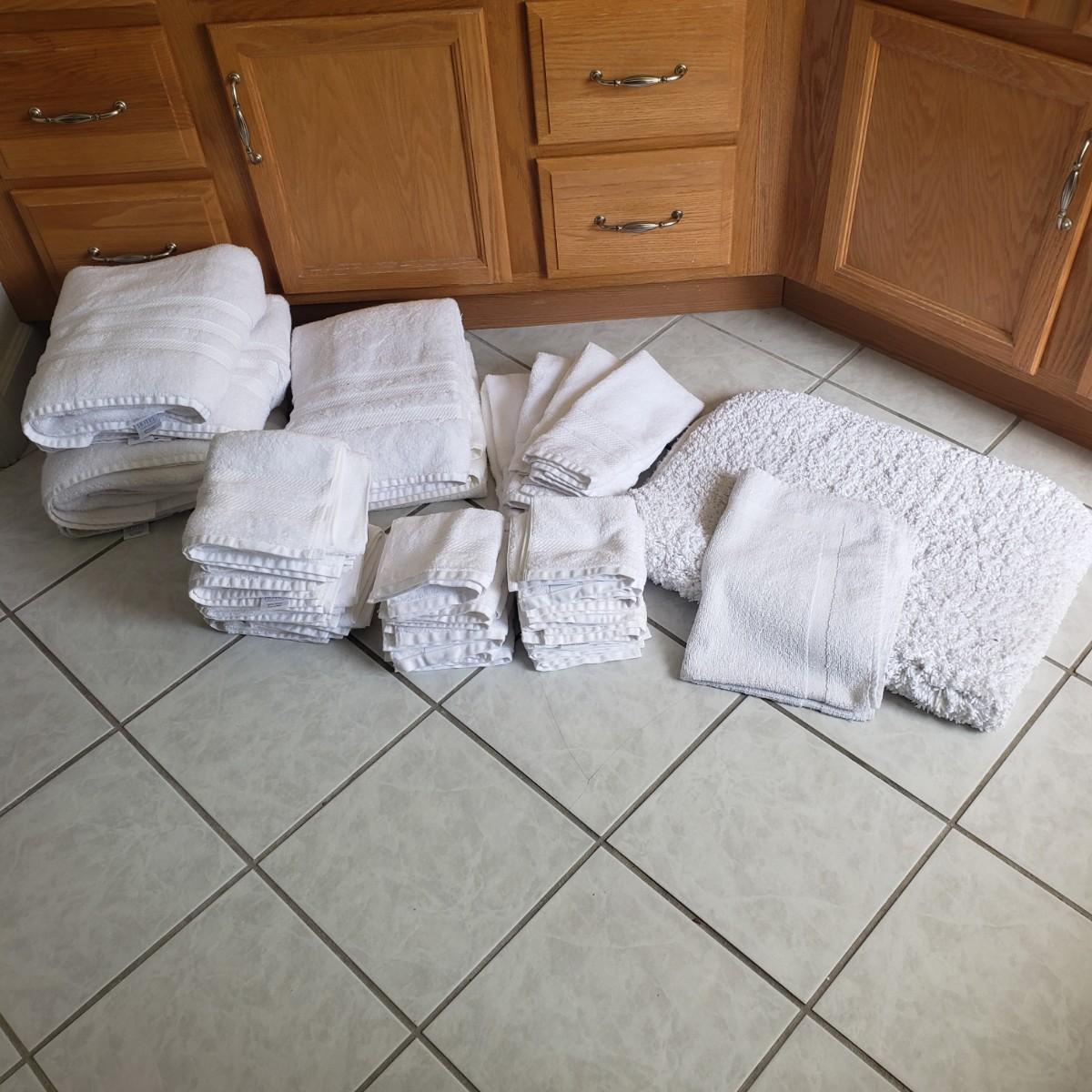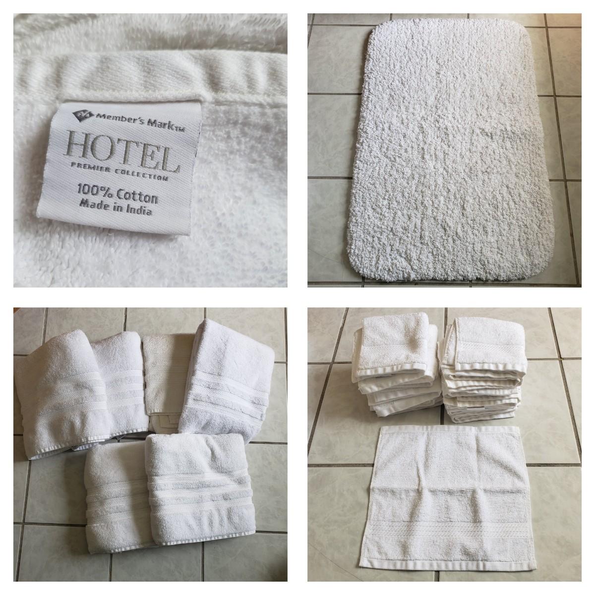 This is a white towel collection by Member's Mark Hotel Premier Collection. There is a bathmat, a rubber-bottom plush rug (36"x24"), 16 face cloths, 10 hand towels and six body towels (52" x 28"). One of the body towels is slight darker than the others, it did not come through in a picture though.
