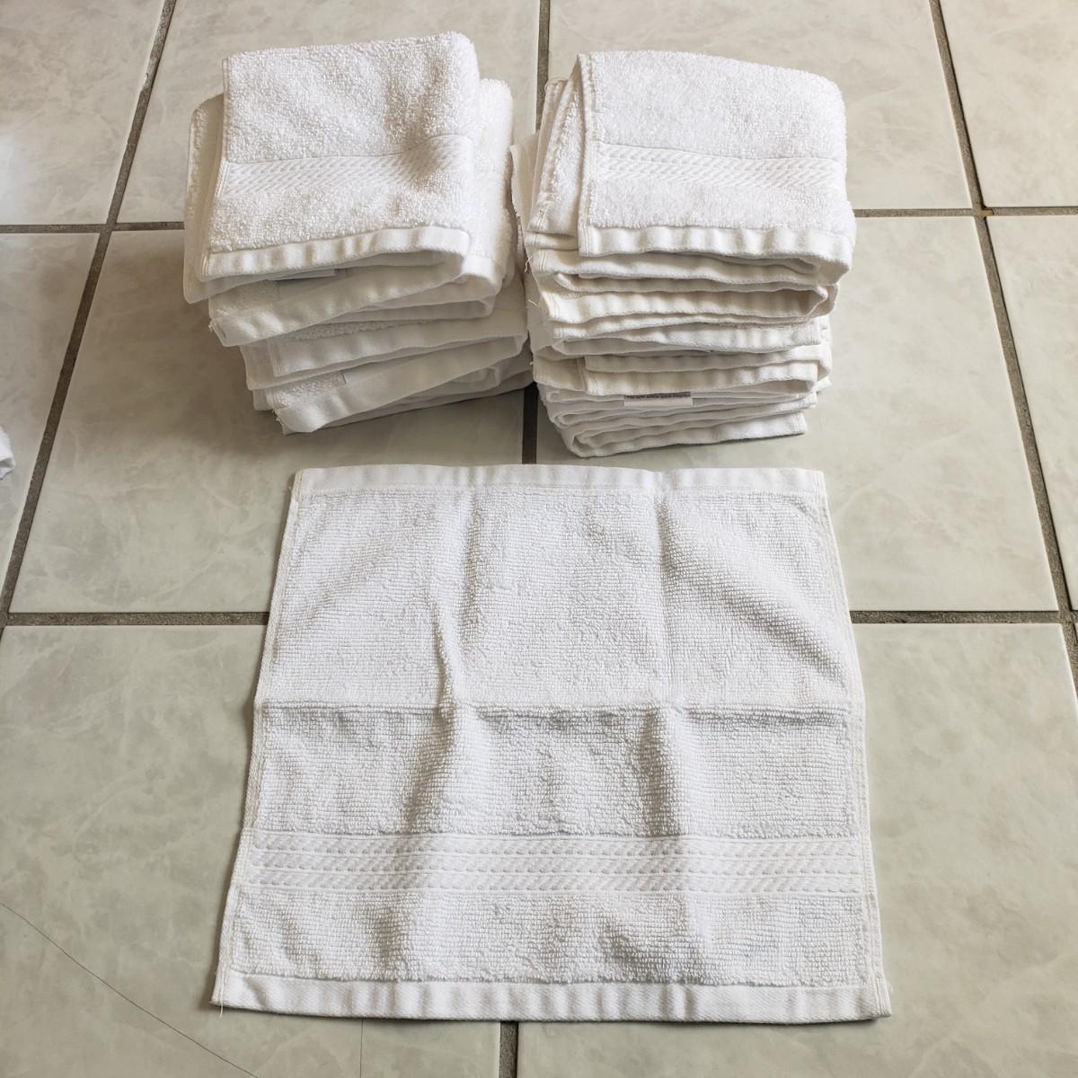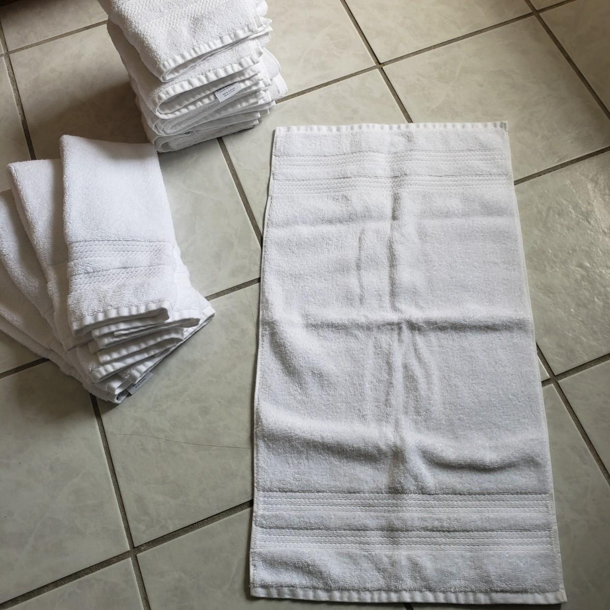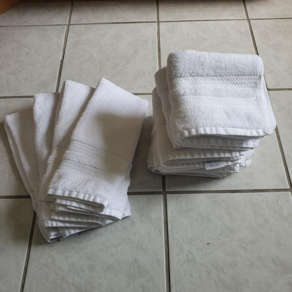 This is a white towel collection by Member's Mark Hotel Premier Collection. There is a bathmat, a rubber-bottom plush rug (36"x24"), 16 face cloths, 10 hand towels and six body towels (52" x 28"). One of the body towels is slight darker than the others, it did not come through in a picture though.