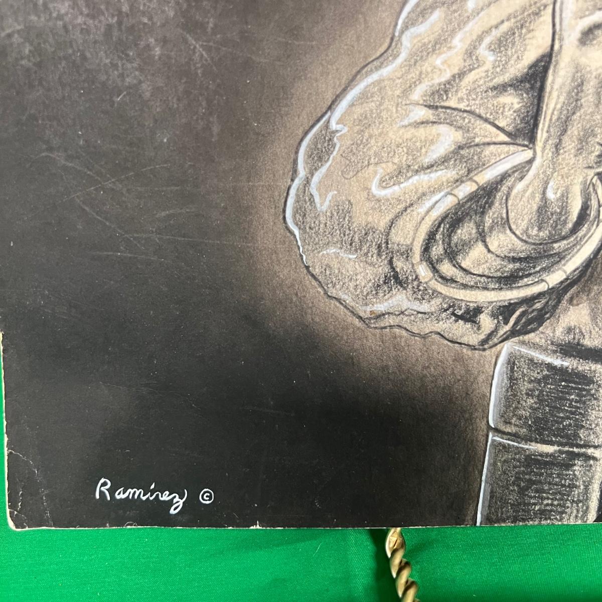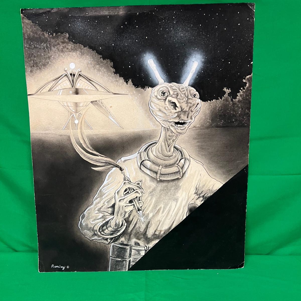 Original Al Ramirez ink and white out on paper stock in colored pencil. Piece is titled “Memoirs of an Alien” and measures 14” x 17”. Al let us know that based on the quality of this drawing, Asimov’s Science Fiction Magazine hired Alfred Ramirez to create an illustration for their upcoming May 1983 publication. Original art from "The Final Voice" has that original drawing for Asimov/May 1983 can be found in this sale.