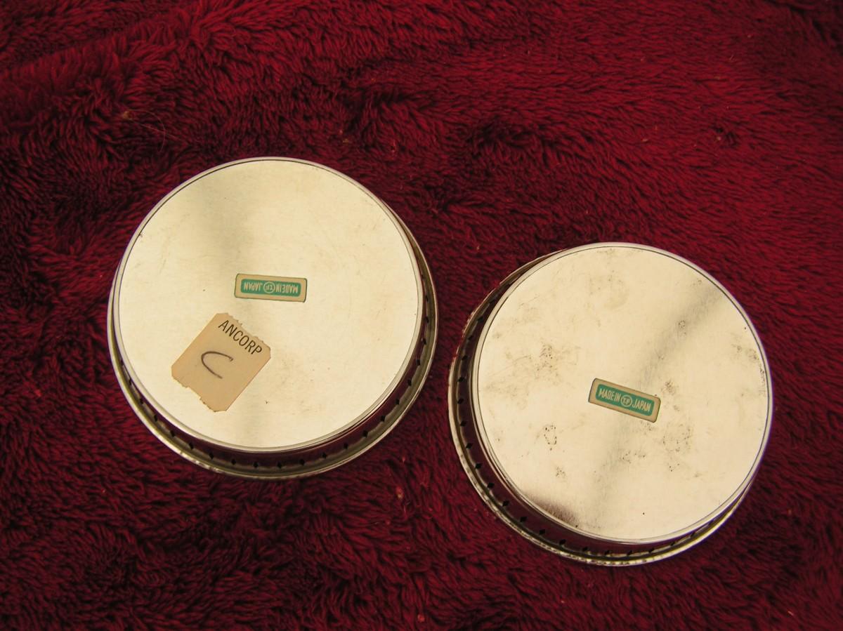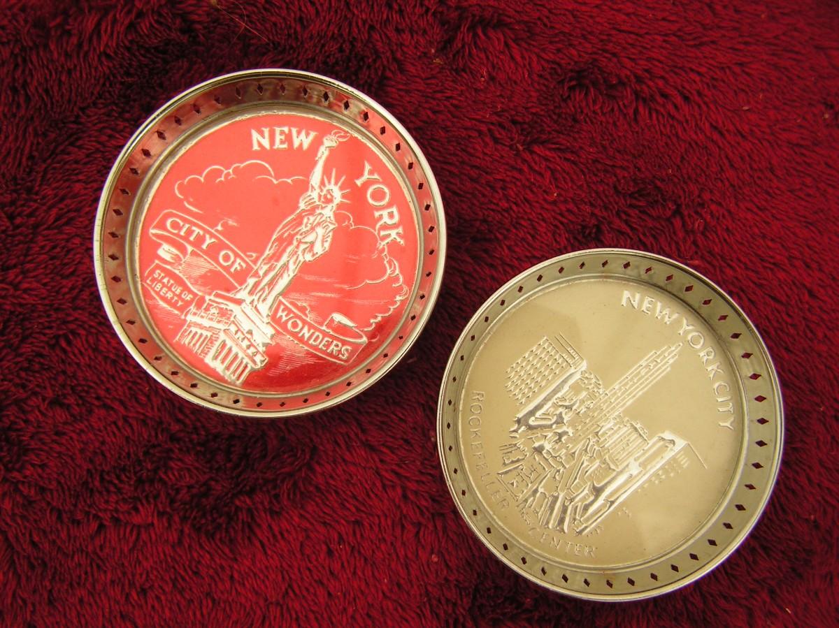 Memorabilia from New York City. Drink coasters, metal. About 3-1/8" dia. at rim.