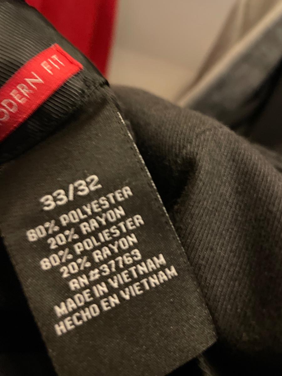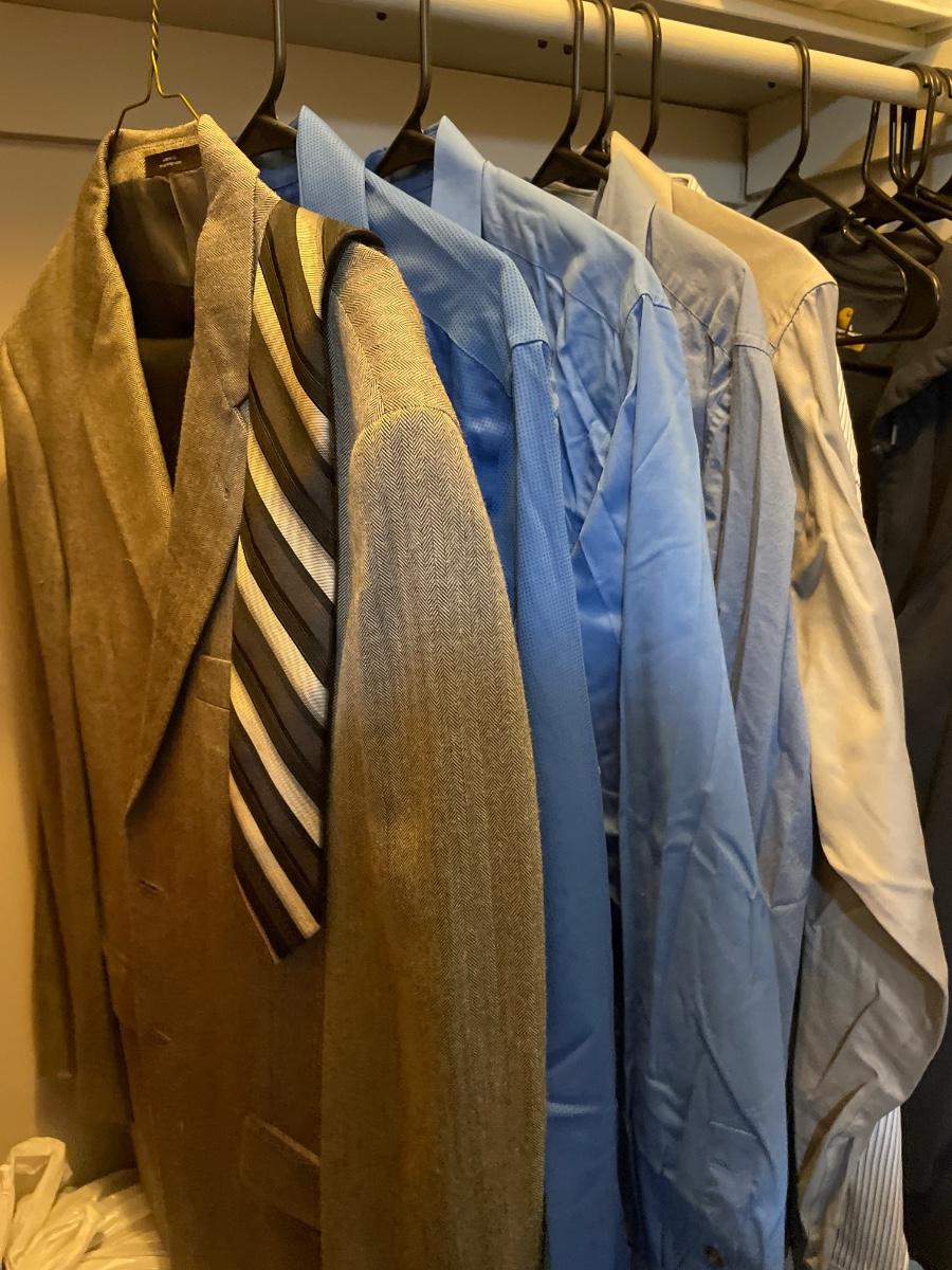 Men suit, unknown size, slacks. Dress shirts appear to be size large. Bag of assorted ties.