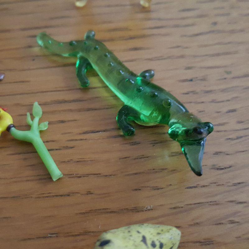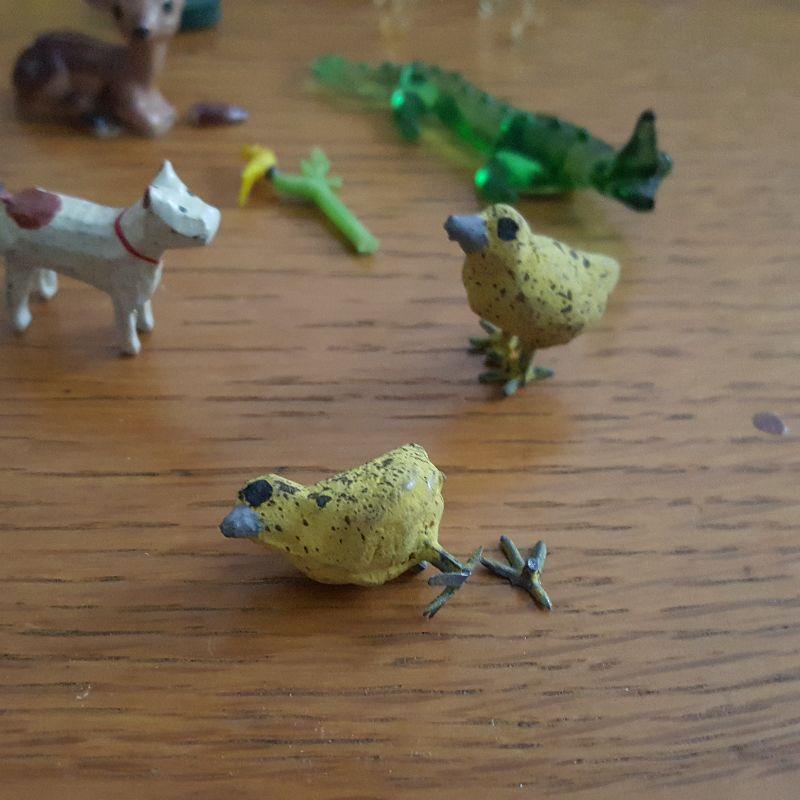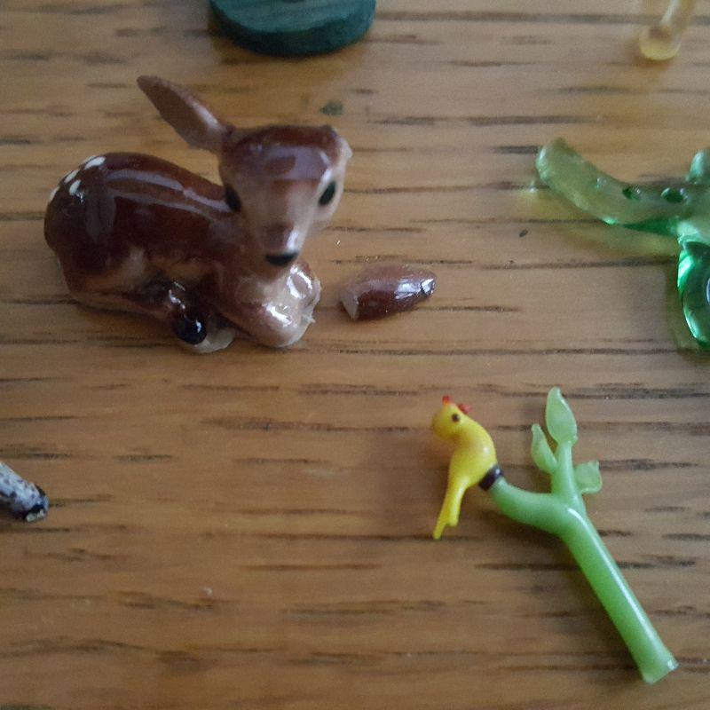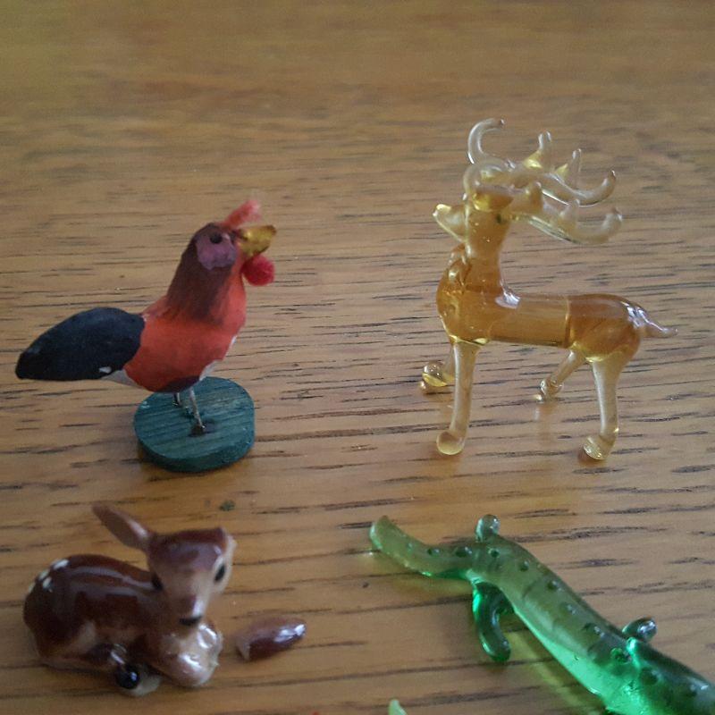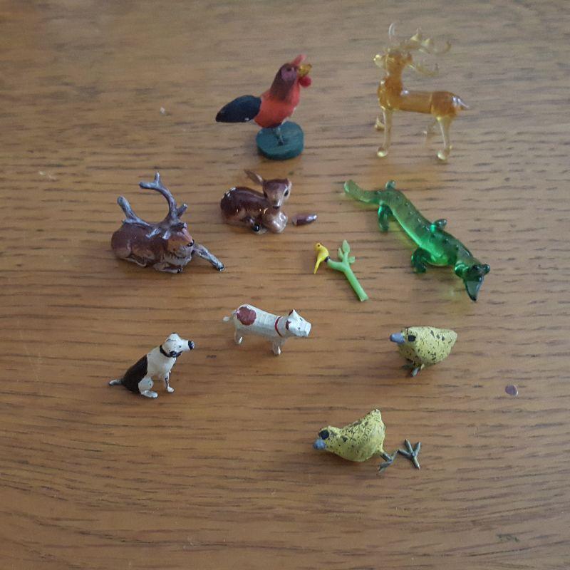 This auction lot is for a Menagerie of Miniature Animals. This little collection is quite the zoo. It contains a amber glass reindeer, a green glass crocodile - marked made in Germany, two metal chicks - one whose leg is detached but there, a small, carved wood dog, a ceramic fawn - with detached ear but there, a vintage metal elk, a metal, black and white, sitting dog, a glass bird sitting on a branch and a wood carved rooster. What a collection, make it yours.