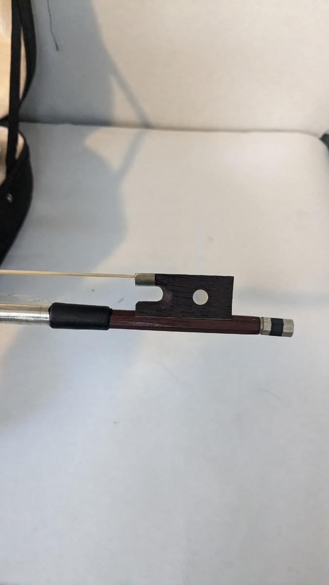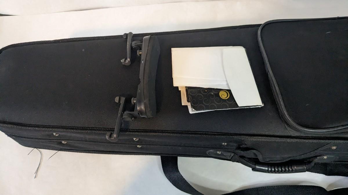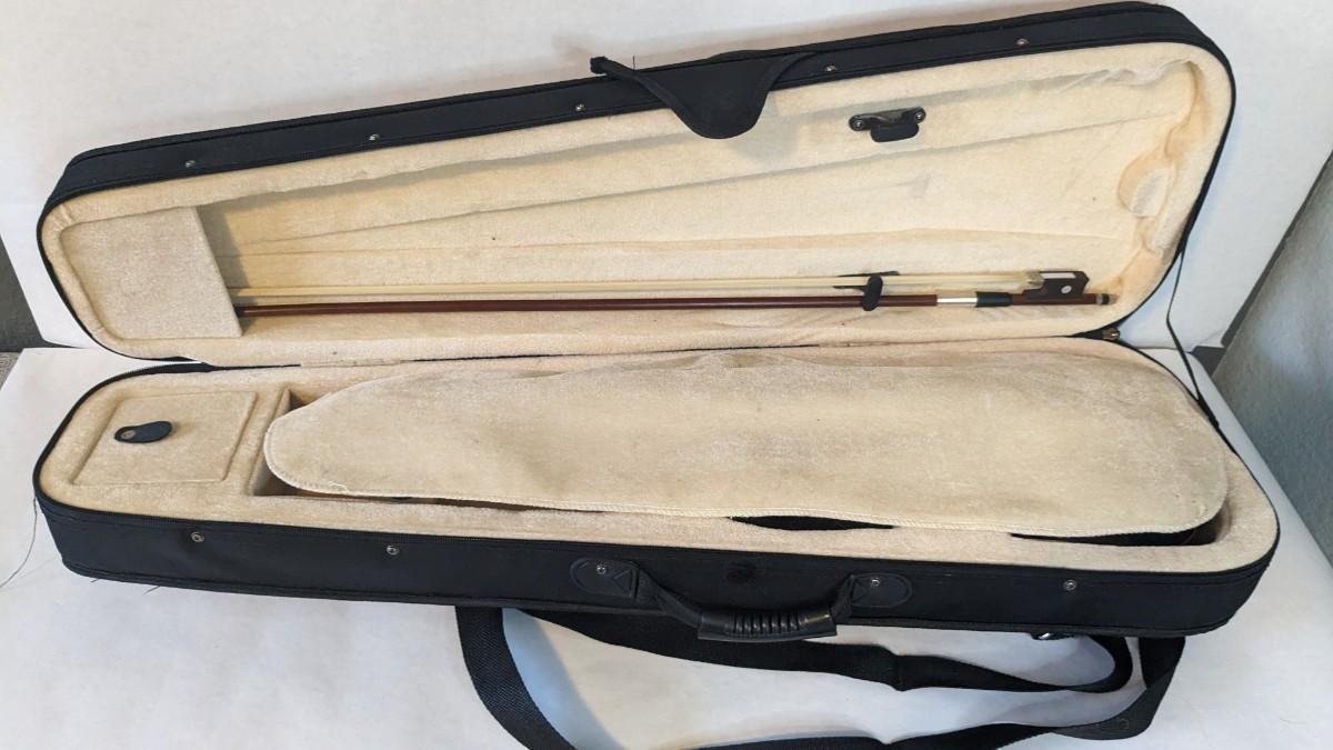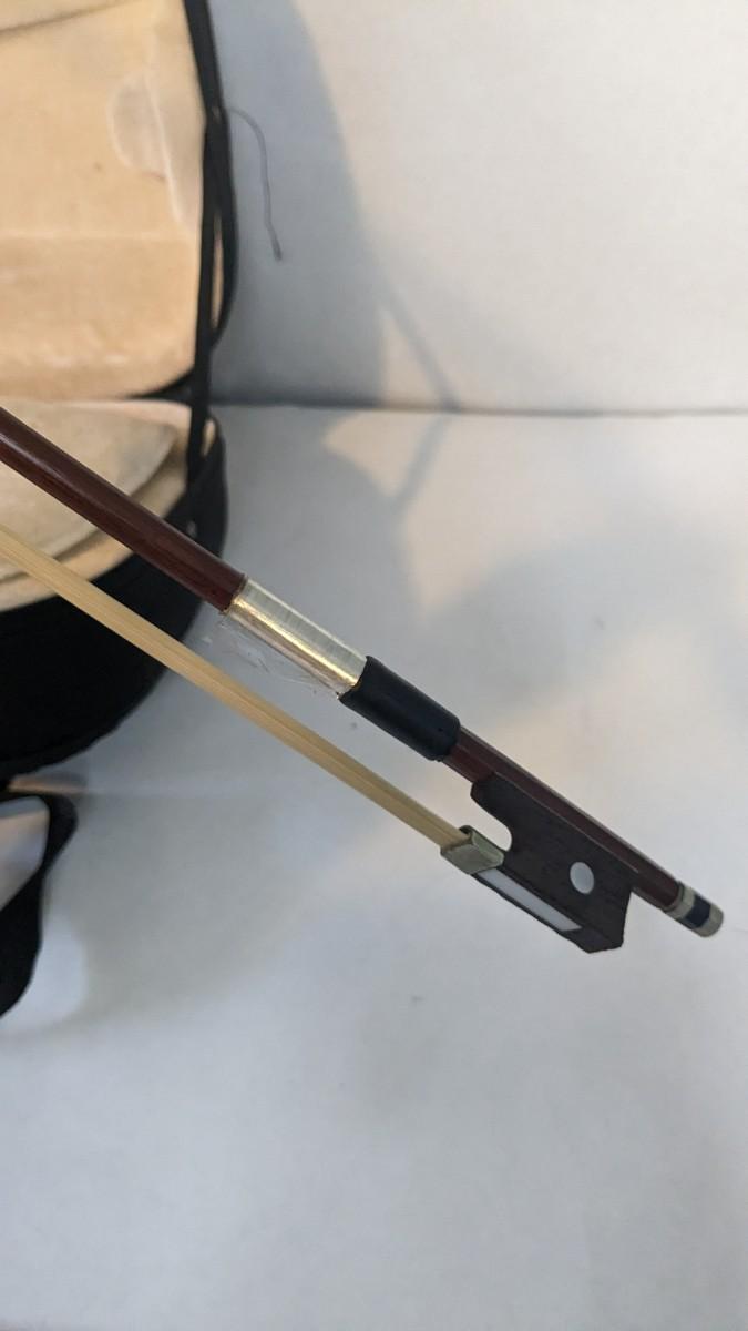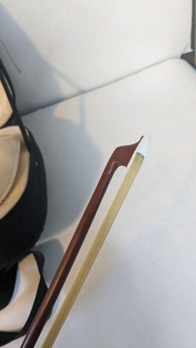 in great condition with minor wear noted on head and neck as seen in photos. Includes bow, case, and extras in zippered pocket. Note minor wear to nylon outside.