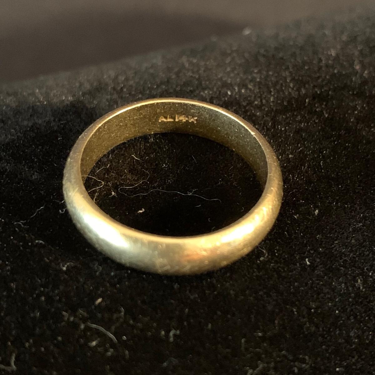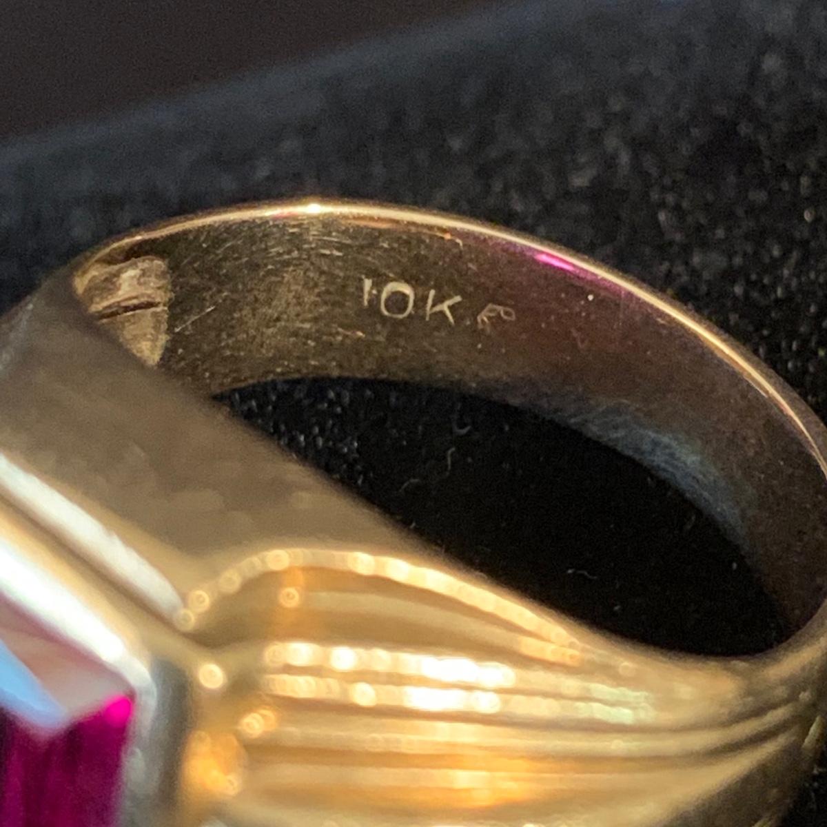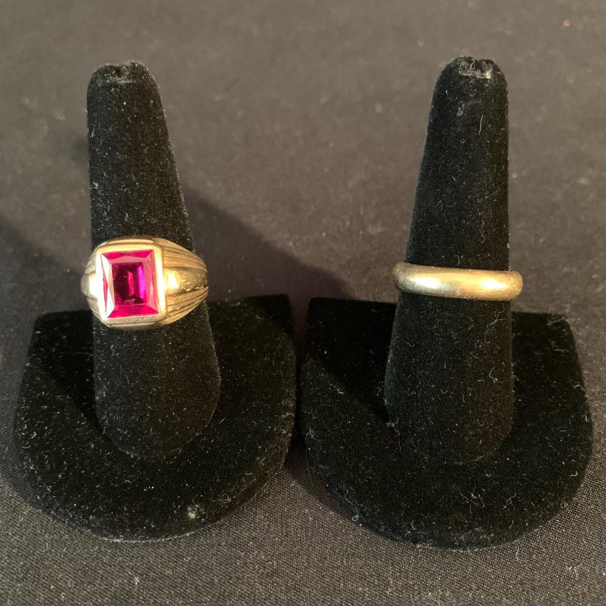 Two men’s rings. One is a 10K gold ring with a ruby red colored gemstone. The other is a gold band marked “AL14K”. Shipping available.