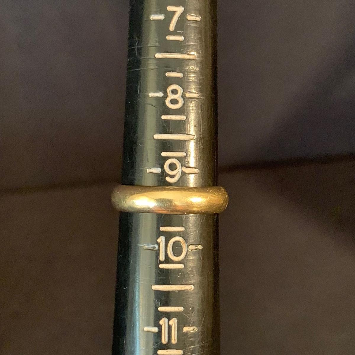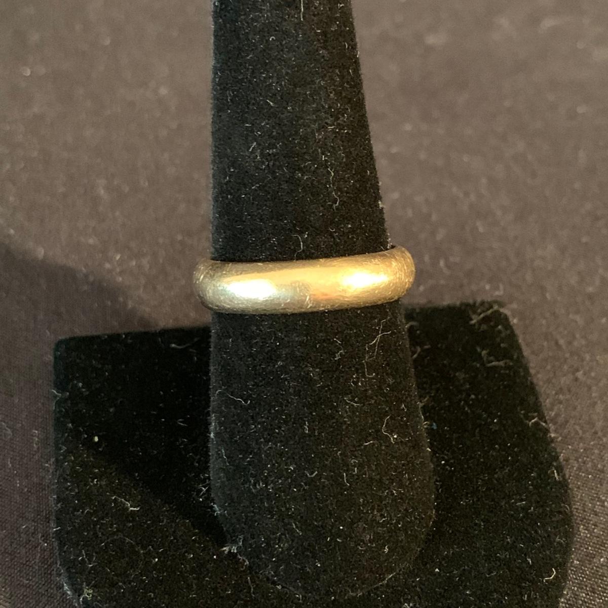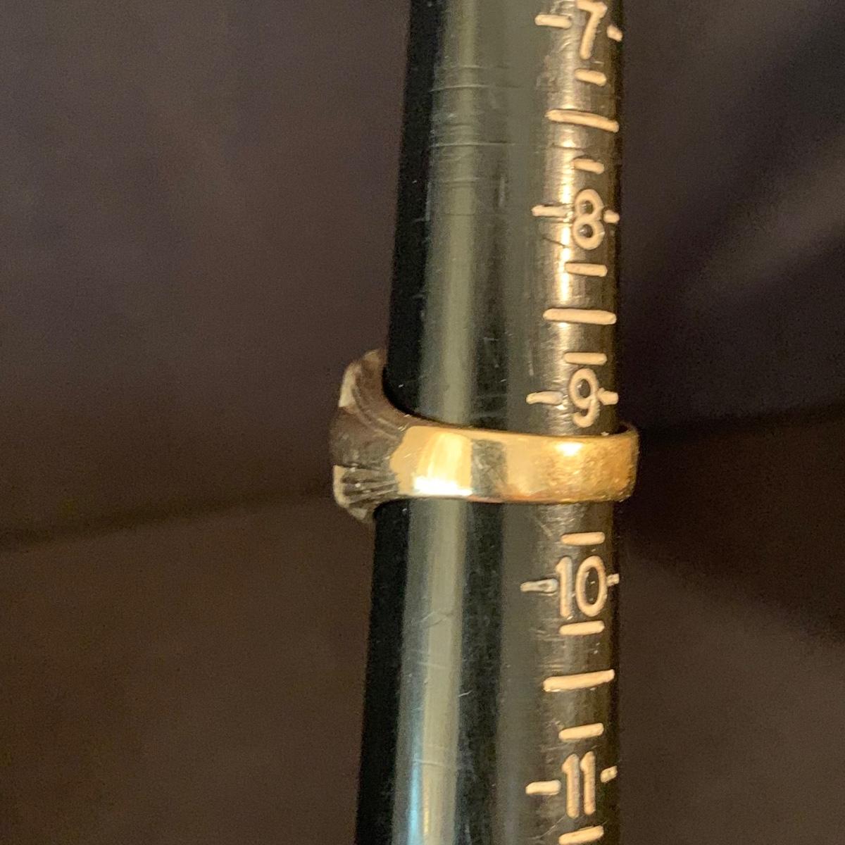 Two men’s rings. One is a 10K gold ring with a ruby red colored gemstone. The other is a gold band marked “AL14K”. Shipping available.