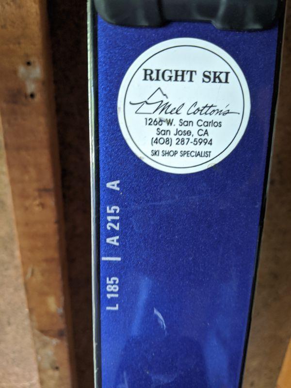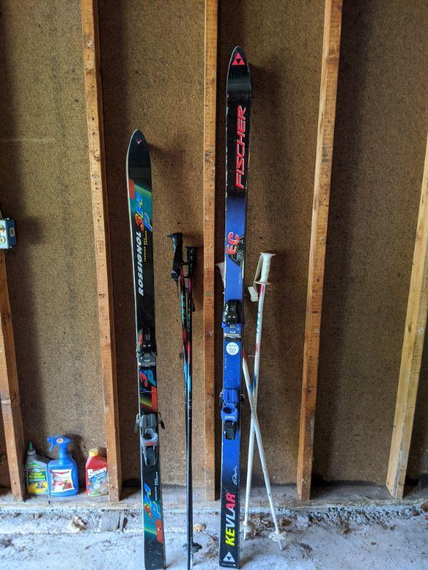 Used. Men's skis are 185cm. Women's is unknown but approx. 140-150cm. Men's is by Fischer and Women's is by Rossignol