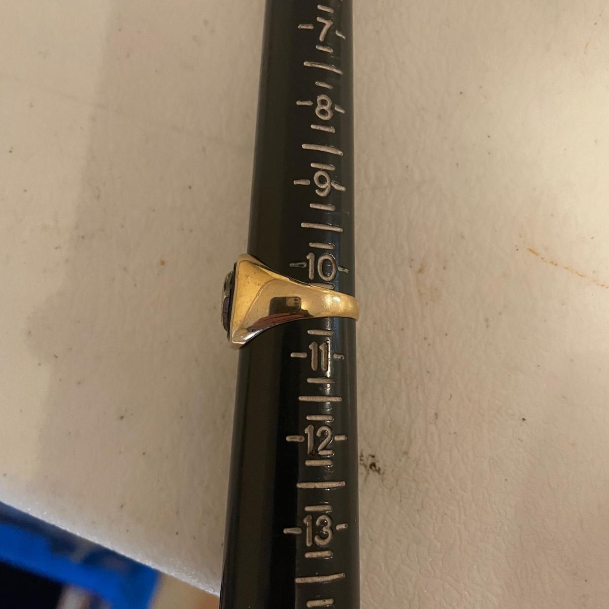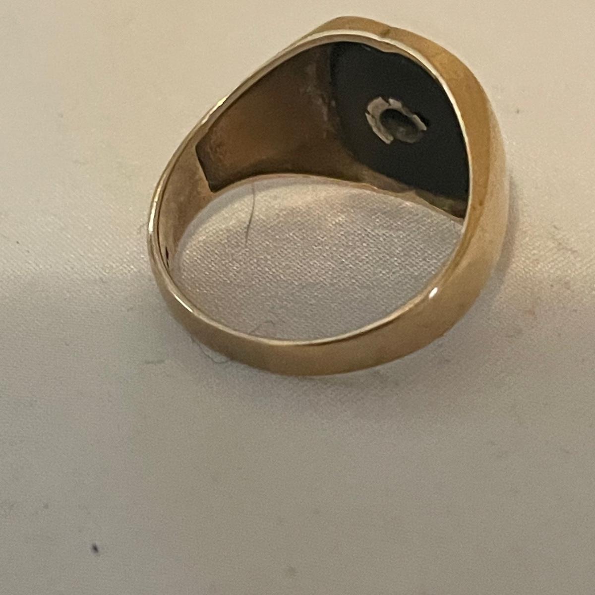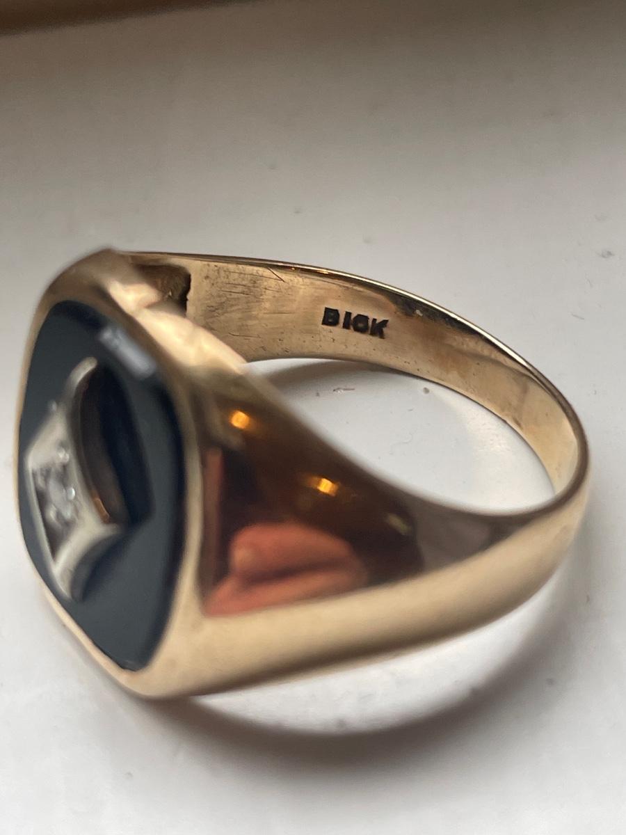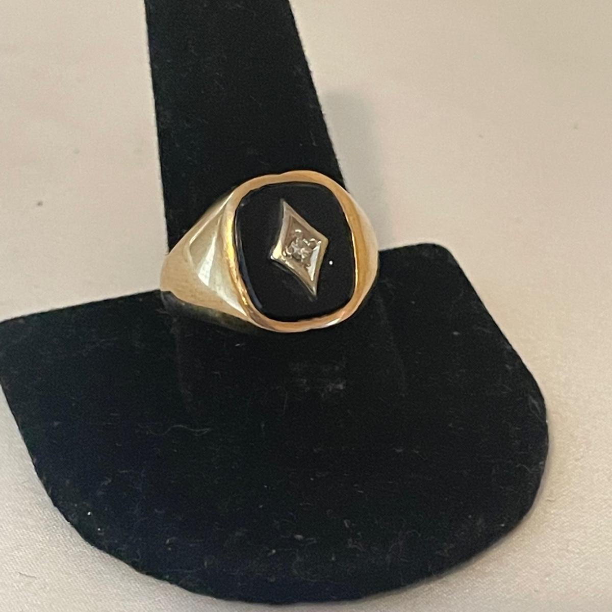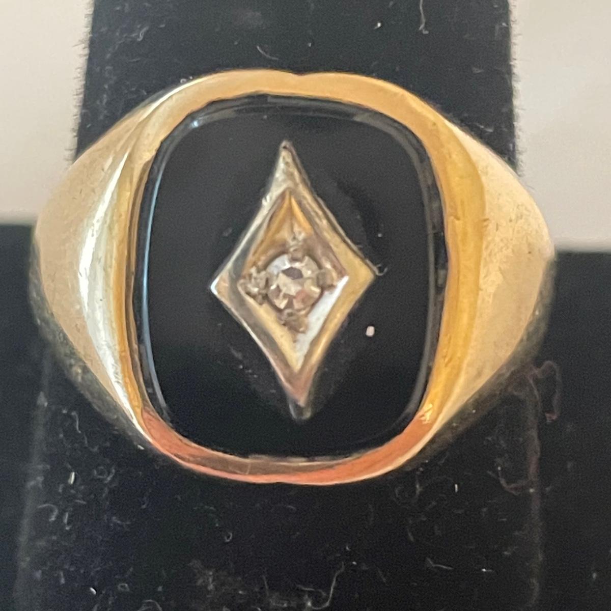 This attractive mens ring is marked B10K and has an onyx center that contains a faux diamond center.