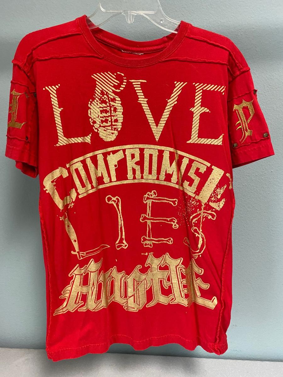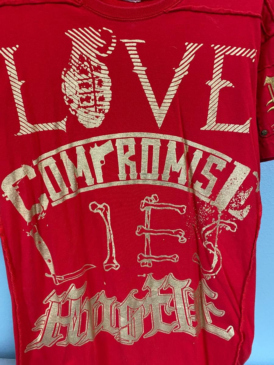 Men's Blac Label Warriors Destructed Love Compromise Lies Hustle Red Gold T Shirt