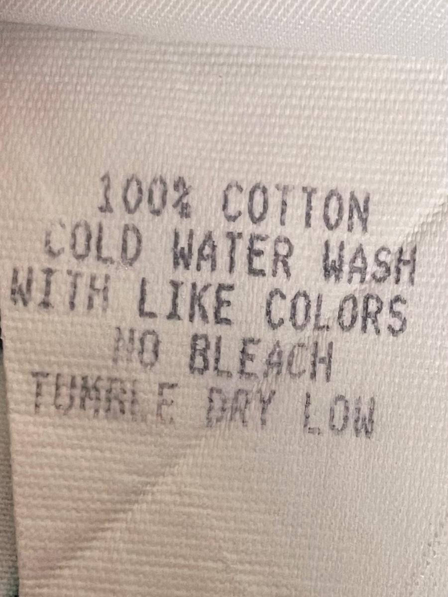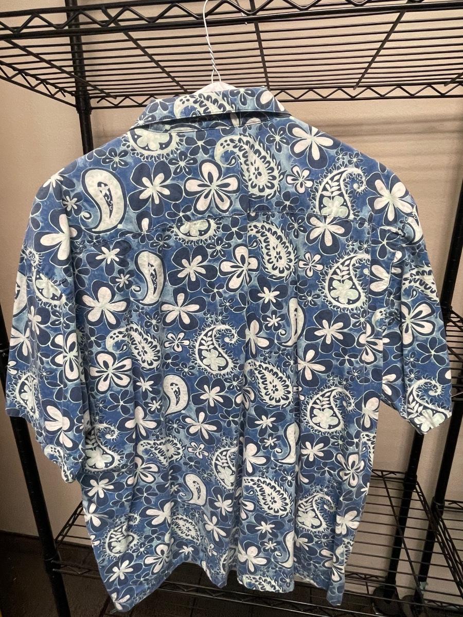 This shirt is in great condition and has no noticeable damages. All buttons are on the shirt, none are missing. It seems to be a size large or XL. It’s made up of 100% cotton. Cold water wash with like colors, no bleach, tumble dry low.