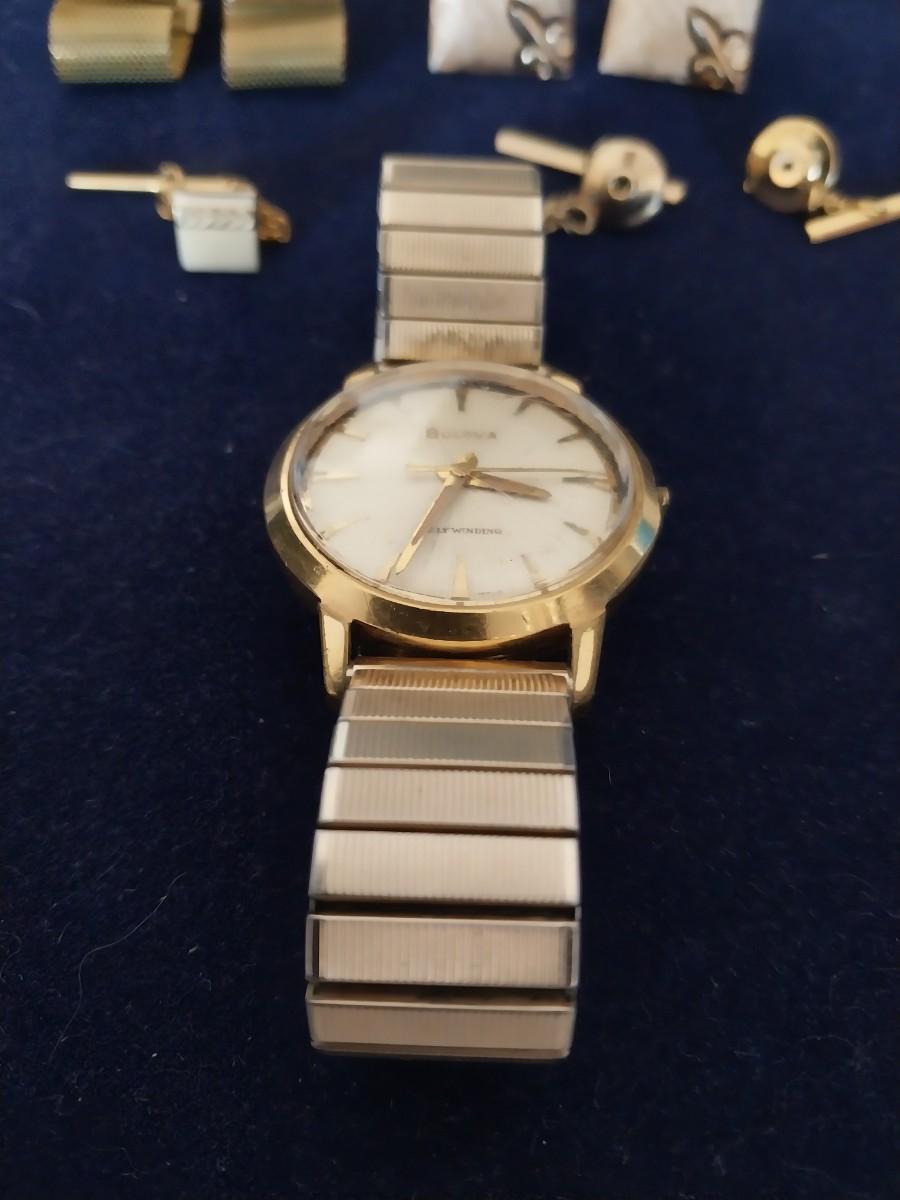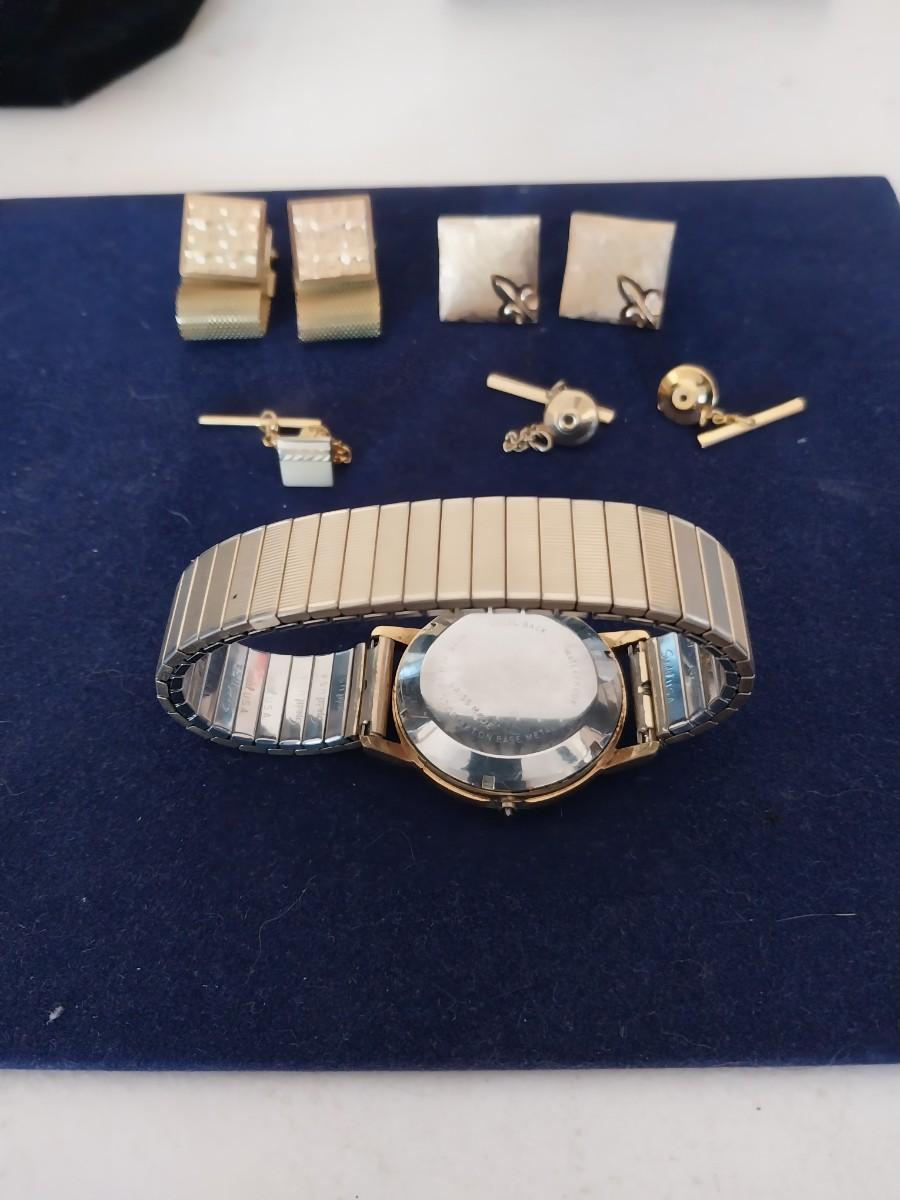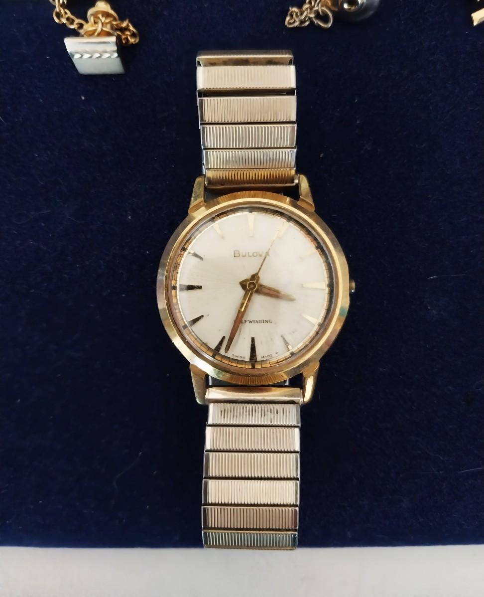 MENS BULOVA SELF WINDING WATCH AND CUFFLINGS-TIE TACKS