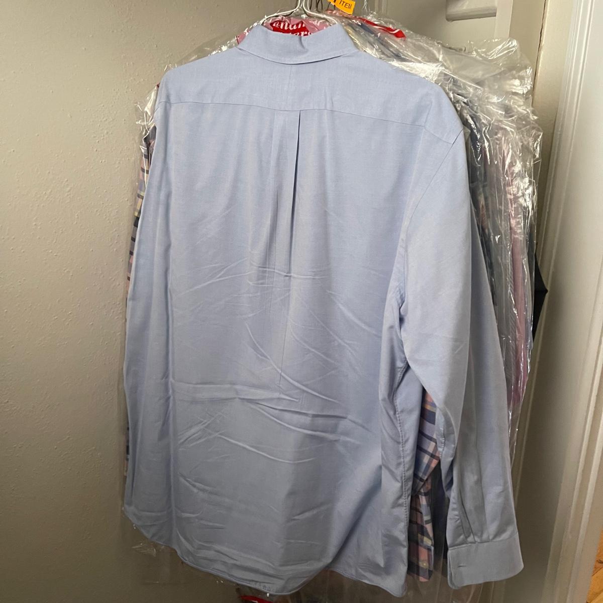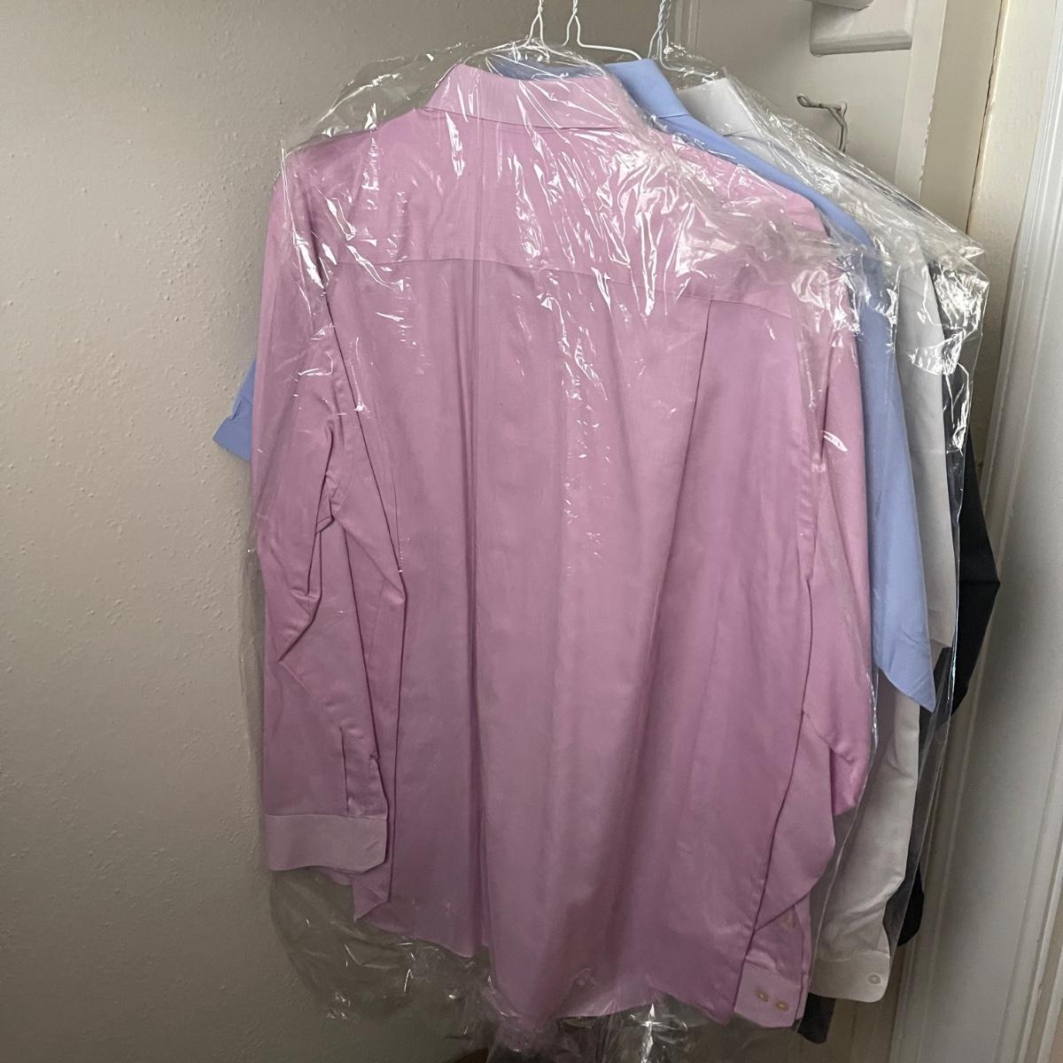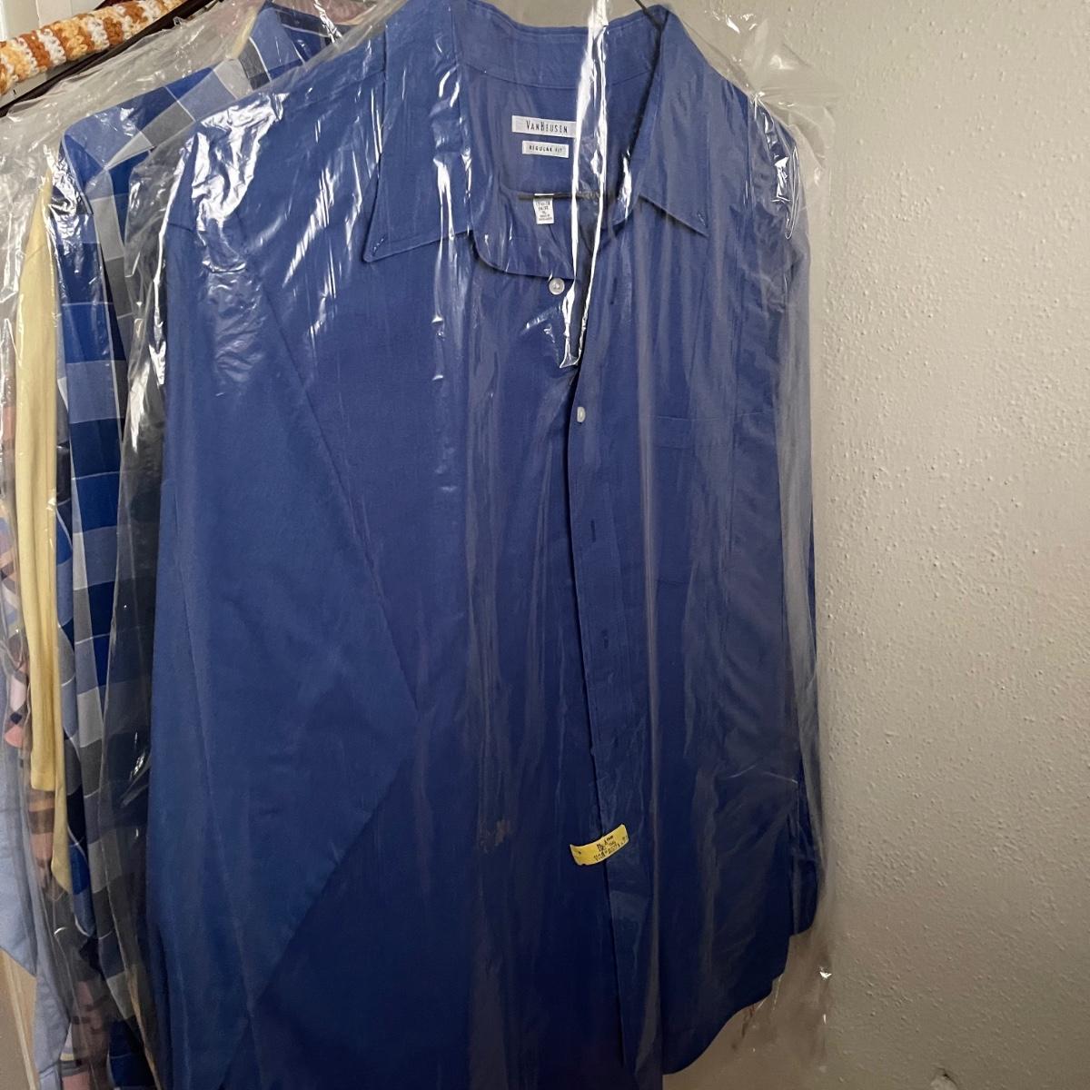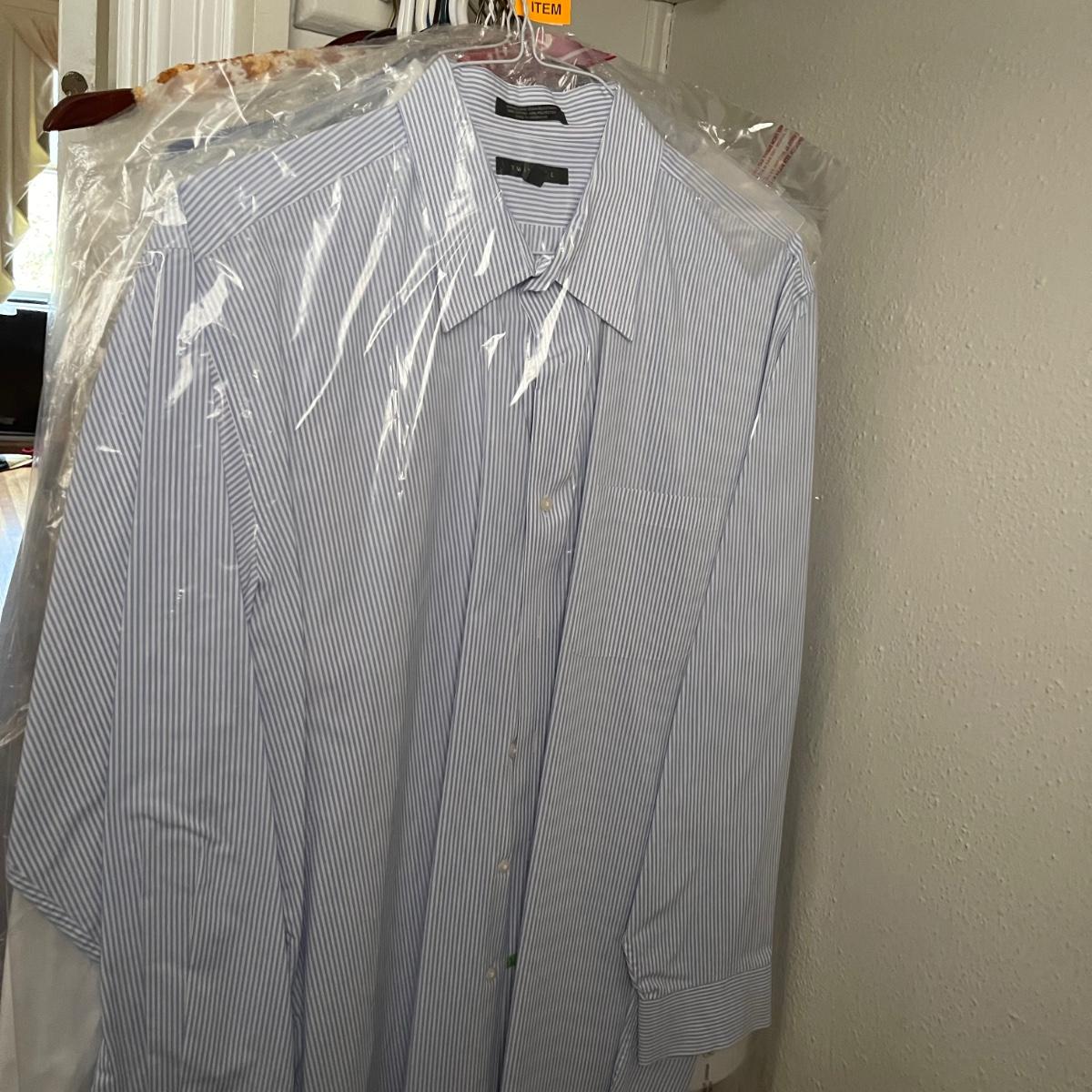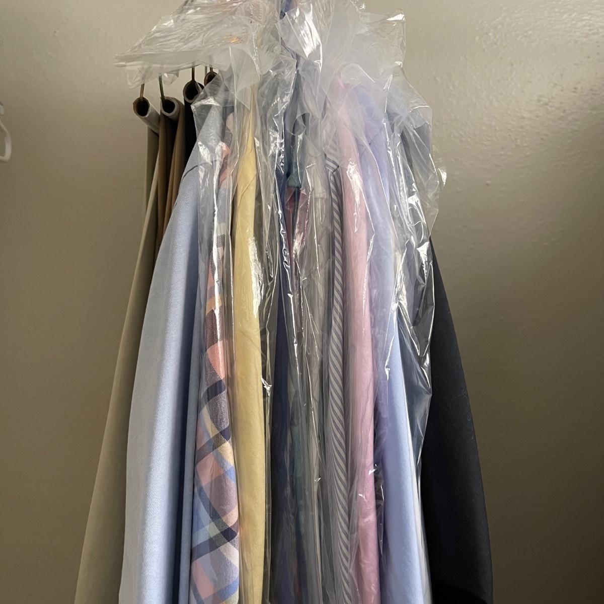 Collection of men’s button-down shirts and slacks of different brands. There are twelve shirts and four pairs of pants. Shirt sizes include XL and 17 - 17.5. All four pairs of pants are 36 x 34.
