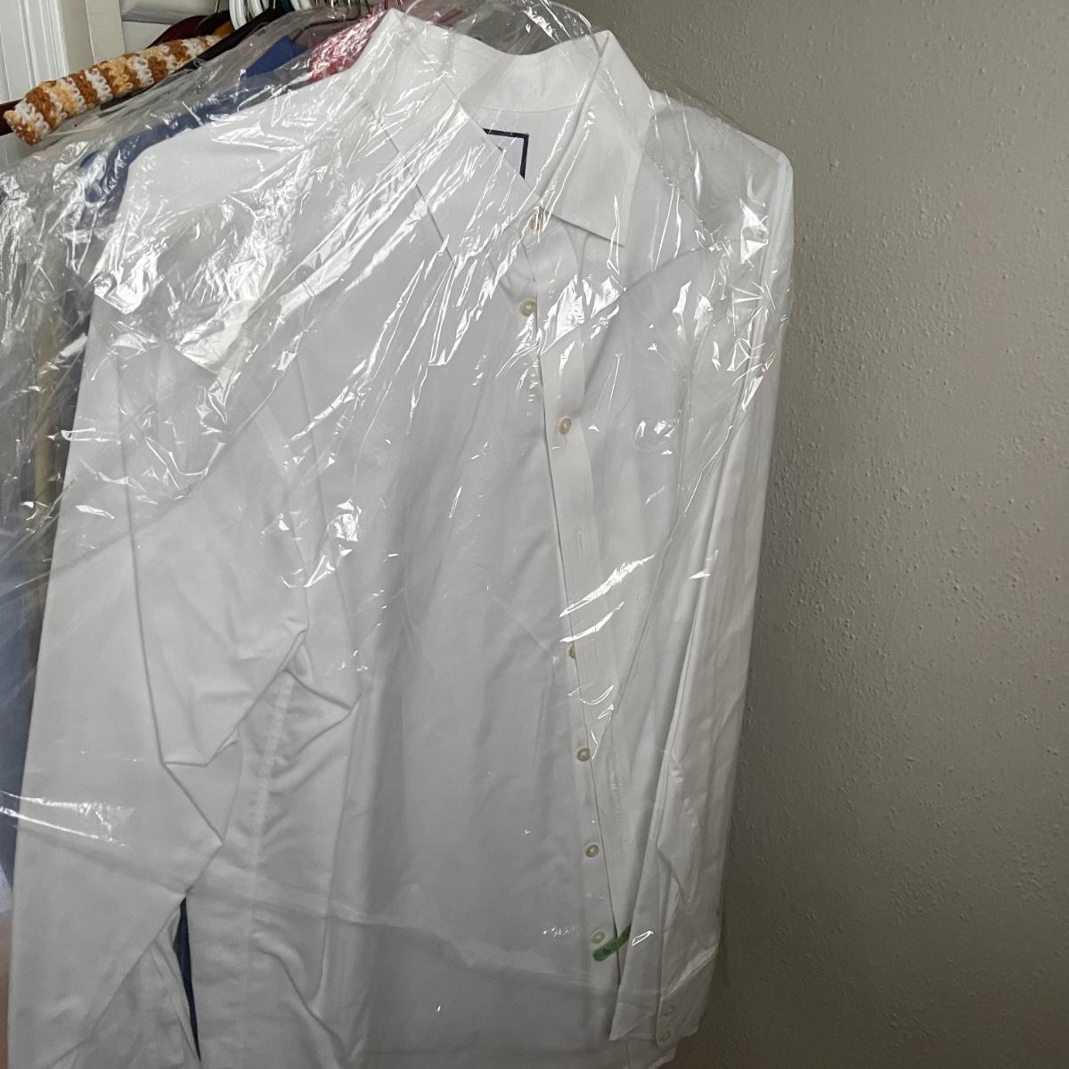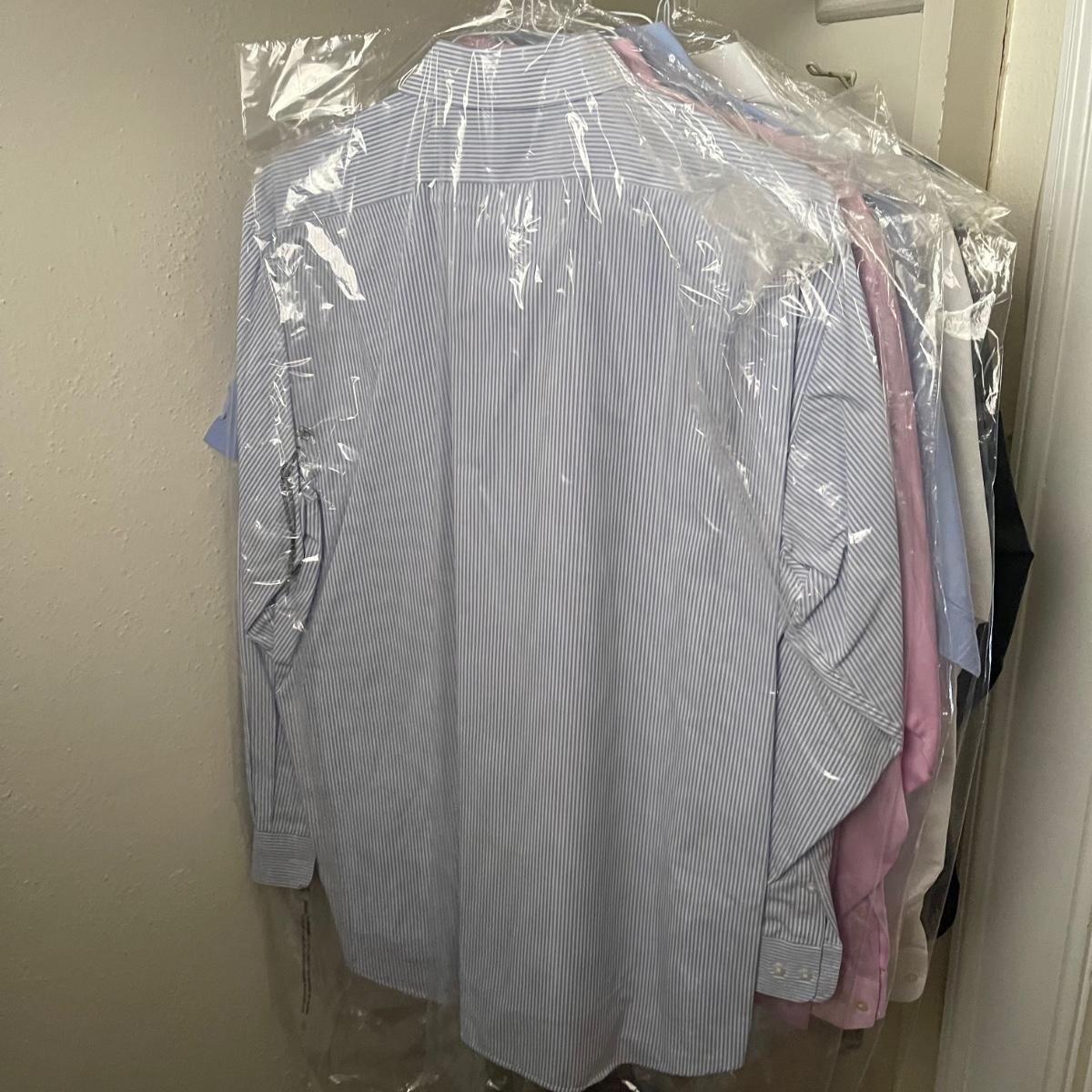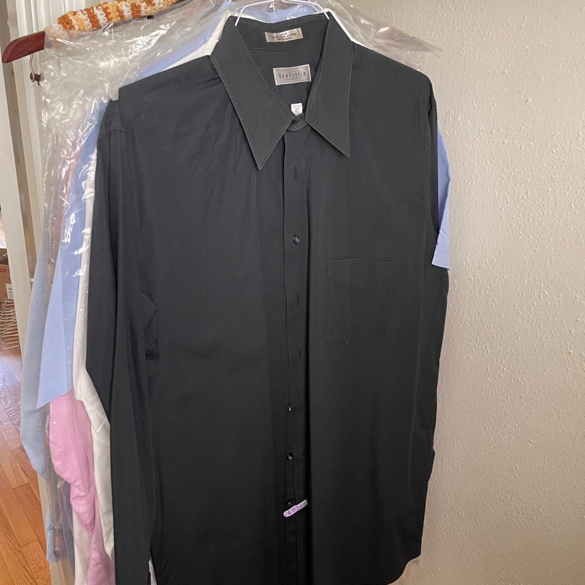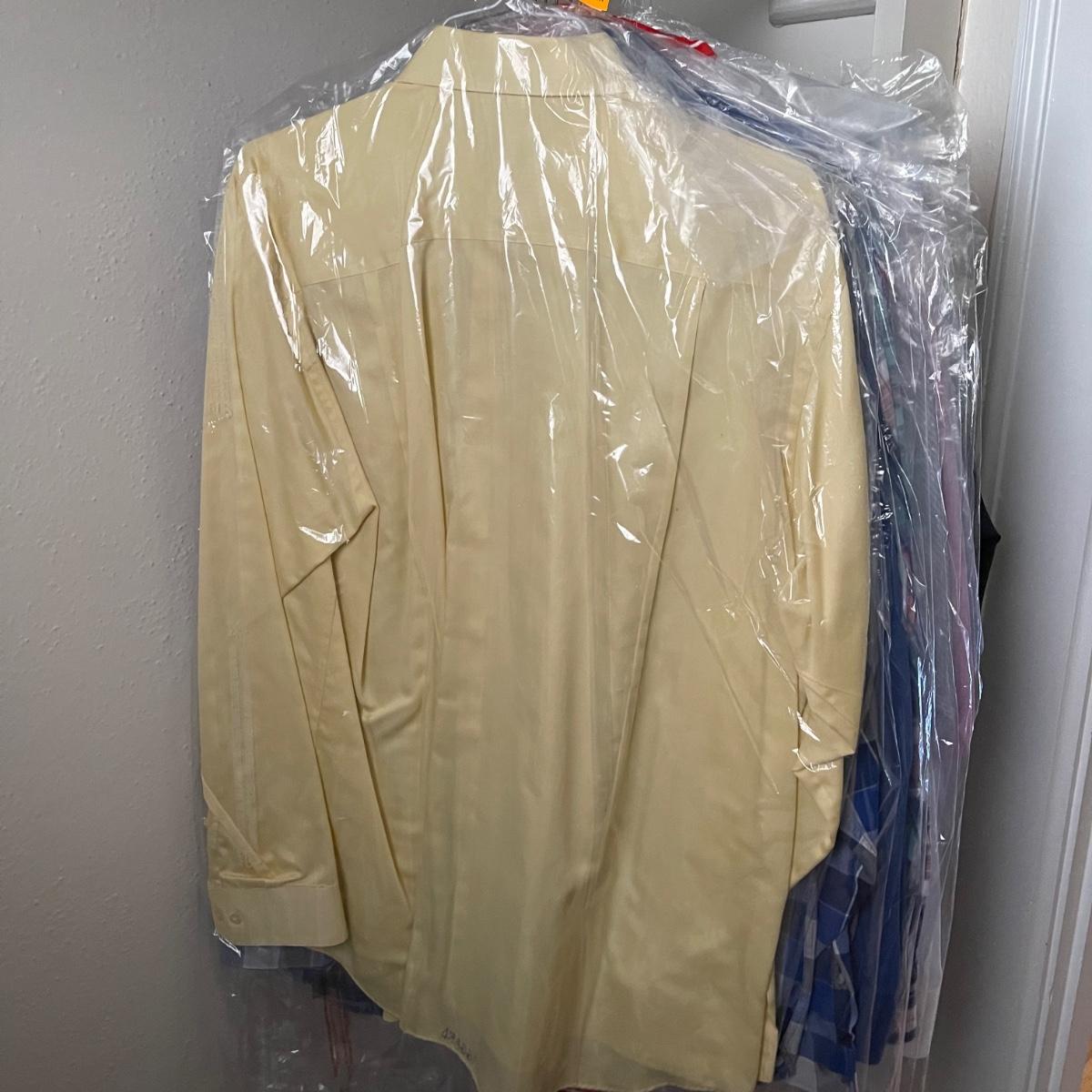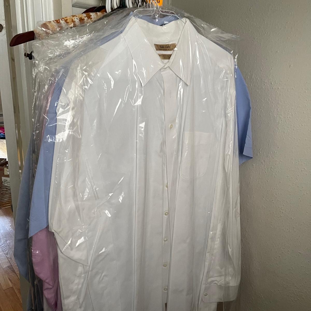Collection of men’s button-down shirts and slacks of different brands. There are twelve shirts and four pairs of pants. Shirt sizes include XL and 17 - 17.5. All four pairs of pants are 36 x 34.
