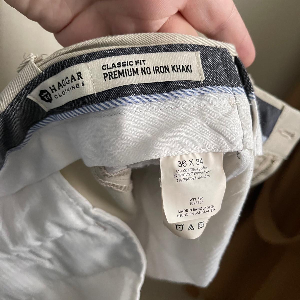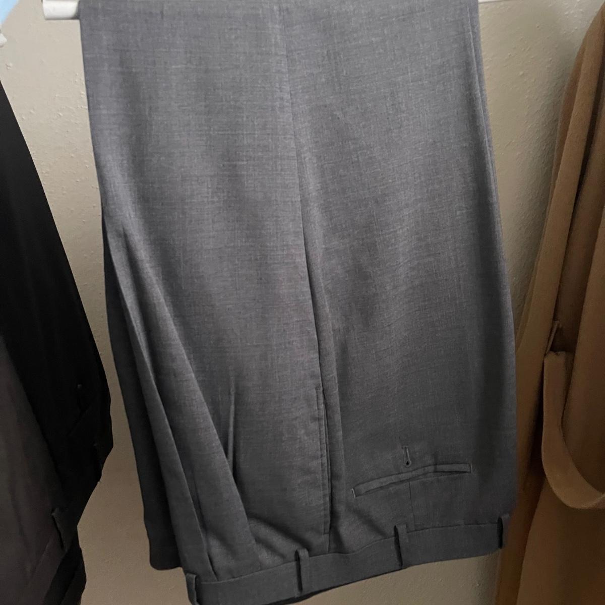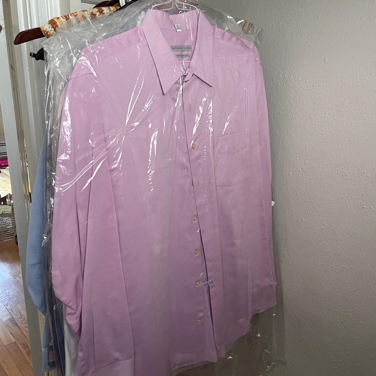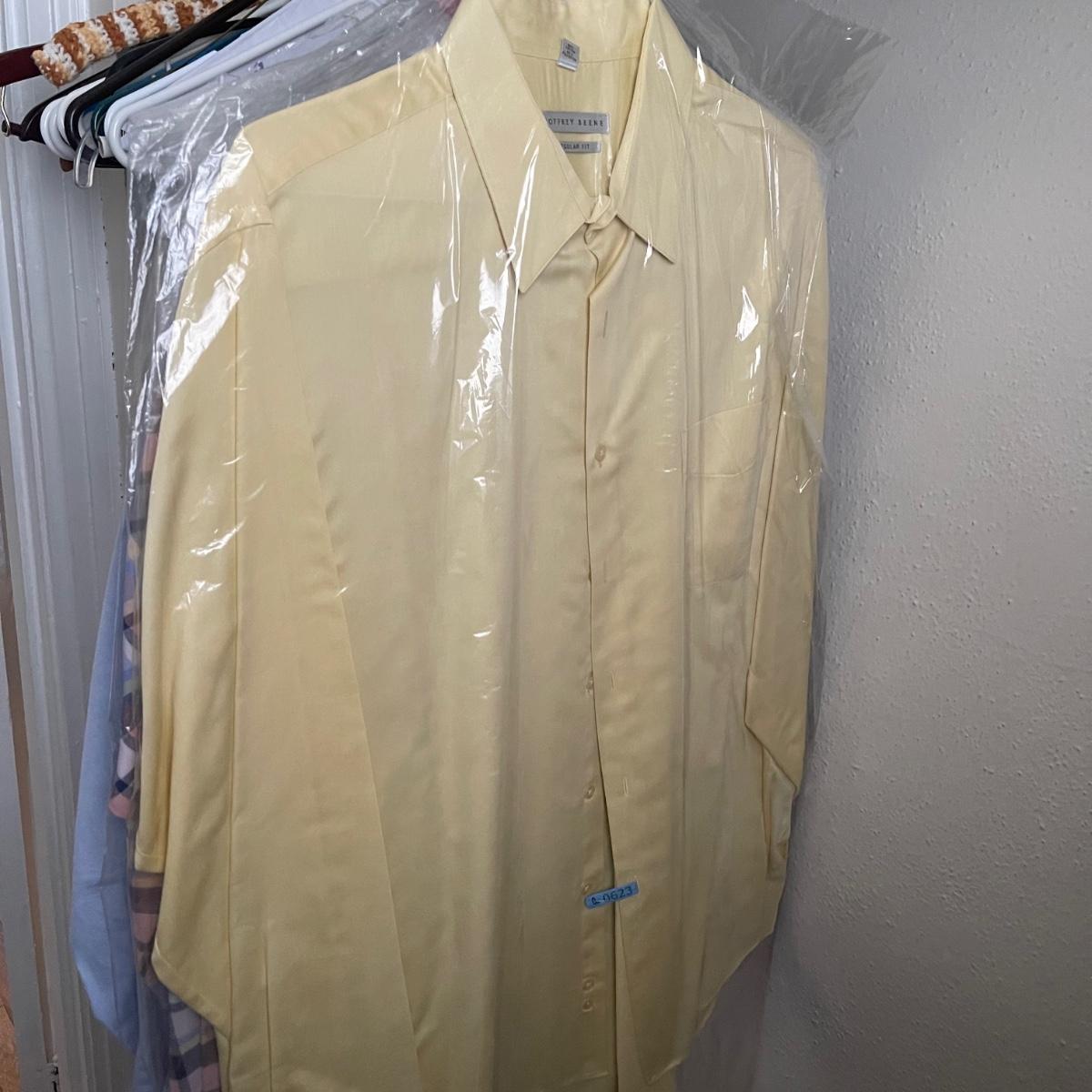 Collection of men’s button-down shirts and slacks of different brands. There are twelve shirts and four pairs of pants. Shirt sizes include XL and 17 - 17.5. All four pairs of pants are 36 x 34.