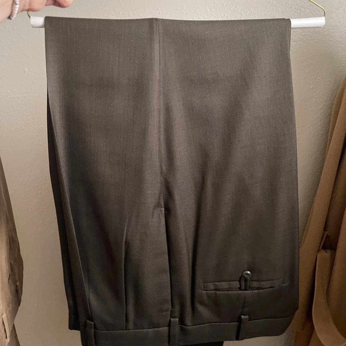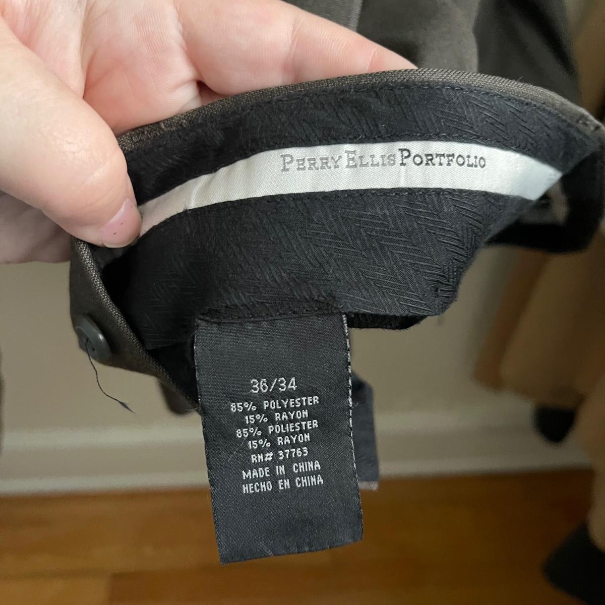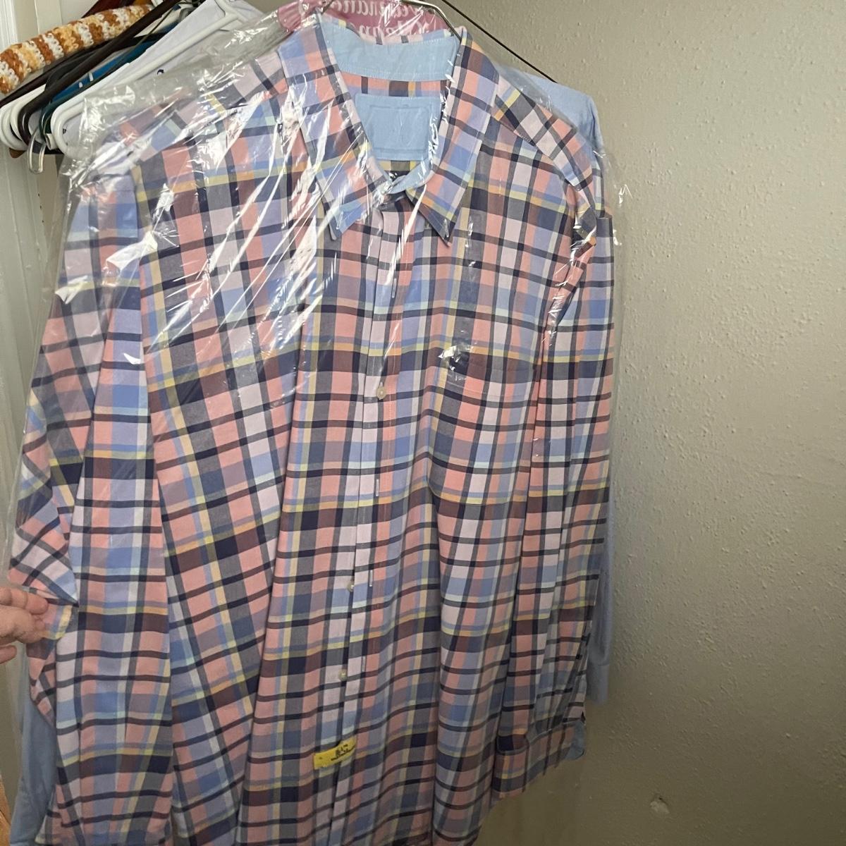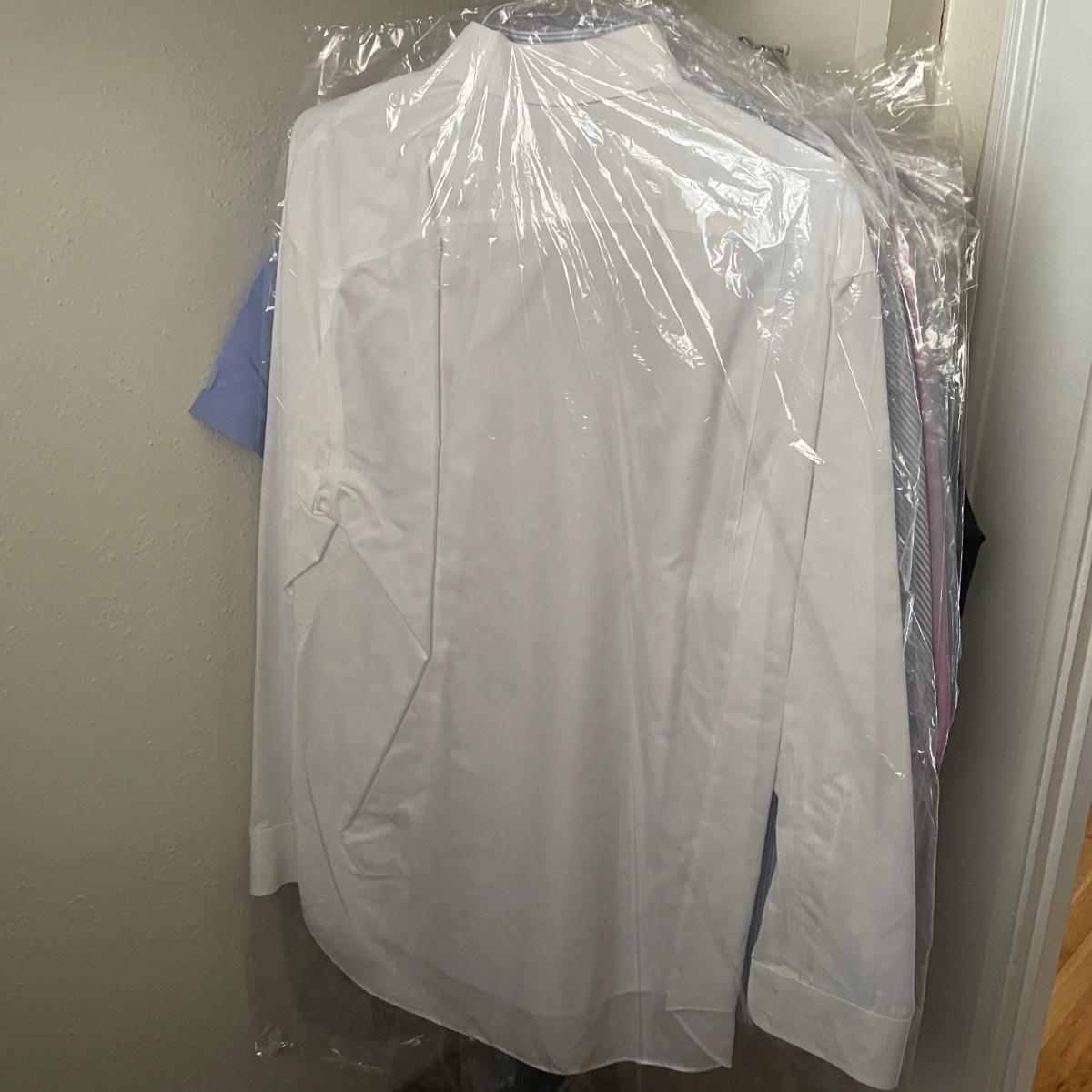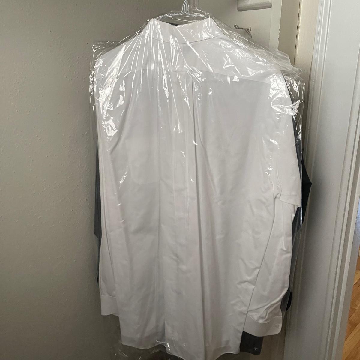 Collection of men’s button-down shirts and slacks of different brands. There are twelve shirts and four pairs of pants. Shirt sizes include XL and 17 - 17.5. All four pairs of pants are 36 x 34.