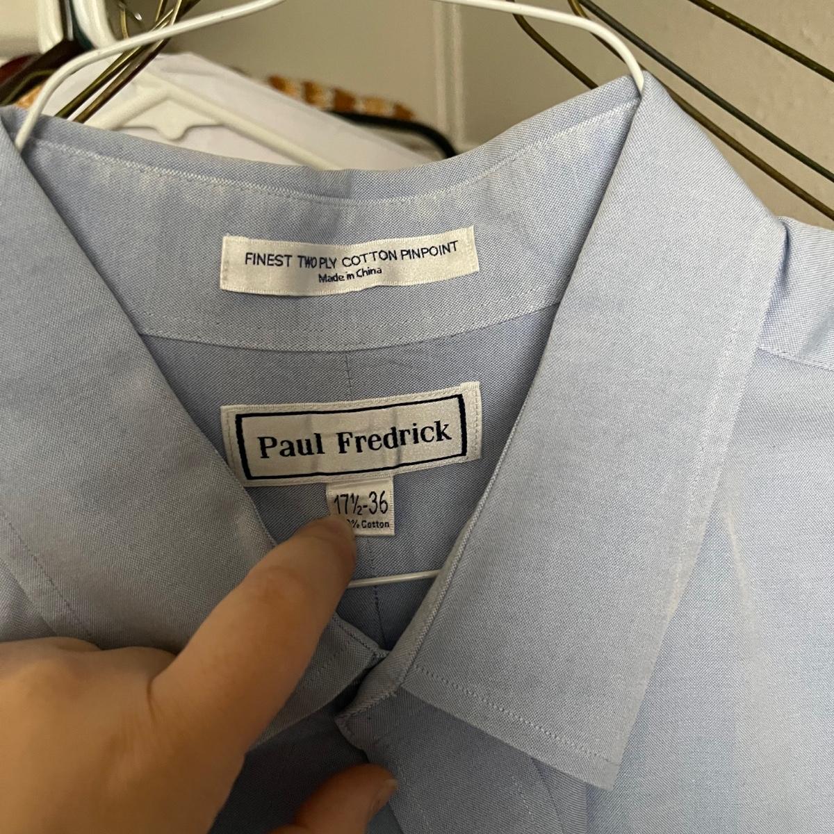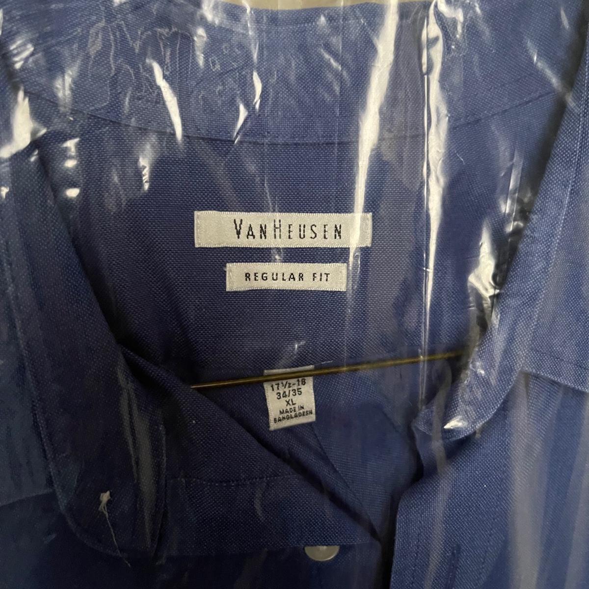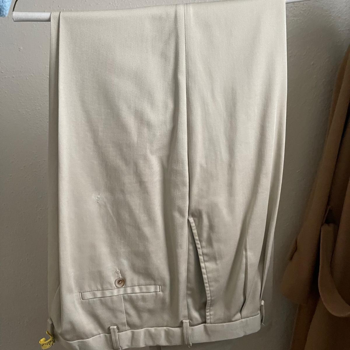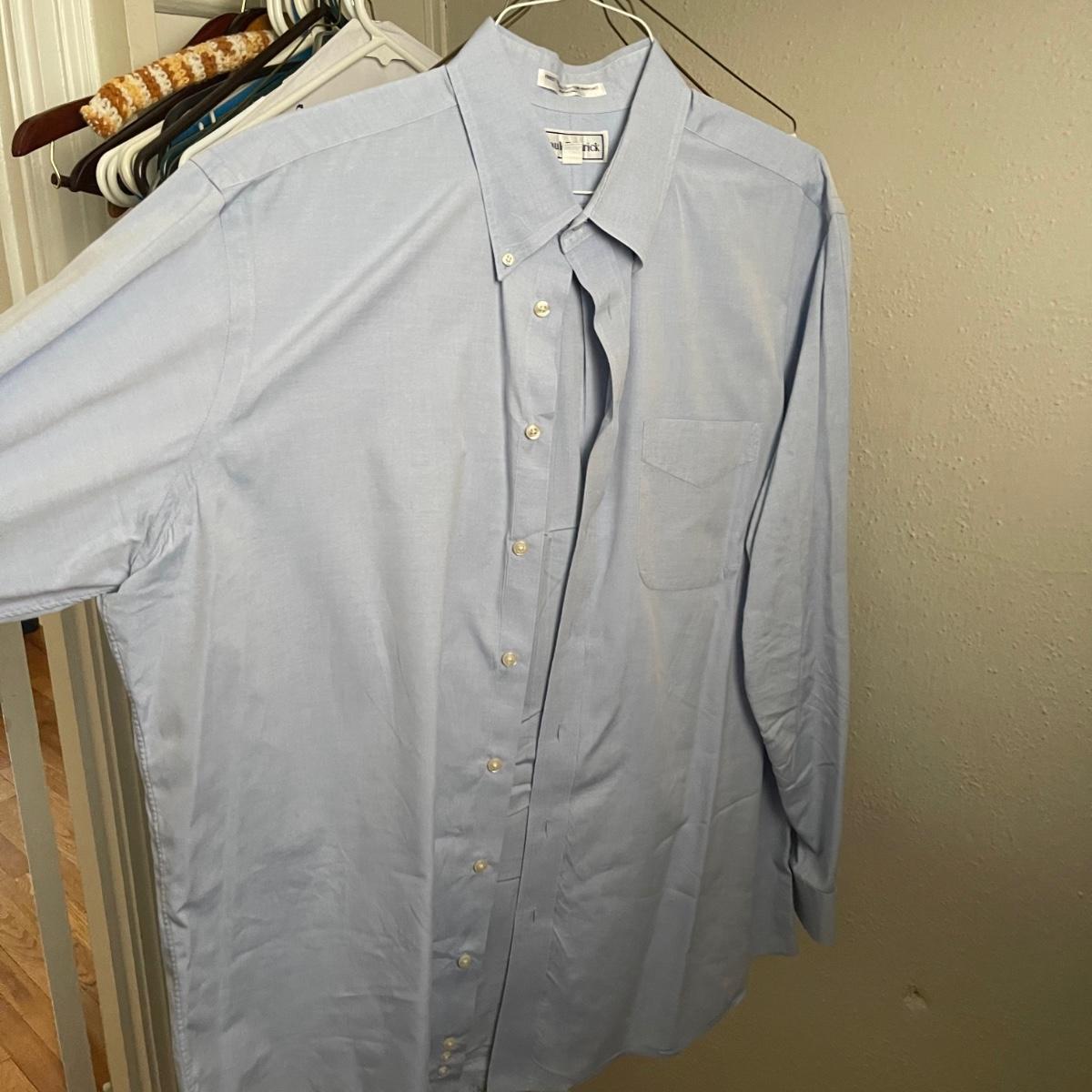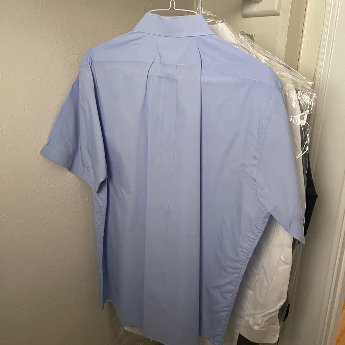 Collection of men’s button-down shirts and slacks of different brands. There are twelve shirts and four pairs of pants. Shirt sizes include XL and 17 - 17.5. All four pairs of pants are 36 x 34.