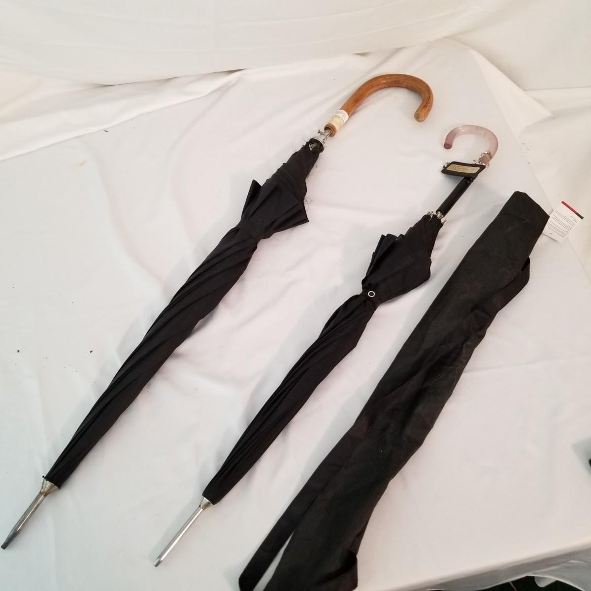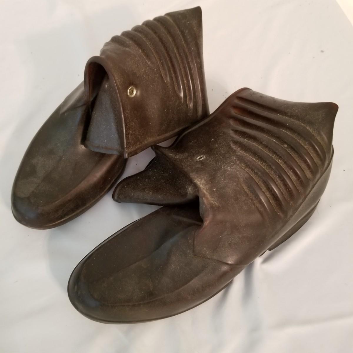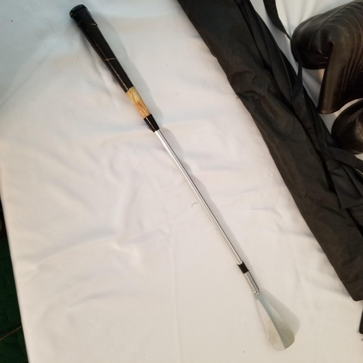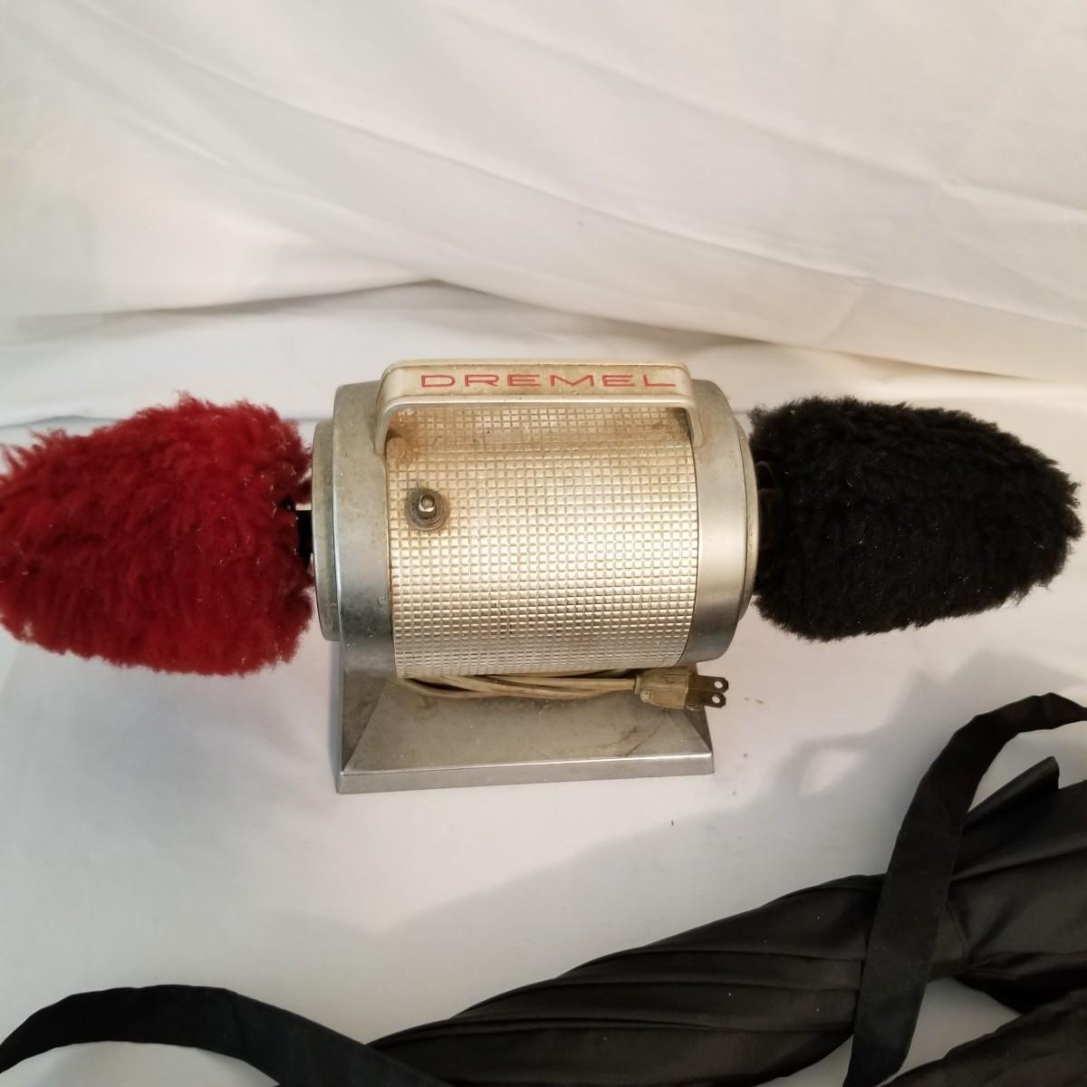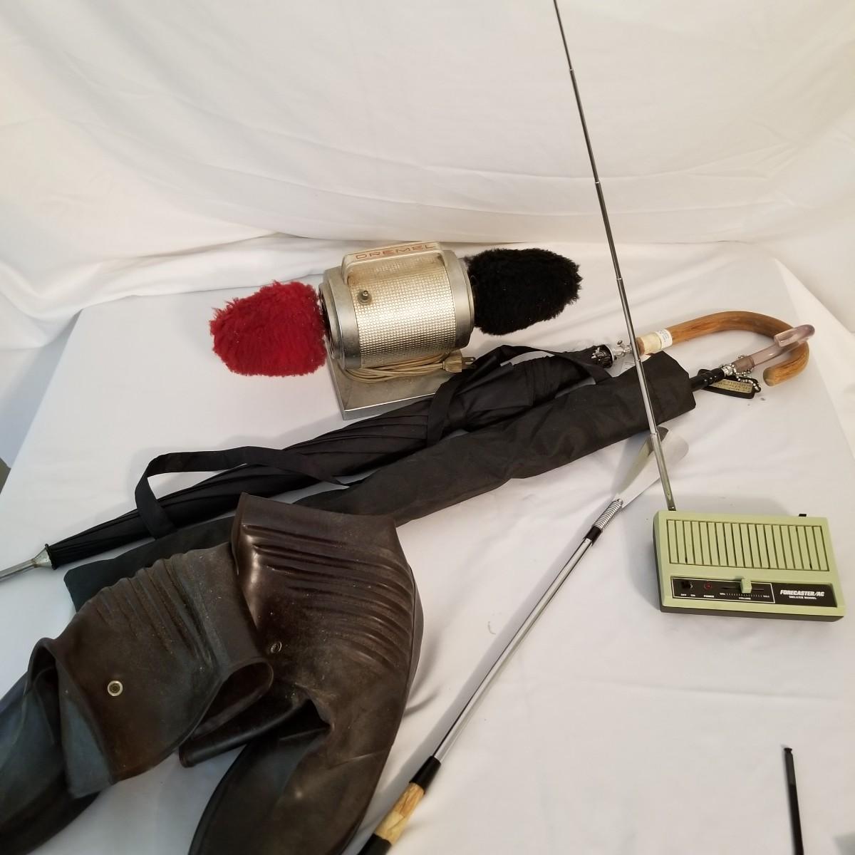 Two black umbrellas, one extension shoe horn, one pair overshoe galoshes, size large. A battery operated weather radio, tested and worked. And one Dremel powered shoe polisher, also tested and worked. All items in fair to good condition. Shipping available.