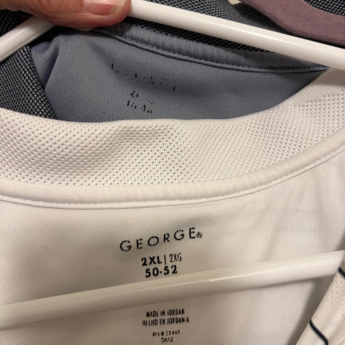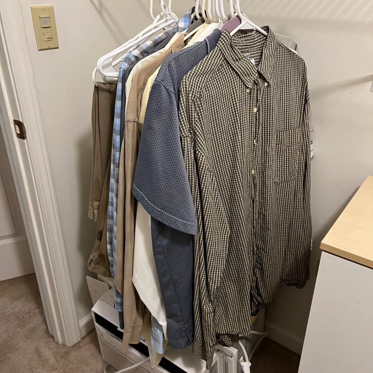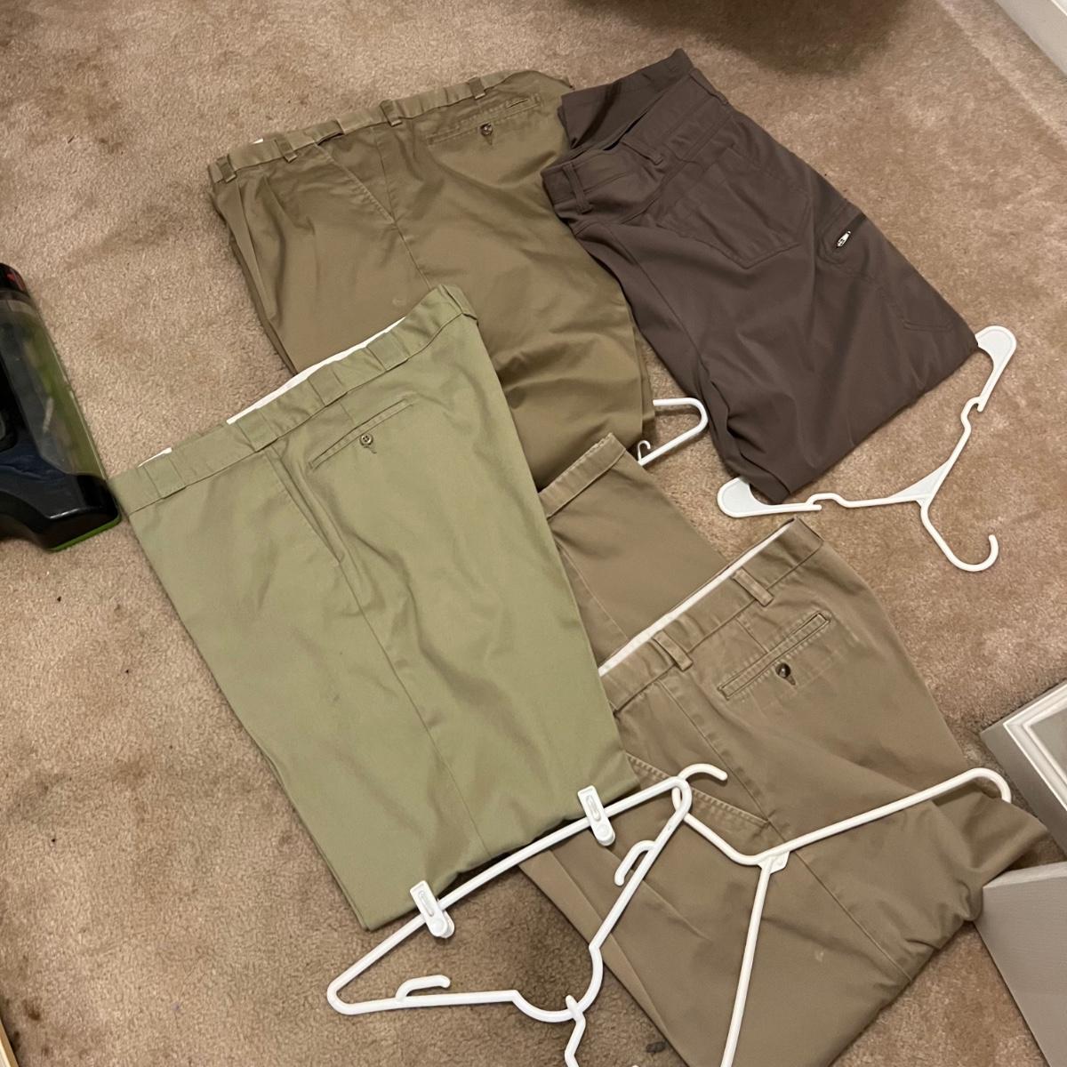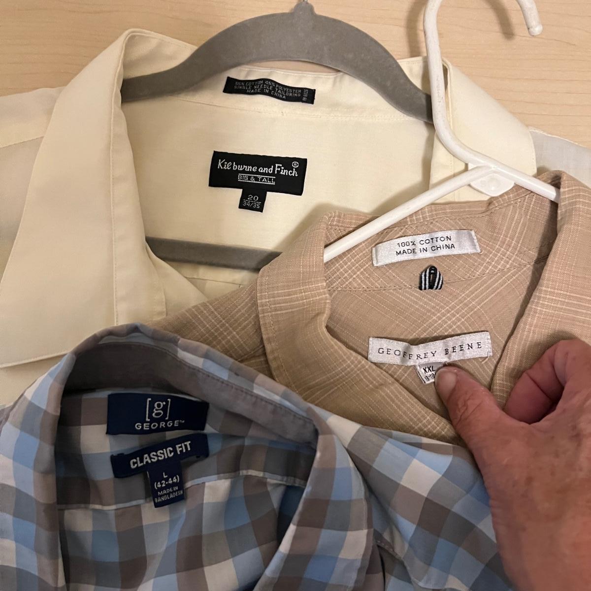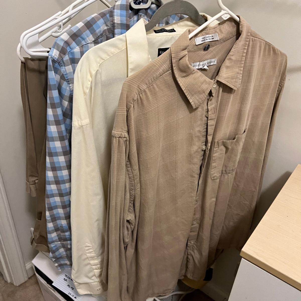 Four pairs of Khaki pants and approximately a dozen short plus long sleeved shirts are all in the size range of XL to XXL. See images for brands, sizes etc. the grey George long sleeve shirt has a small stain.