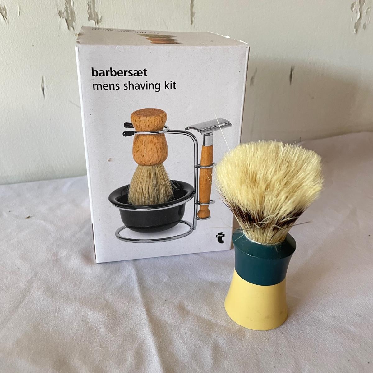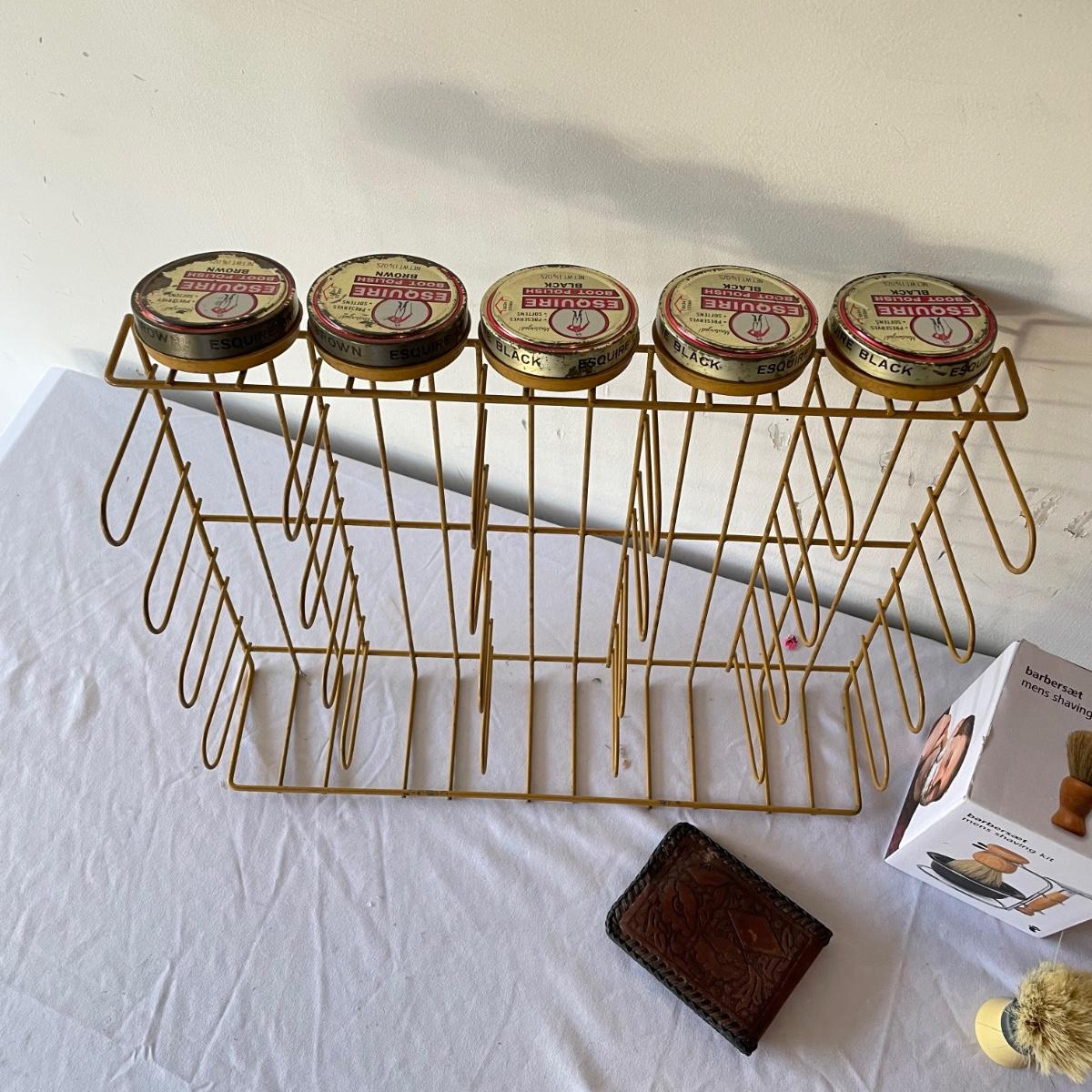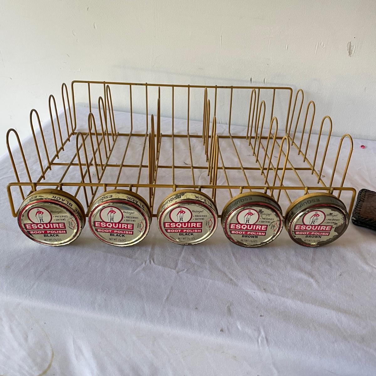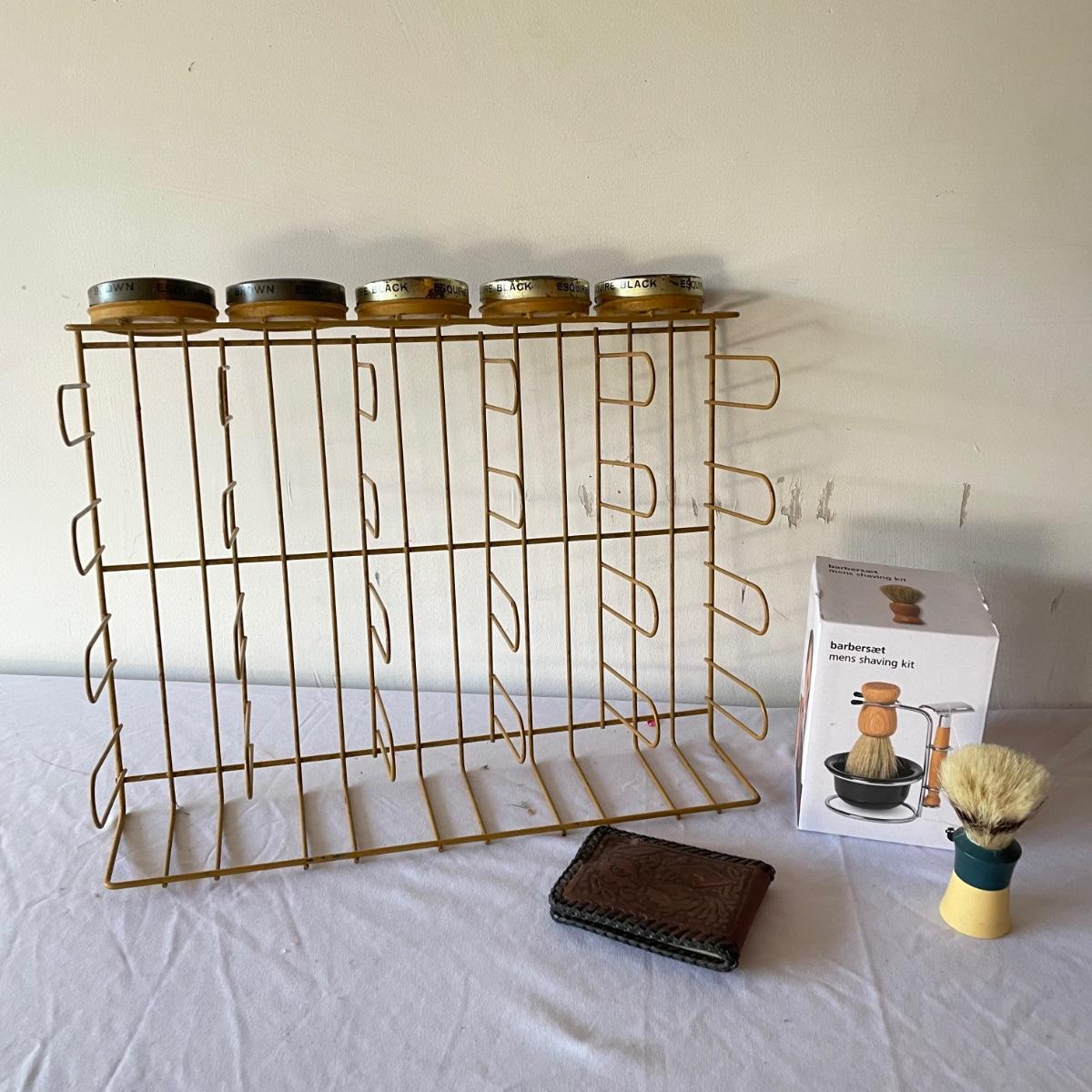 New and vintage mens items. A painted metal Esquire Boot Polish sales rack measures 12” x 16” x 4”. An intricate leather wallet made of leather and appearing unused yet vintage and in need of mild cleaning. Lot also includes an unopened Barberset mens shaving kit and one extra brush. See images. Local pick up only.