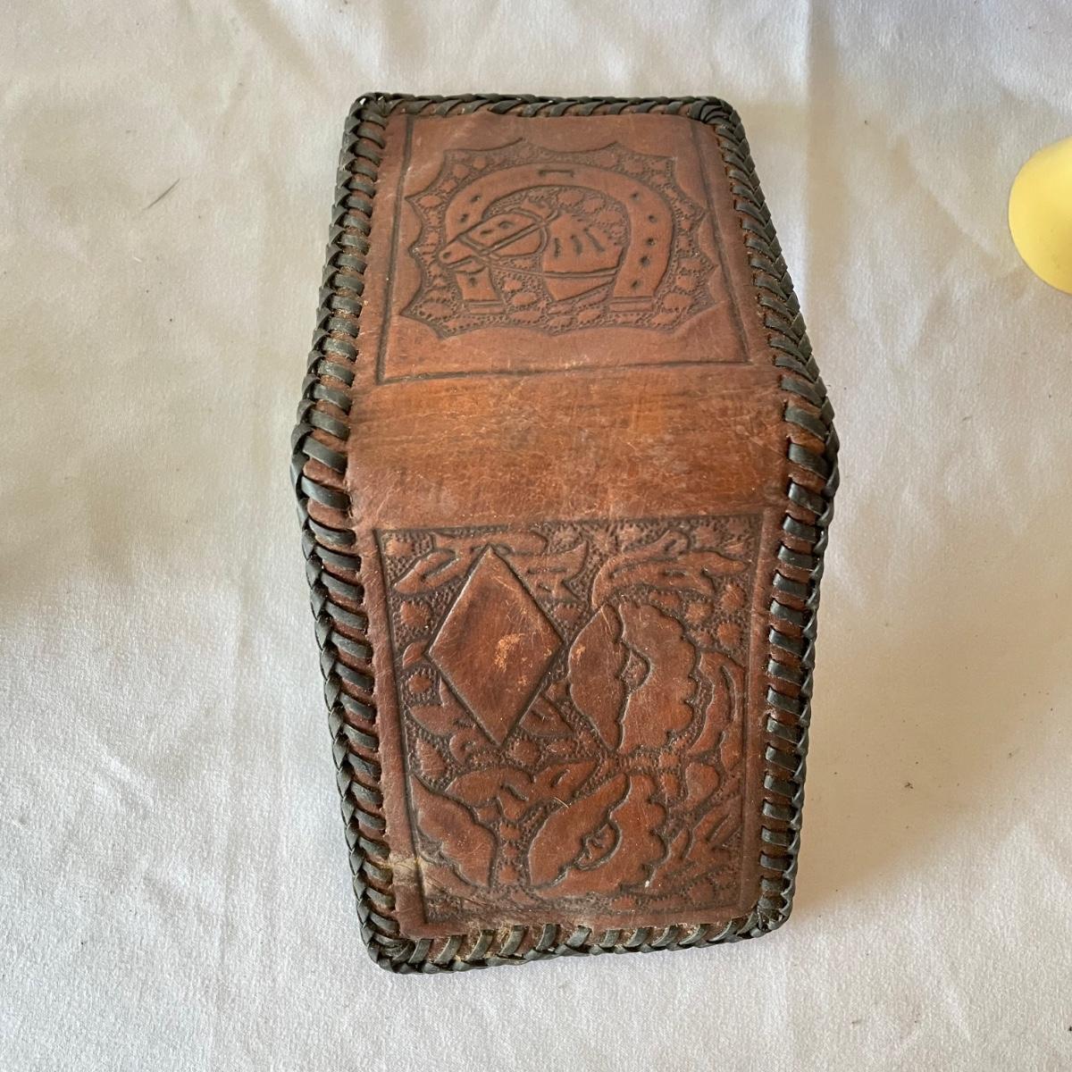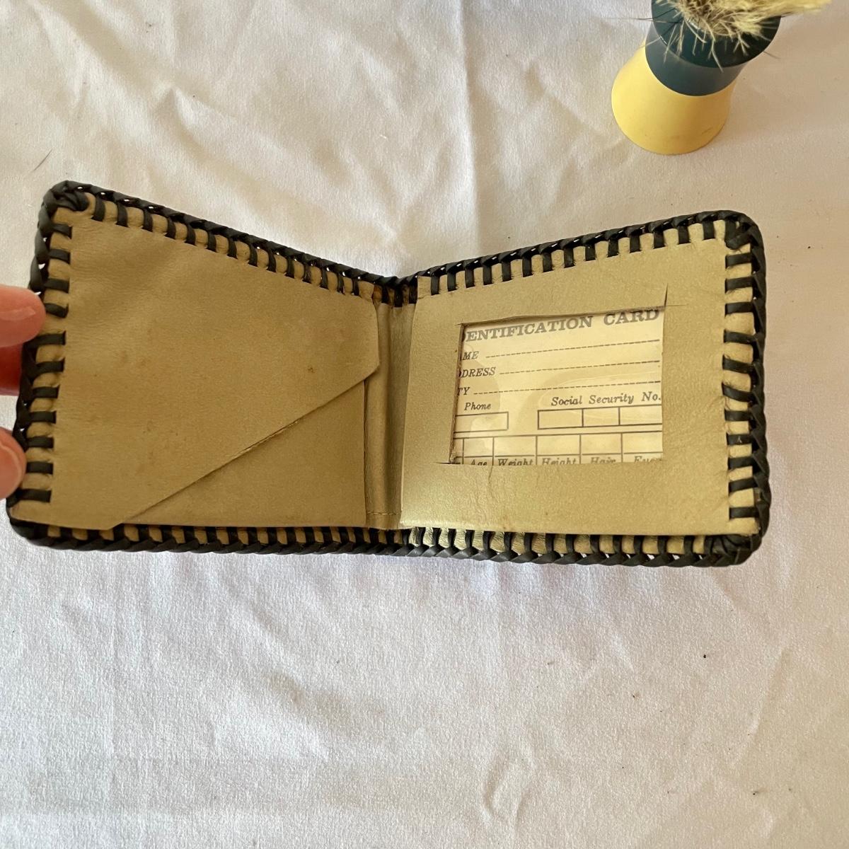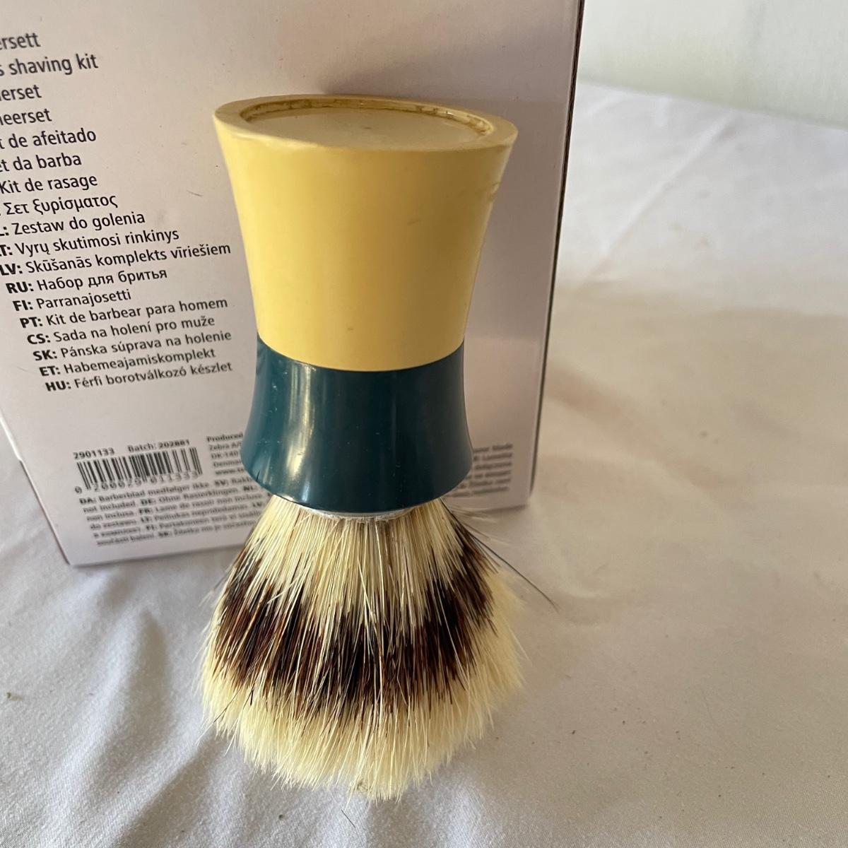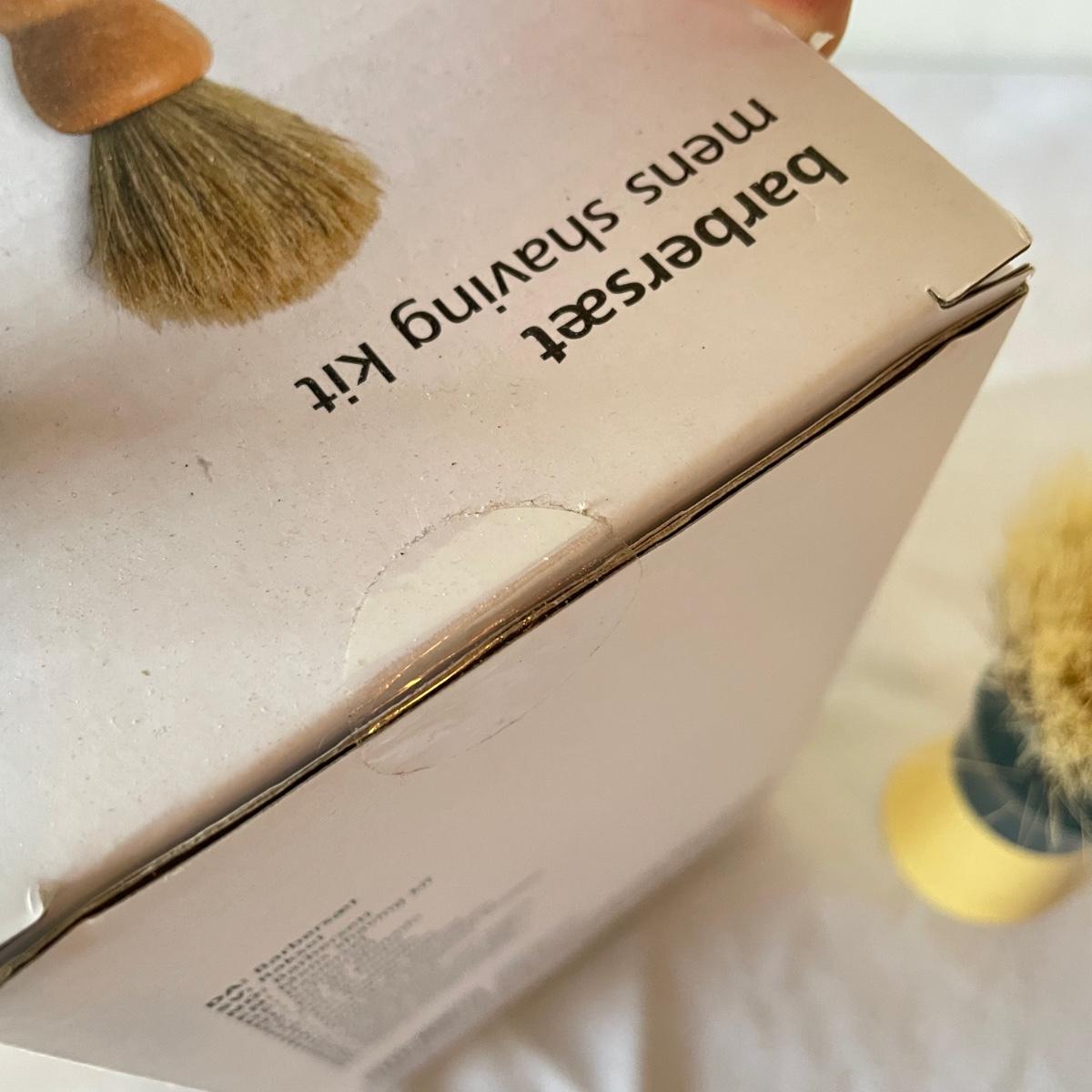 New and vintage mens items. A painted metal Esquire Boot Polish sales rack measures 12” x 16” x 4”. An intricate leather wallet made of leather and appearing unused yet vintage and in need of mild cleaning. Lot also includes an unopened Barberset mens shaving kit and one extra brush. See images. Local pick up only.
