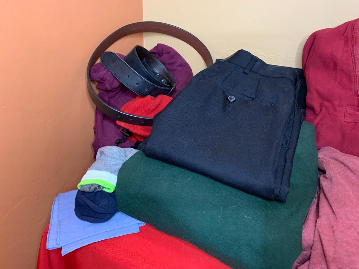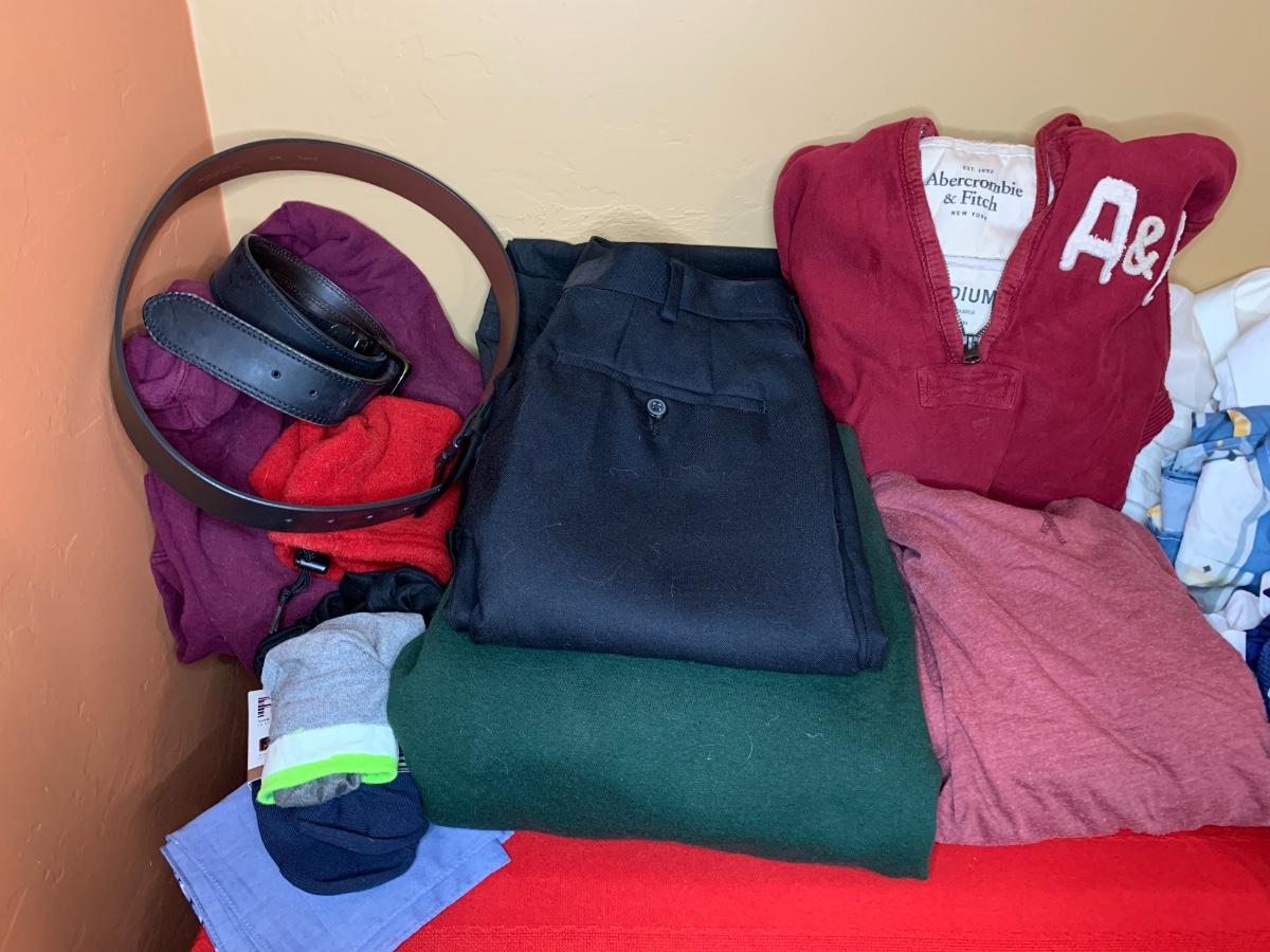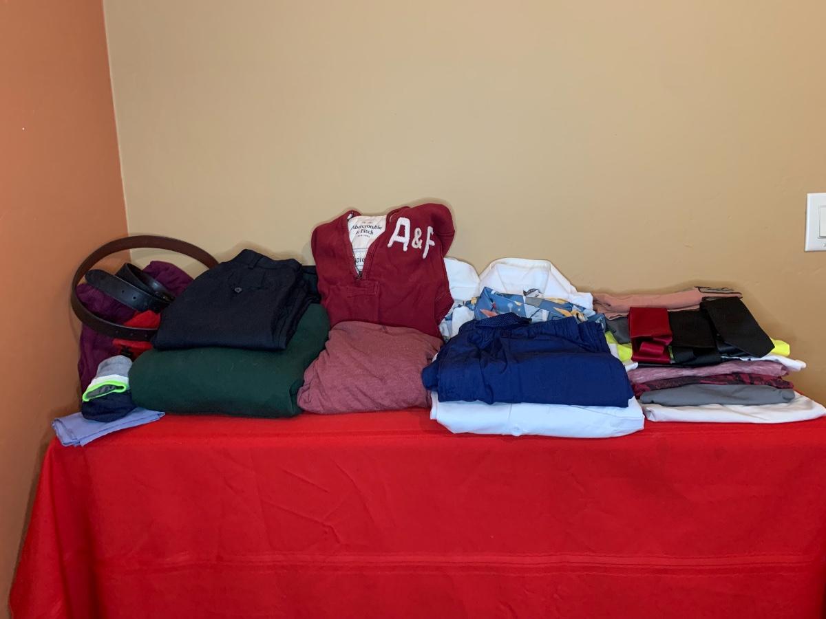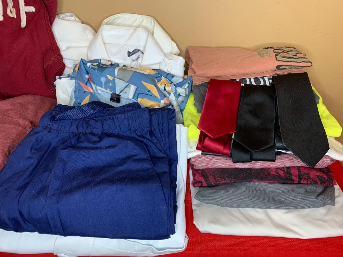 An assortment of mens clothing size medium including shirts, button downs, jackets and more. Includes both casual, athleisure and dress options. All in good condition