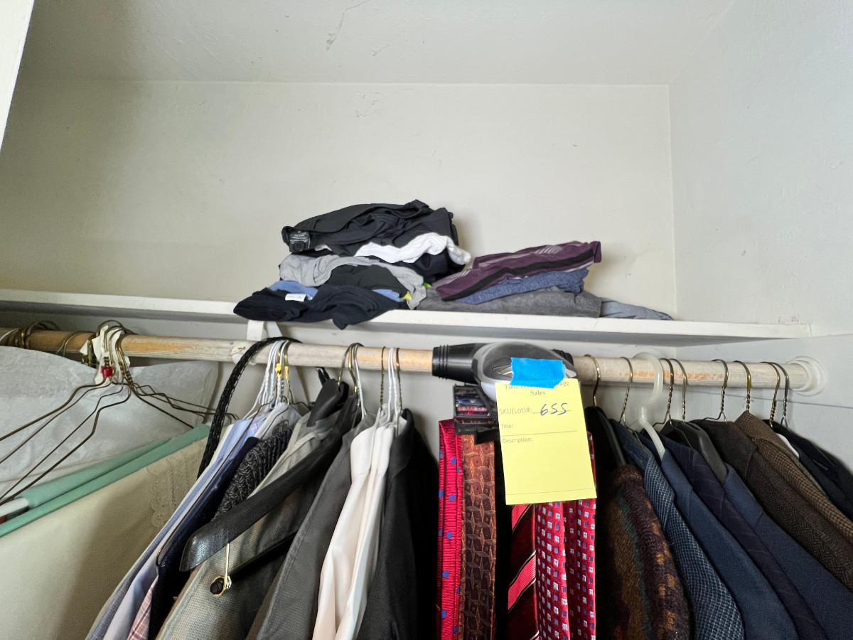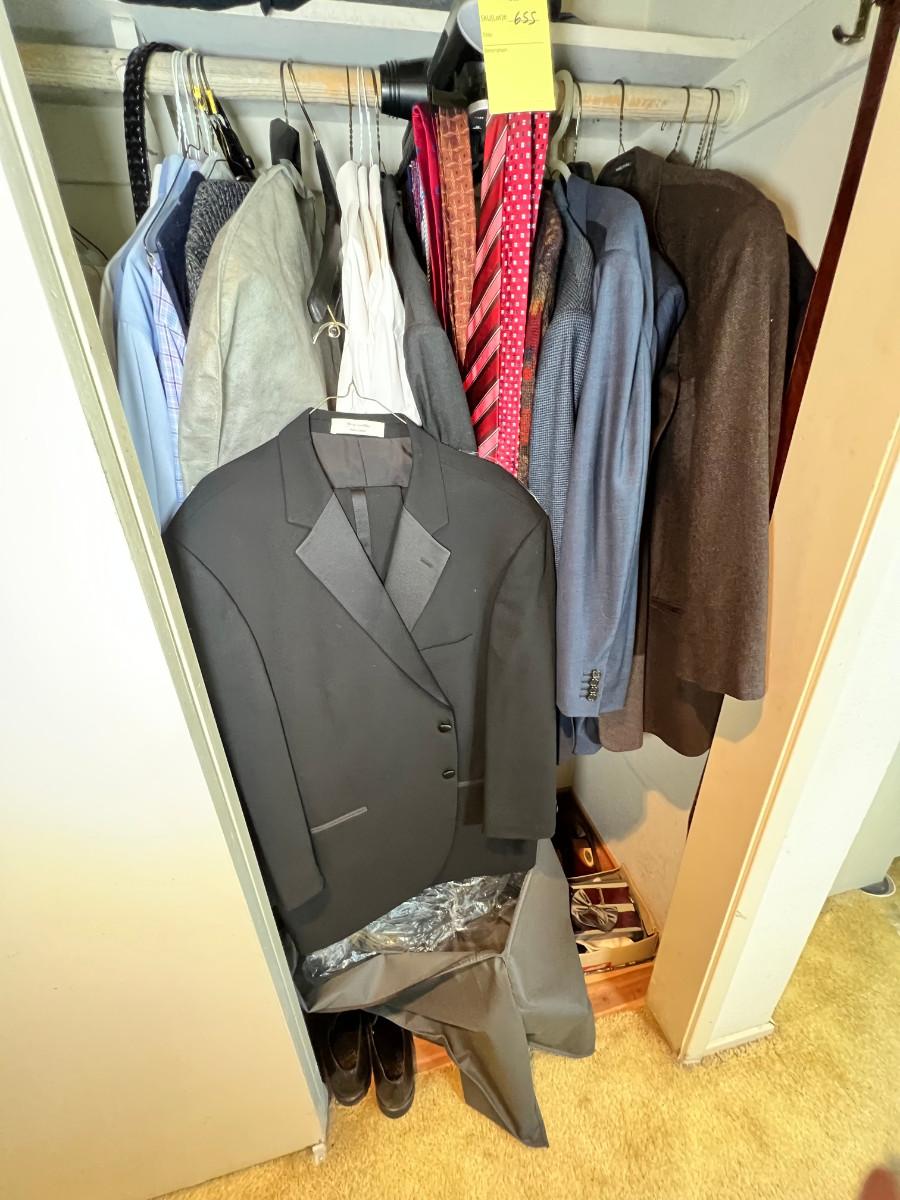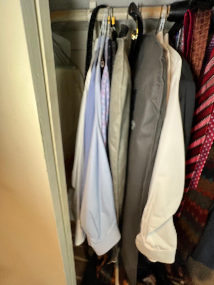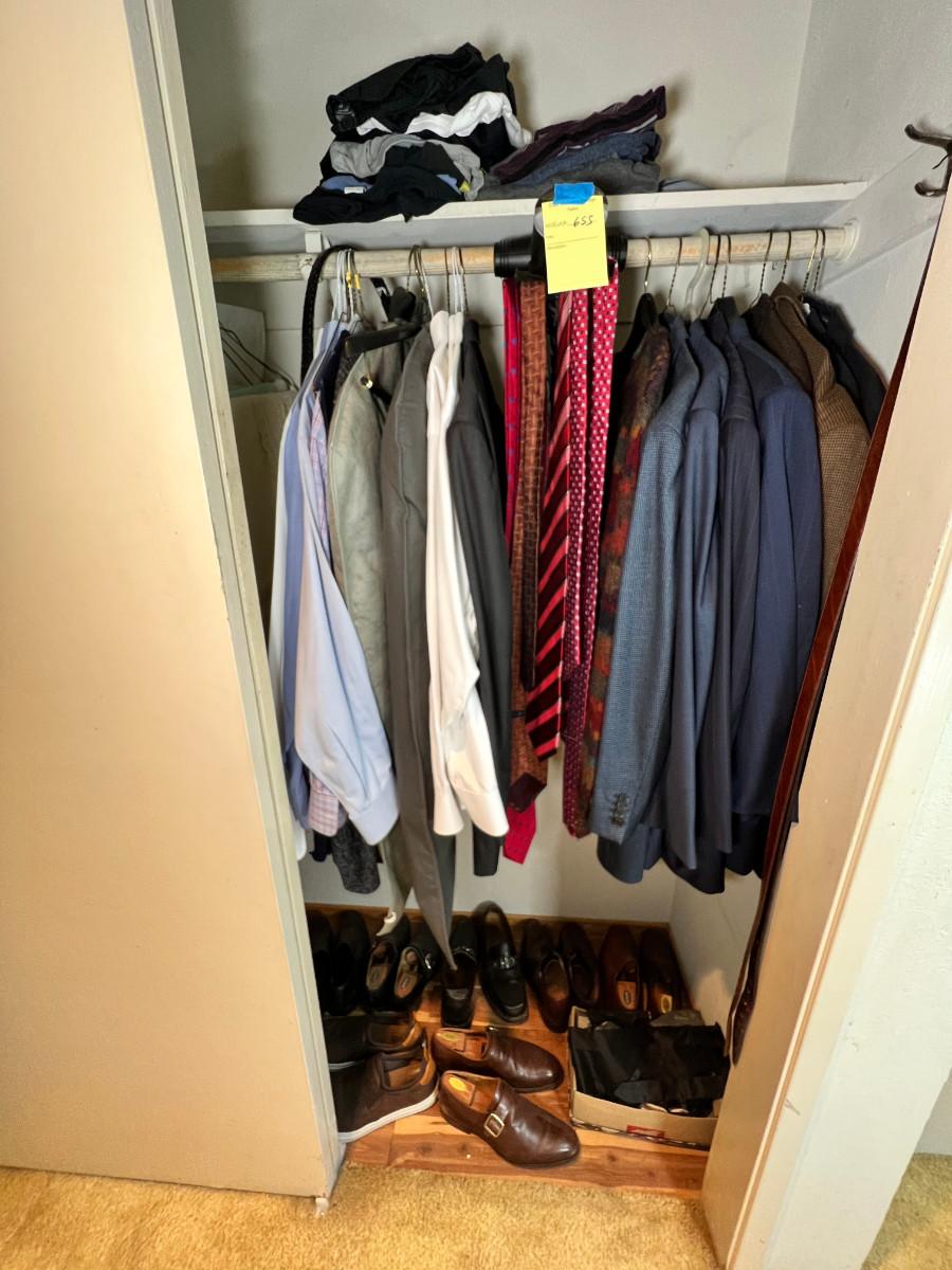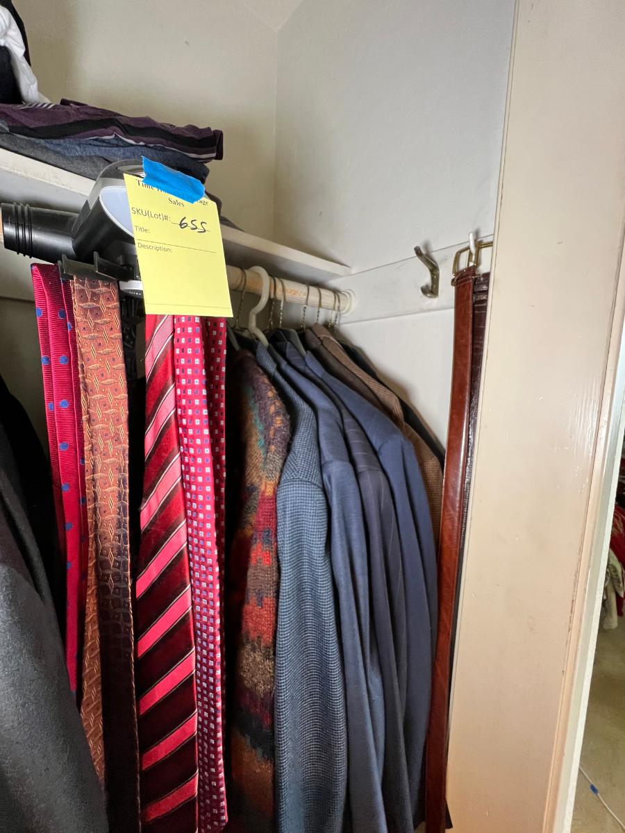 Owner was 32/32 most of his life though there are some larger sizes. Automatic tie rack with silk ties. Suits are handmade mostly in Europe. Tuxedo from Nordstroms fine men's depart, some casual clothes and tee shirts but mostly office formal owner was a judge.