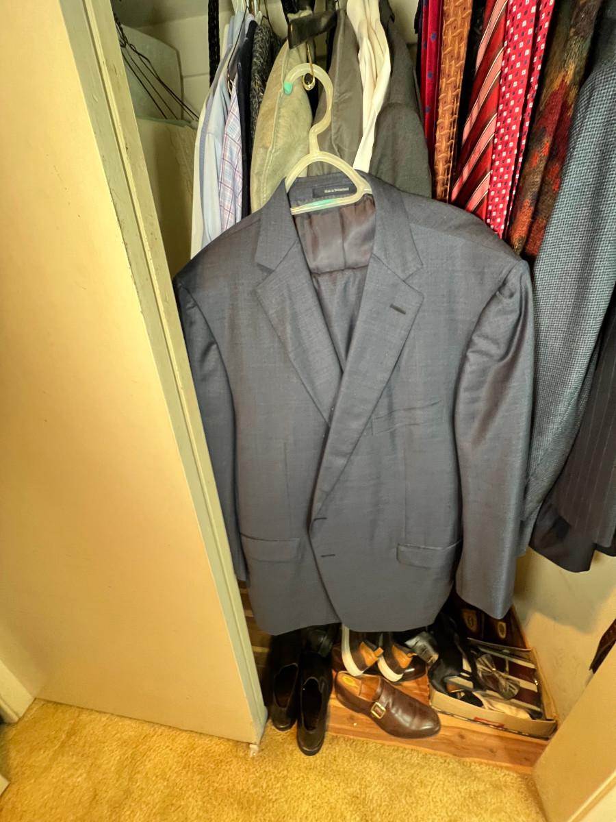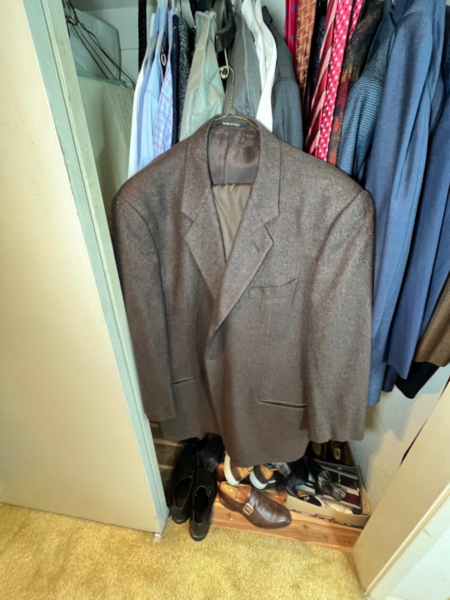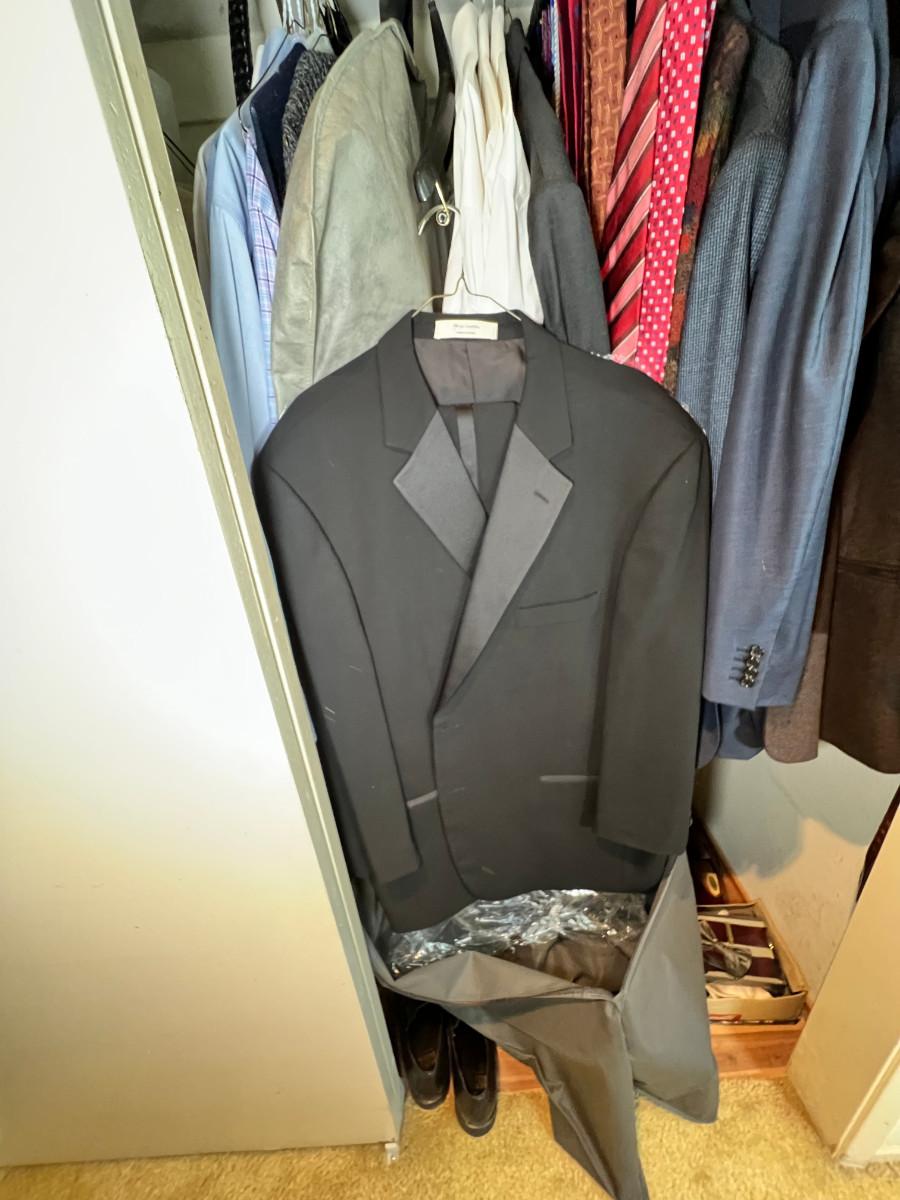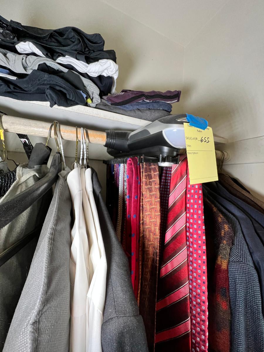Owner was 32/32 most of his life though there are some larger sizes. Automatic tie rack with silk ties. Suits are handmade mostly in Europe. Tuxedo from Nordstroms fine men's depart, some casual clothes and tee shirts but mostly office formal owner was a judge.