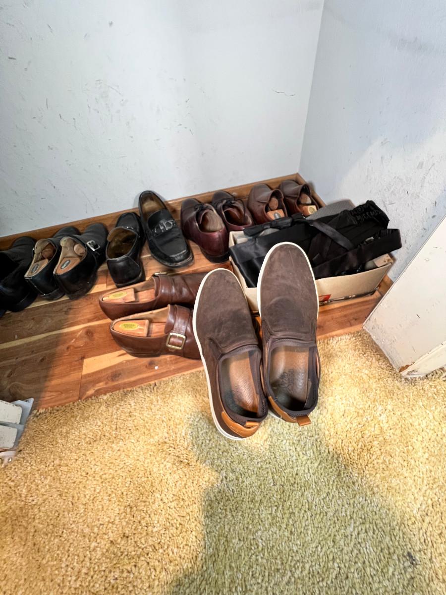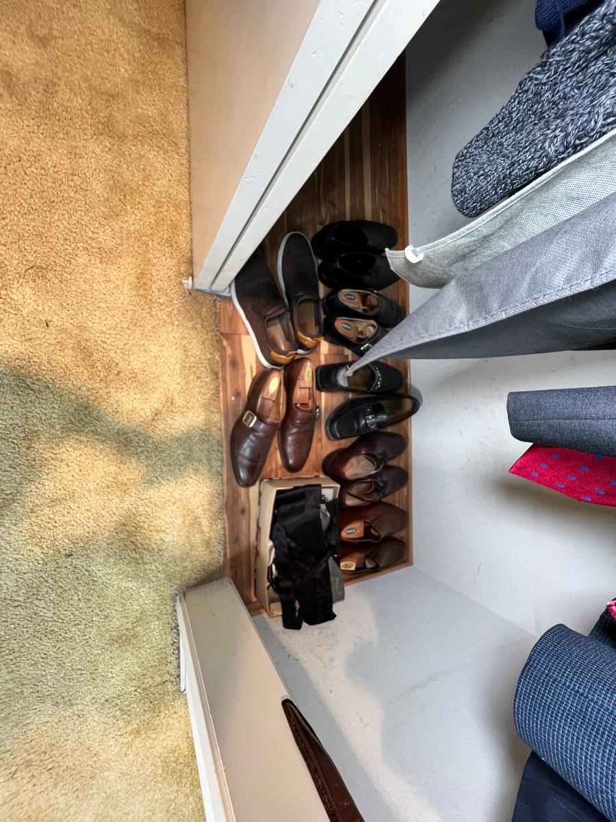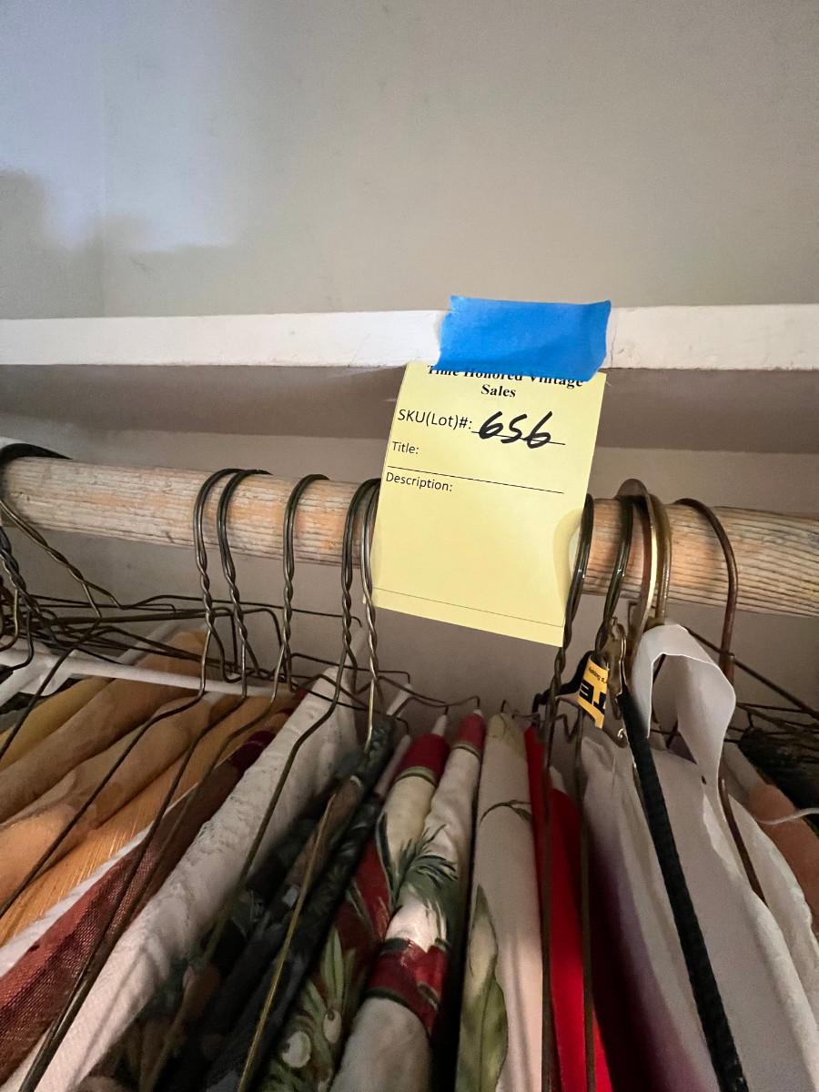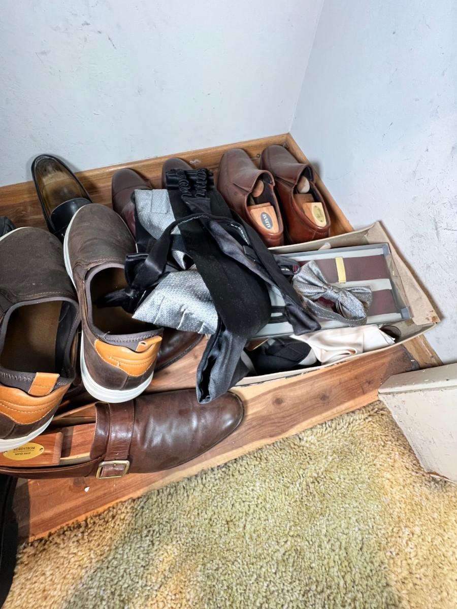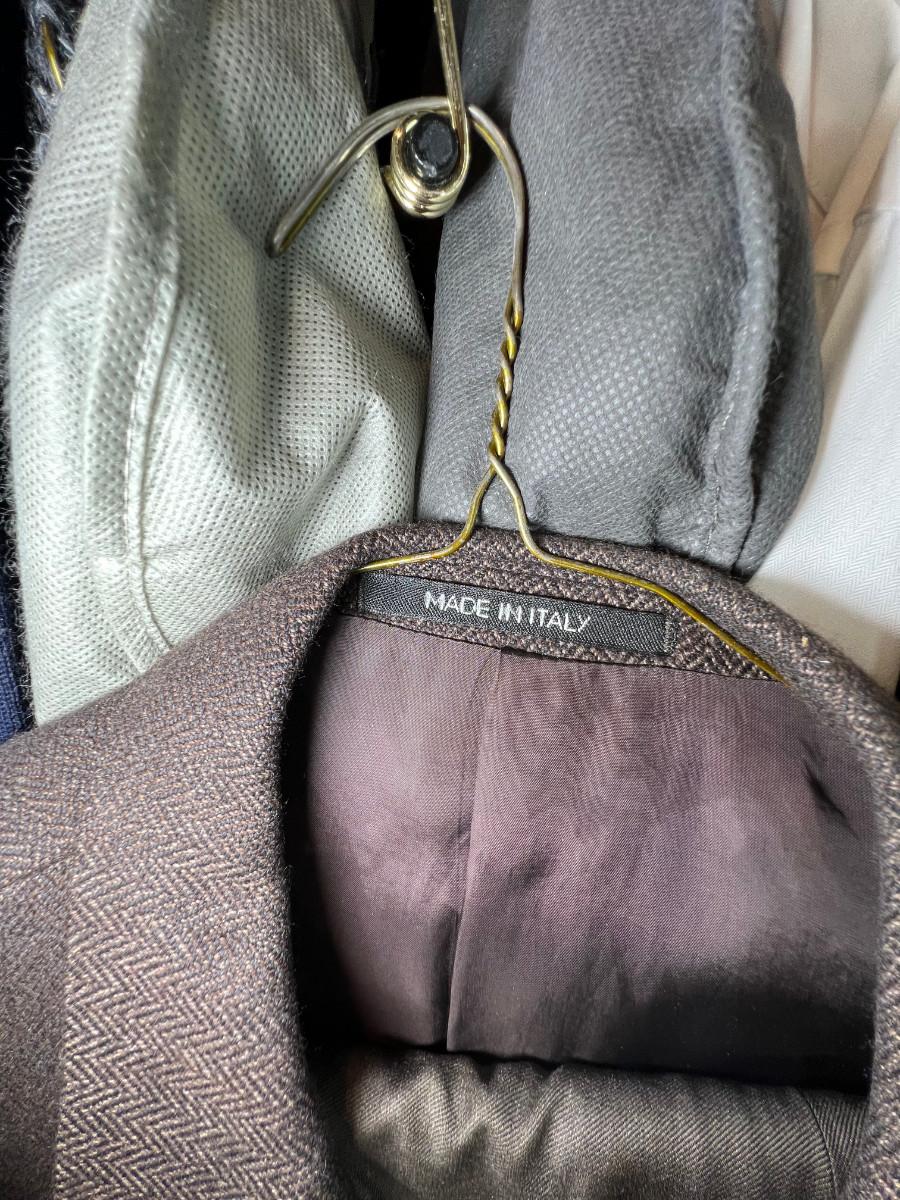 Owner was 32/32 most of his life though there are some larger sizes. Automatic tie rack with silk ties. Suits are handmade mostly in Europe. Tuxedo from Nordstroms fine men's depart, some casual clothes and tee shirts but mostly office formal owner was a judge.