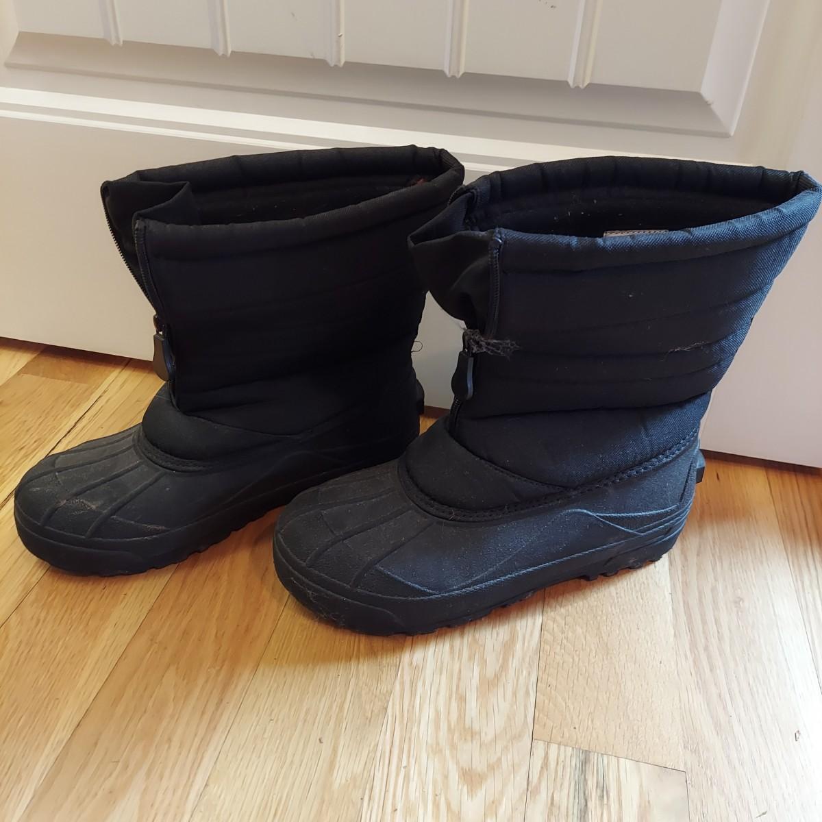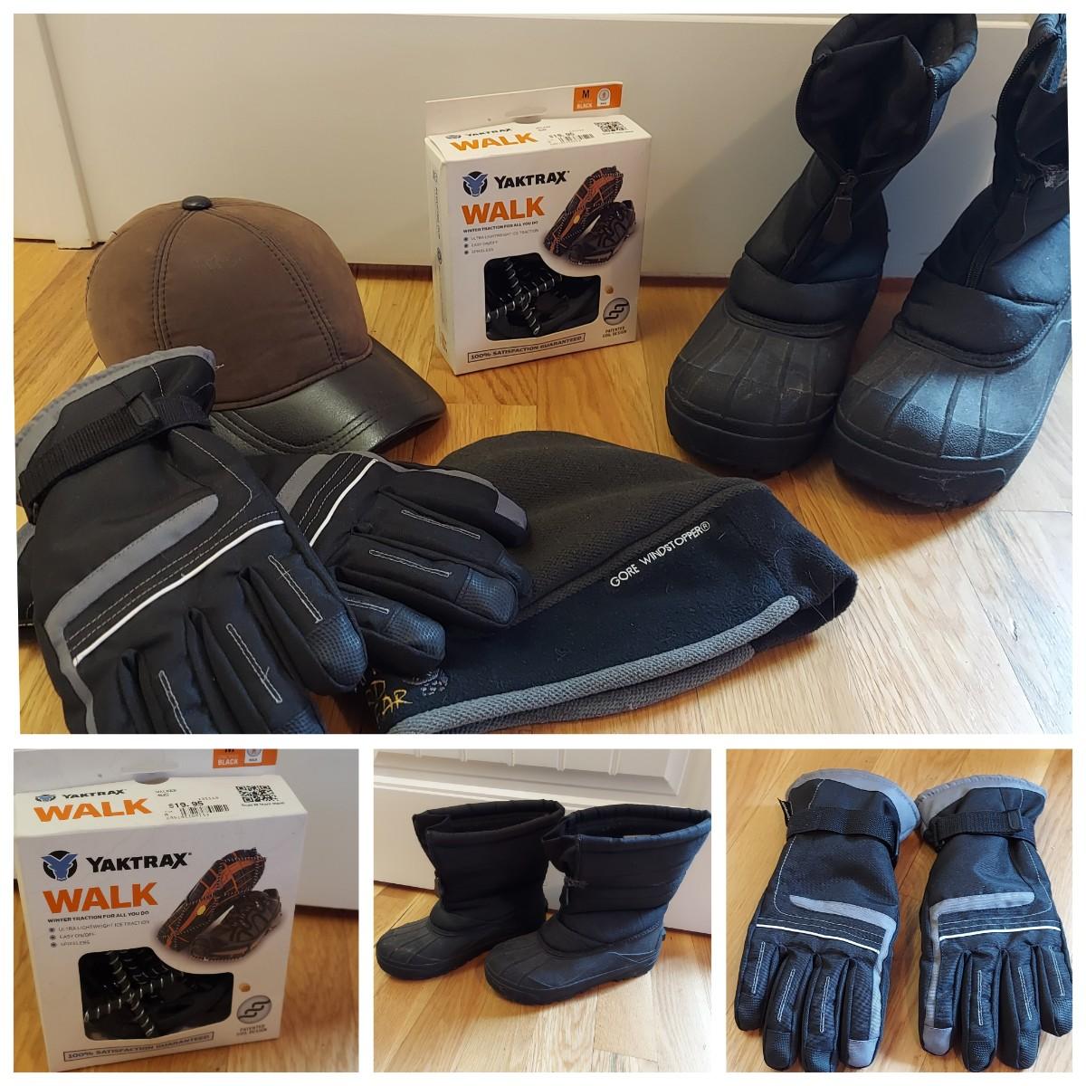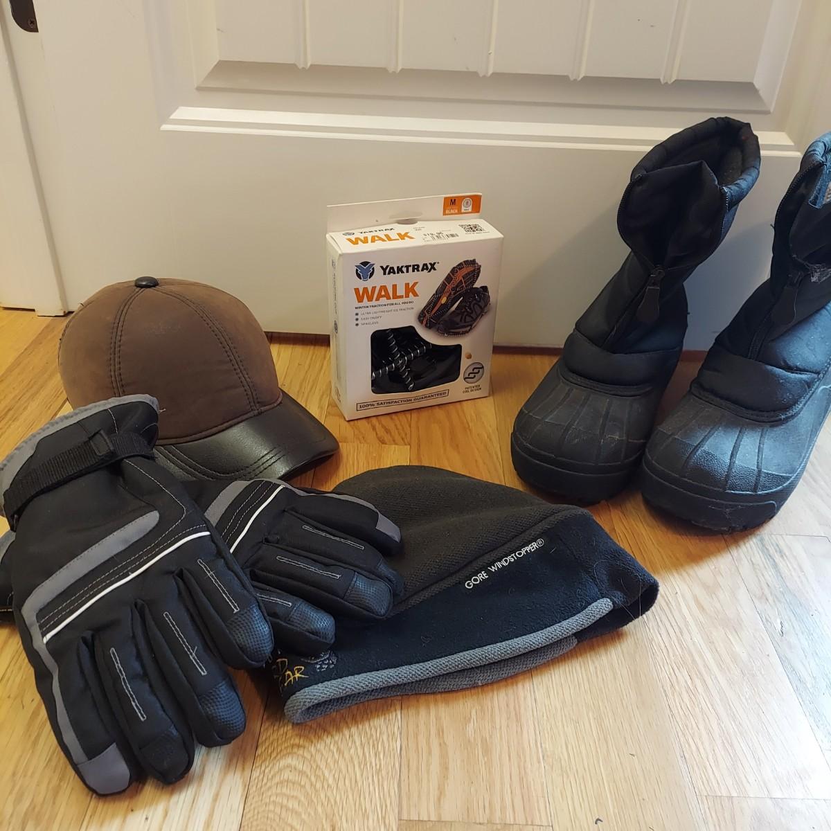 Lot includes size 9 Thermolite snow boots, a Mountain Hardware fleece hat, a pair of Yaktrax, a lined leather hat w/ ear flaps and a pair of gloves. Please see photos for details. Shipping available
