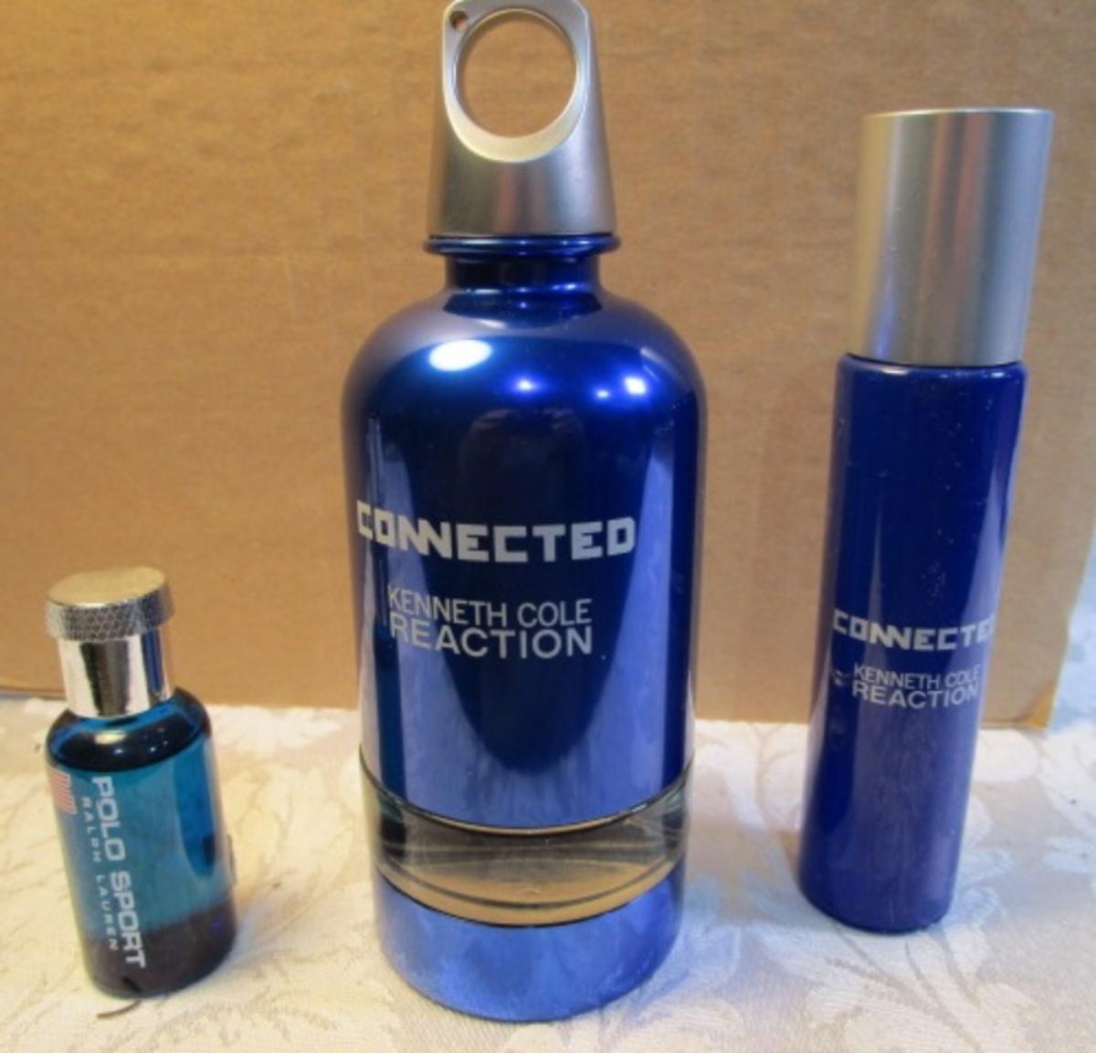 2 Kenneth Cole Reaction Connected (one is 1 fl. oz., one is 4.2 fl. oz. 3/4 full), Ralph Loren Polo Sport 11 ml , see pictures