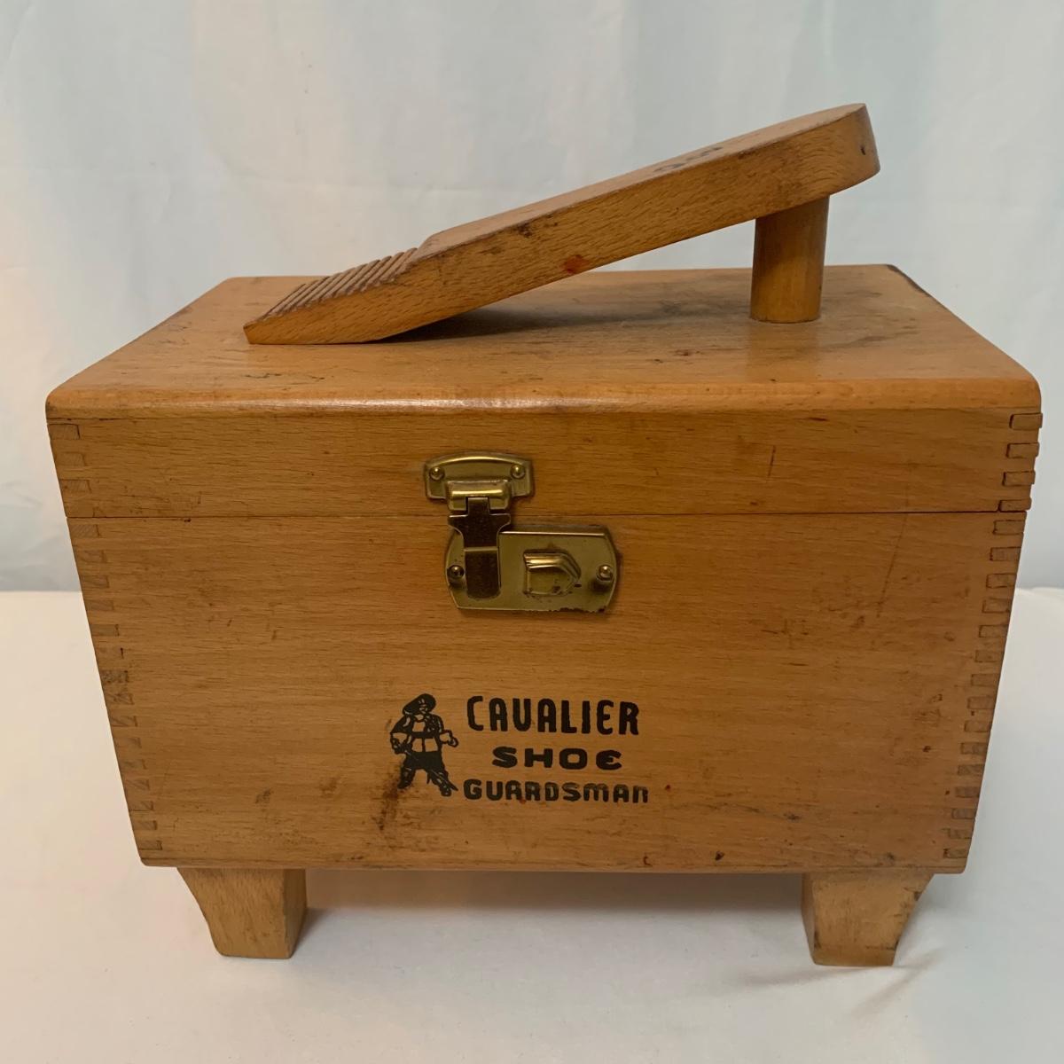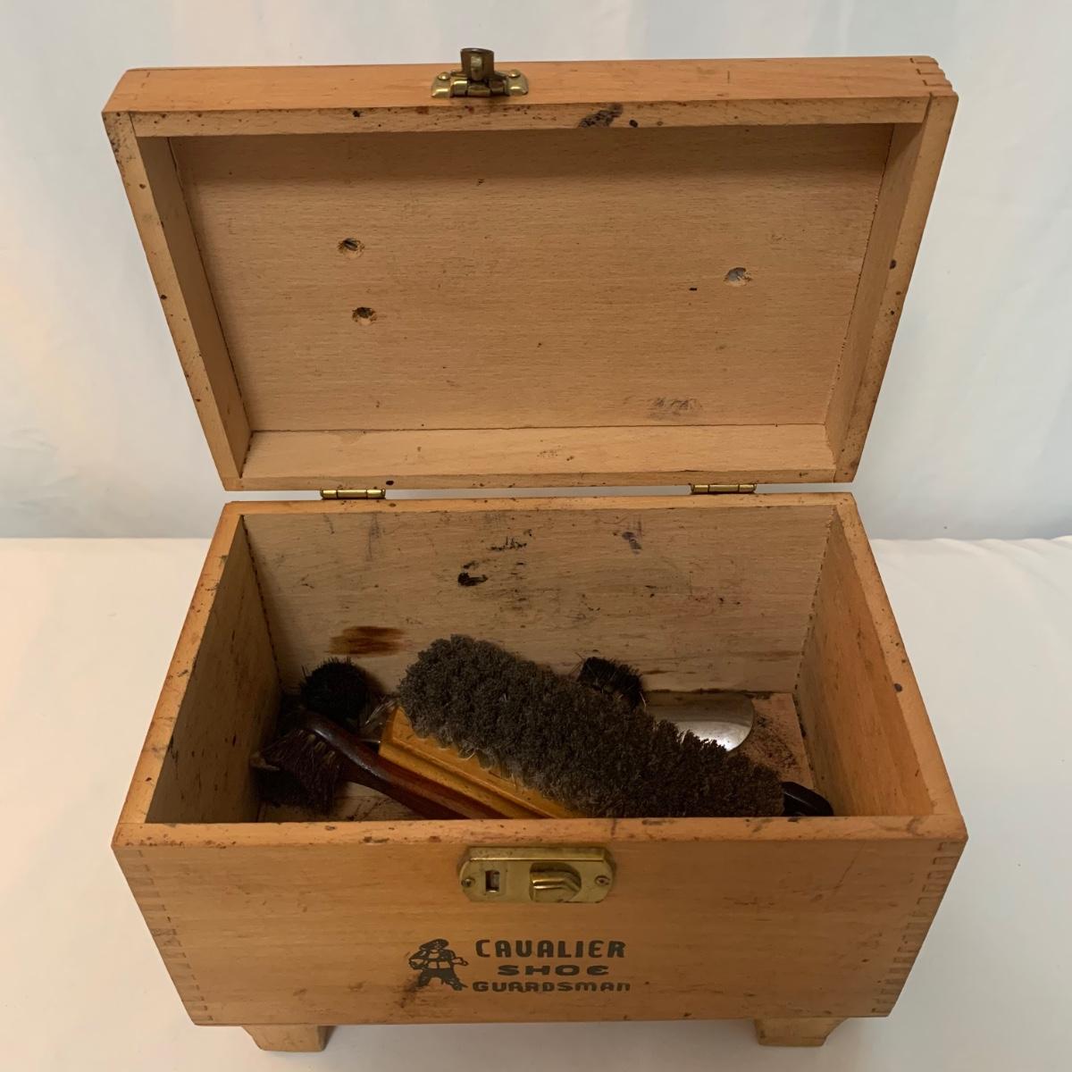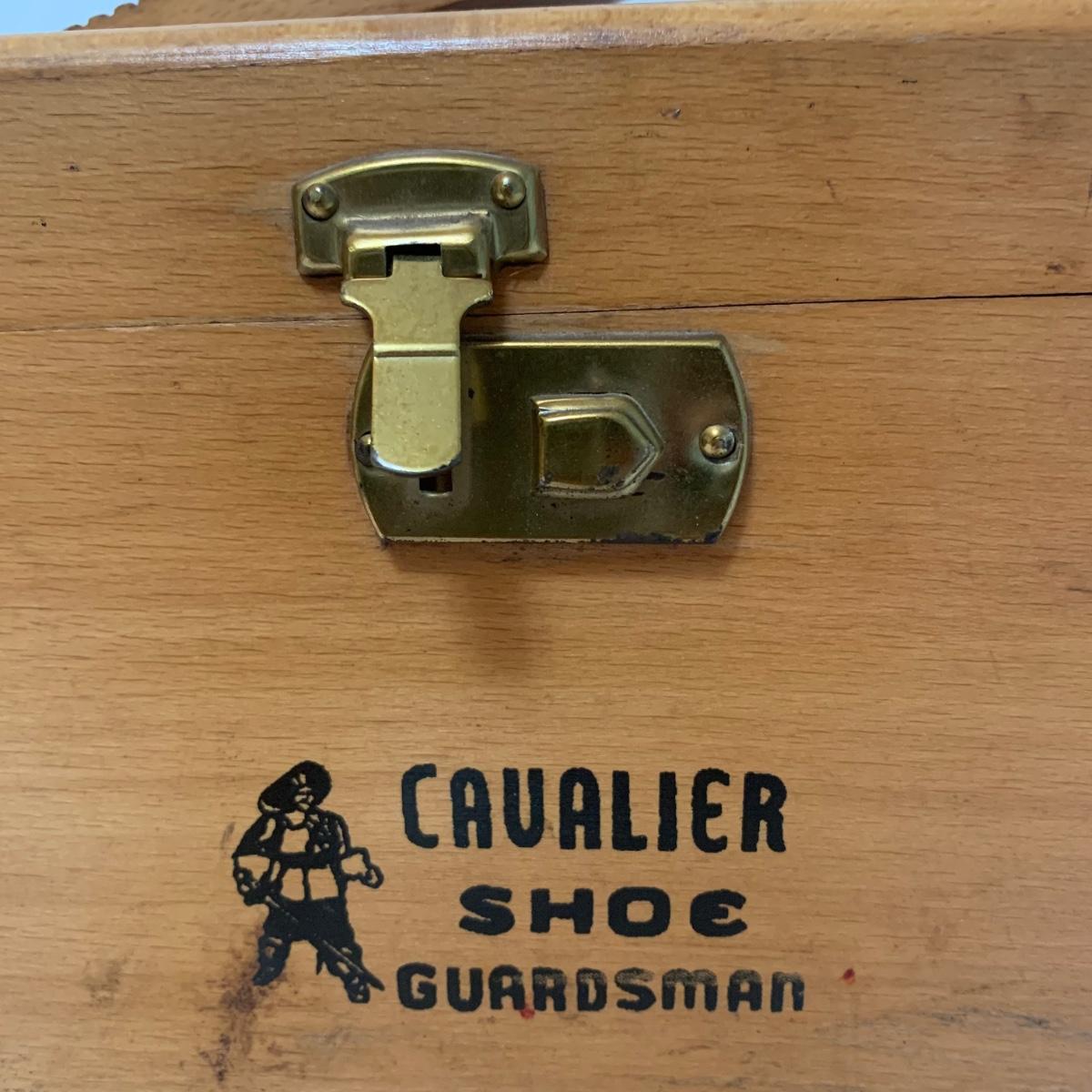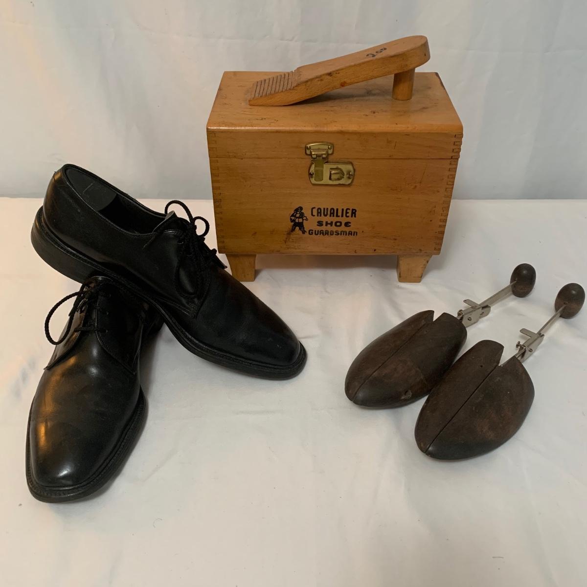Men’s size 10.5 Cordwainer Arch Preservers with two shoe trees, and Cavalier Shoe Guardsmen Valet box. Cordwainer shoes have signs of wear on the interior with minor exterior blemishes. They have been stored with shoe trees and appear to be in good condition. Shoe Guardsmen Valet box is crafted with dovetail joinery. Box’s hardware is fully functioning and in good condition. The box interior has expected staining from shoe polish and brushes. Box contains three brushes and shoe horn. Wood shoe trees are in good condition and fully functional. Shipping available.